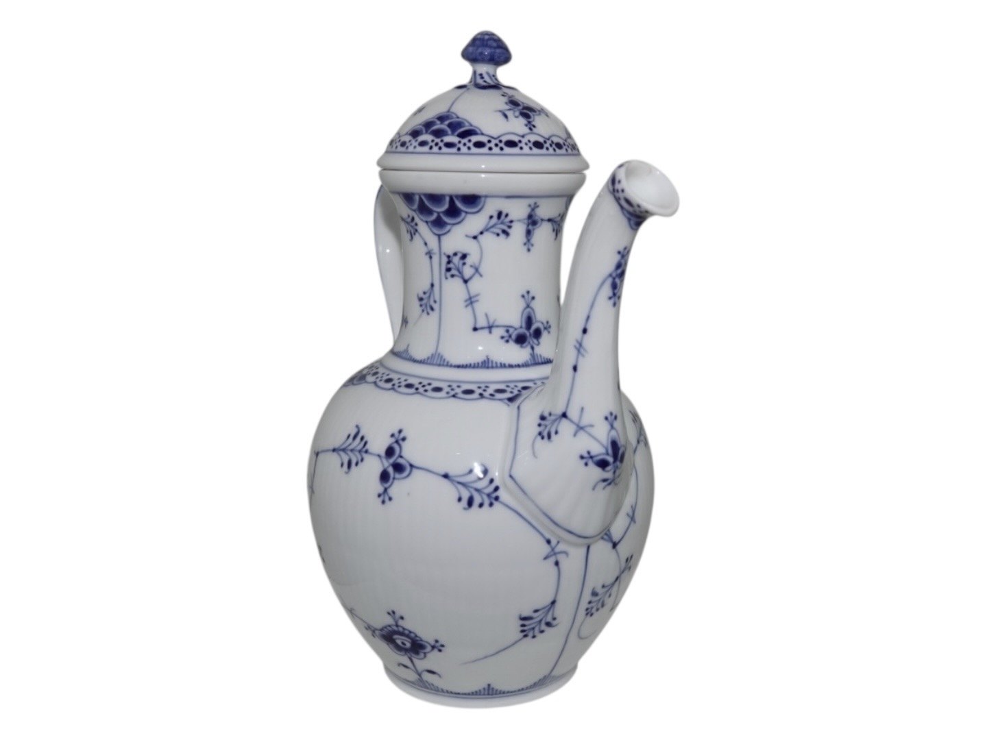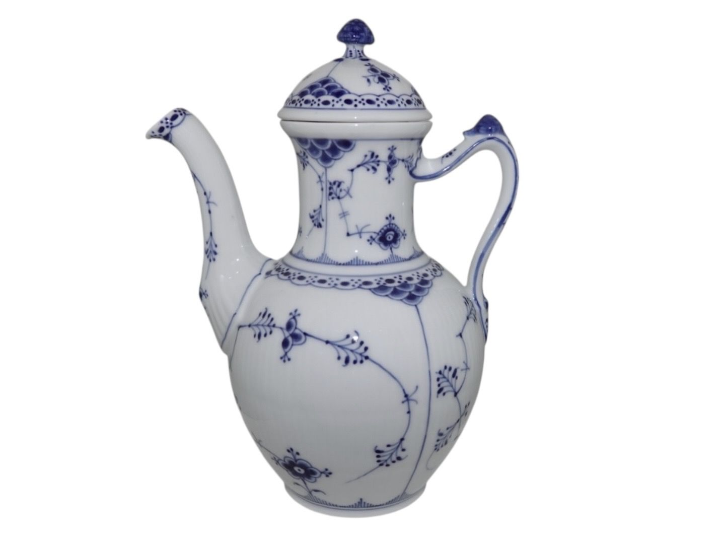 Royal Copenhagen Musselmalet Halvblonde, kaffekande.Af fabriksmærket kan det udledes, at kaffekanden er produceret i mellem 1898 og 1923 men låget er nyere.