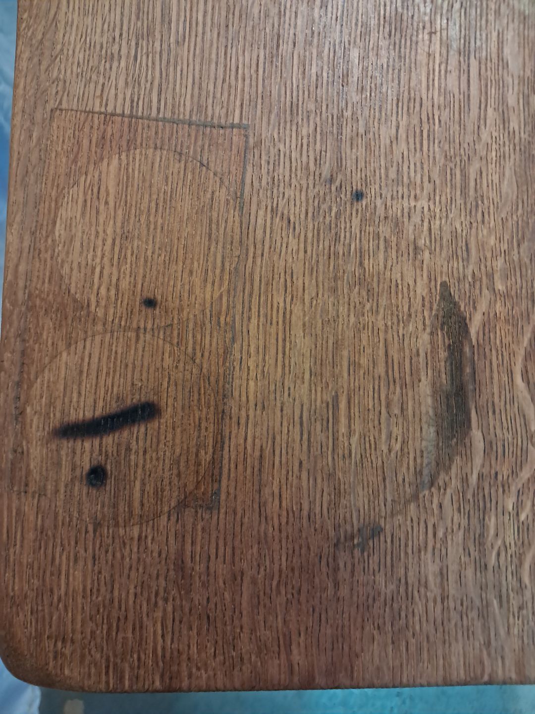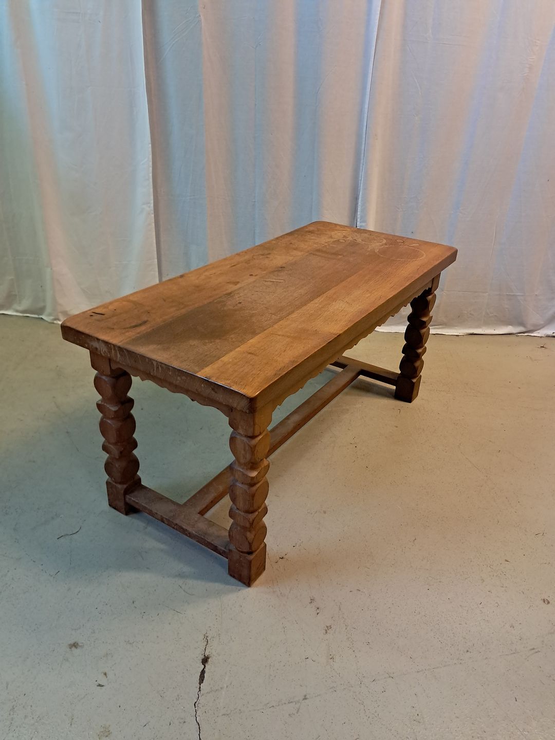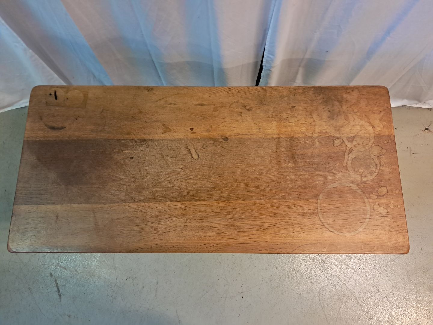 Sofabord i massivt egetræ, fra 1980erne.Det har brugsspor og et brændemærke.