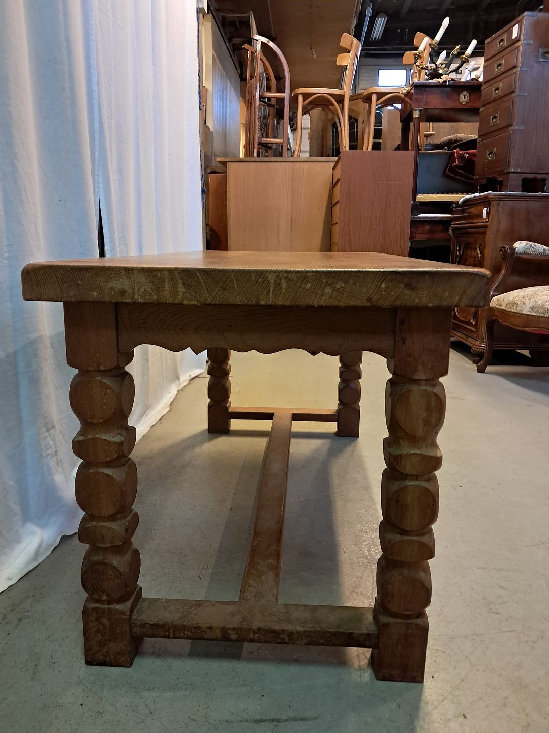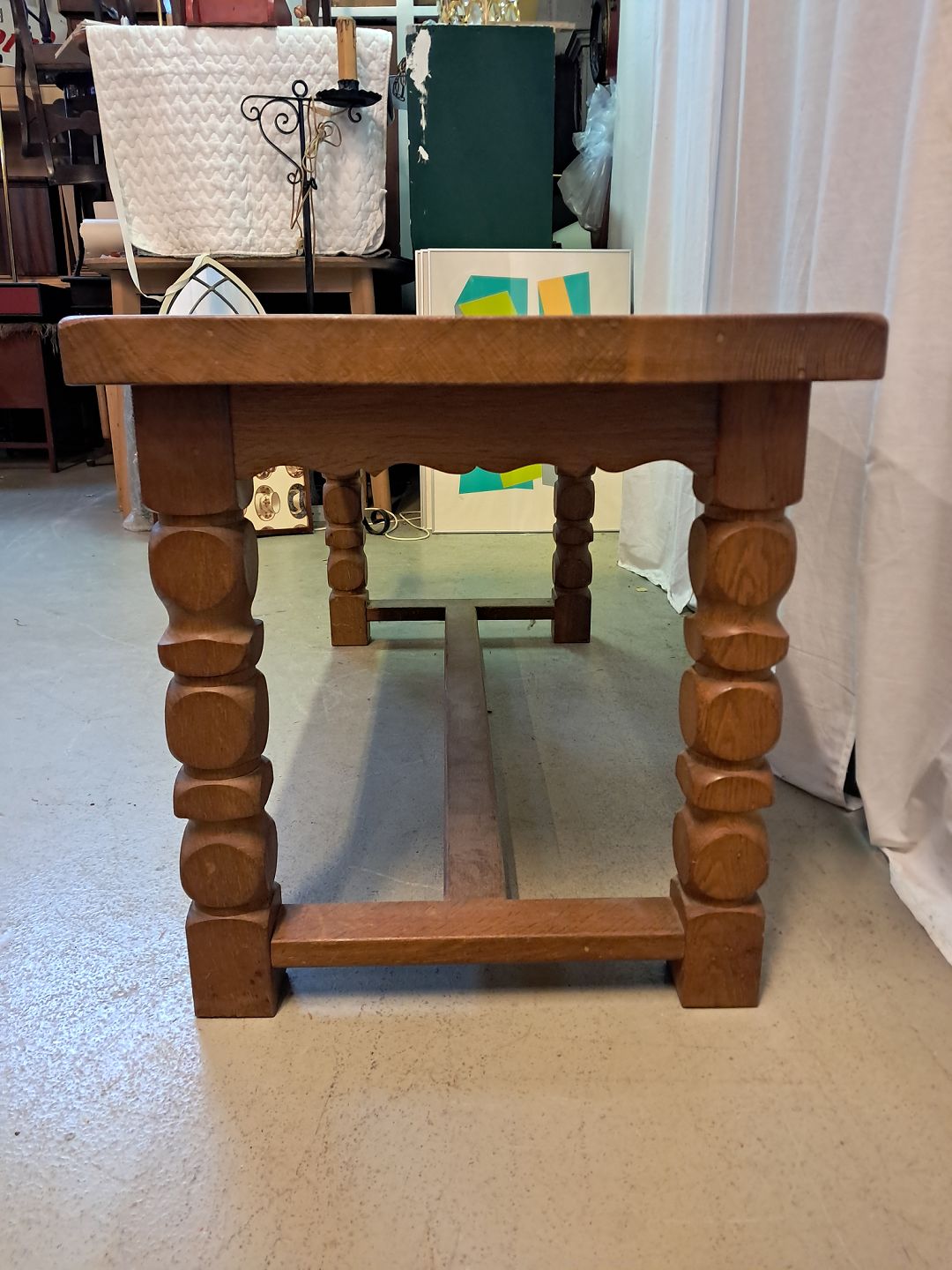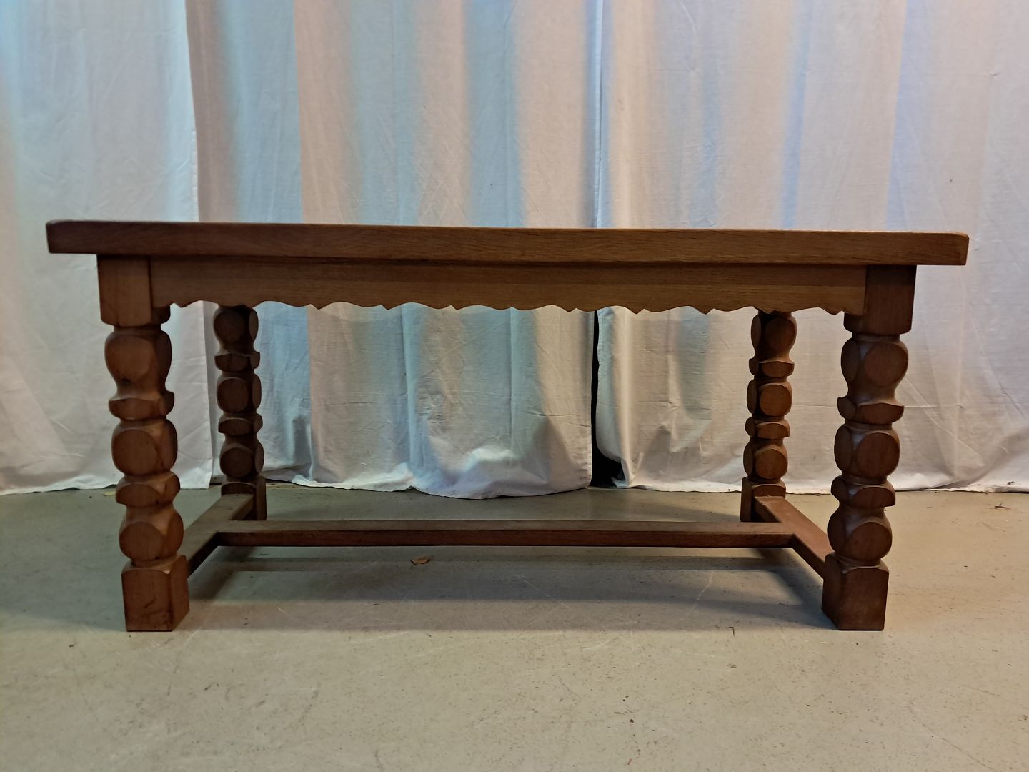 Sofabord i massivt egetræ, fra 1980erne.Det har brugsspor og et brændemærke.