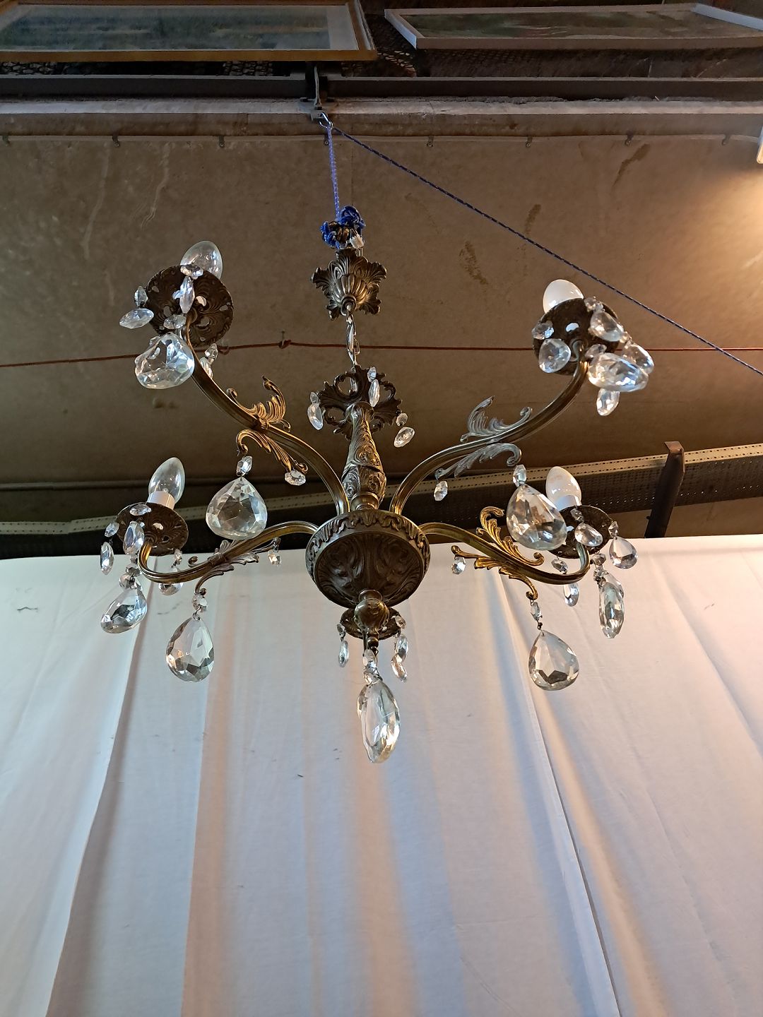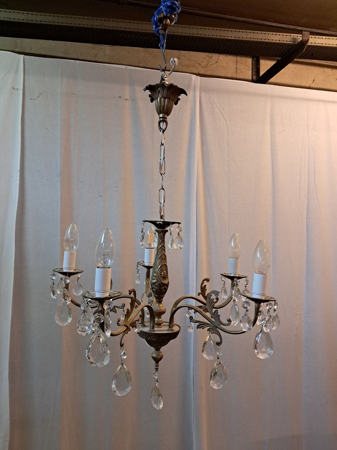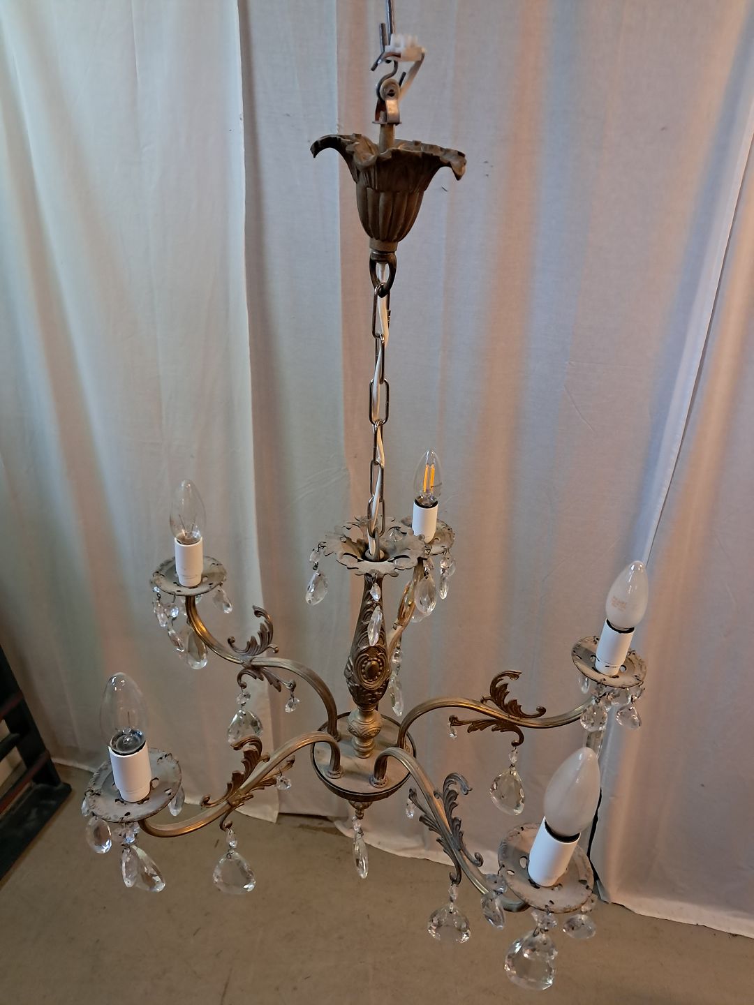 Lysekrone i metal med glasprismer, fra 1950erne.Den har brugsspor.