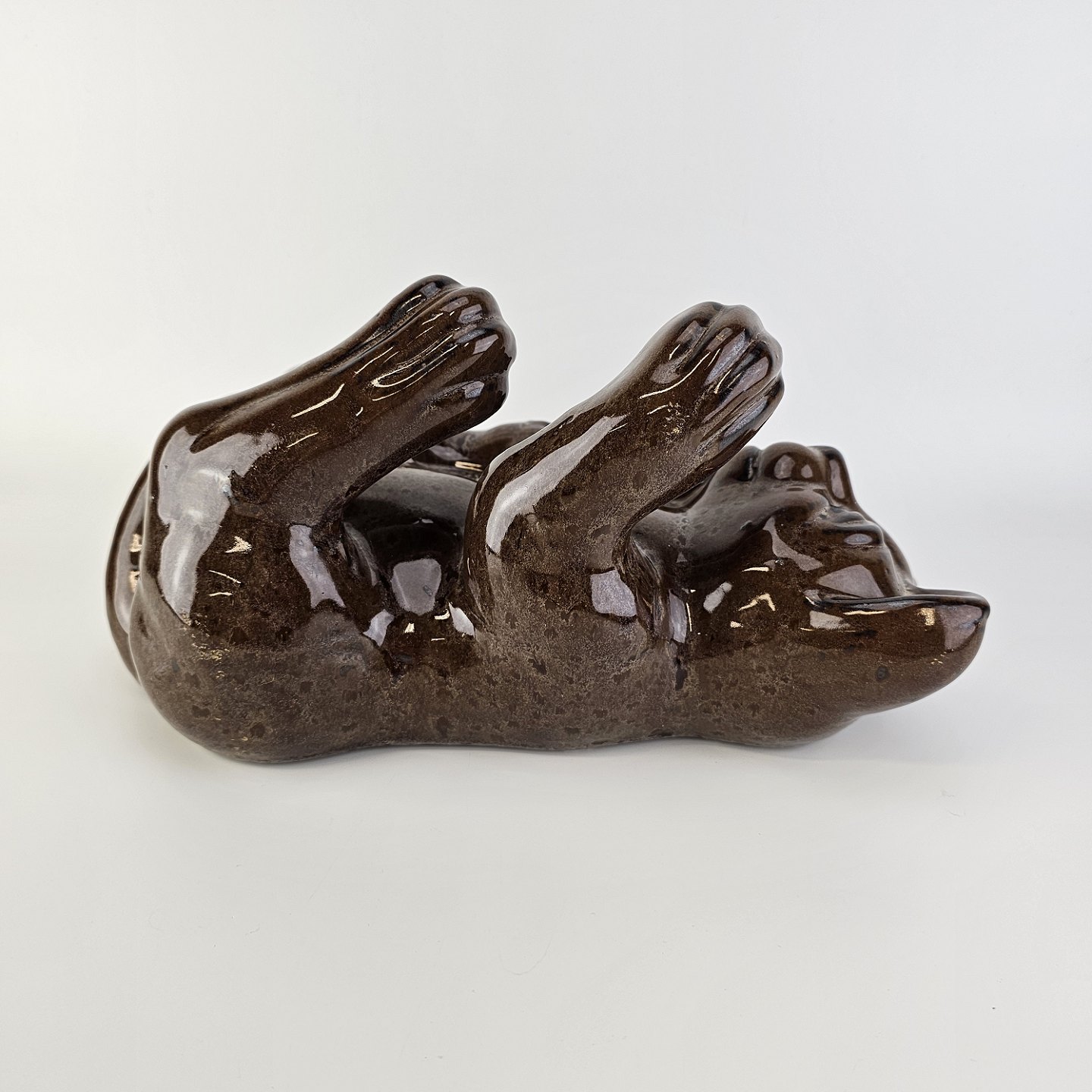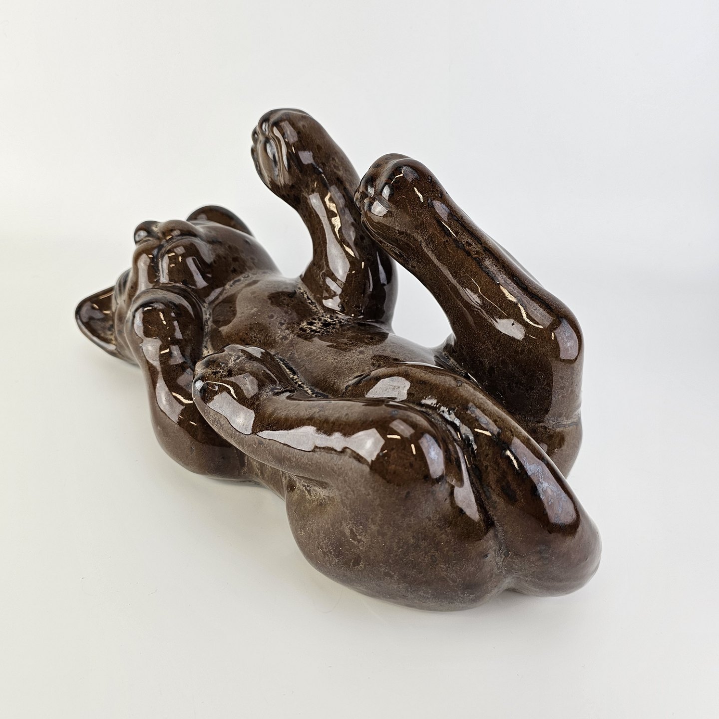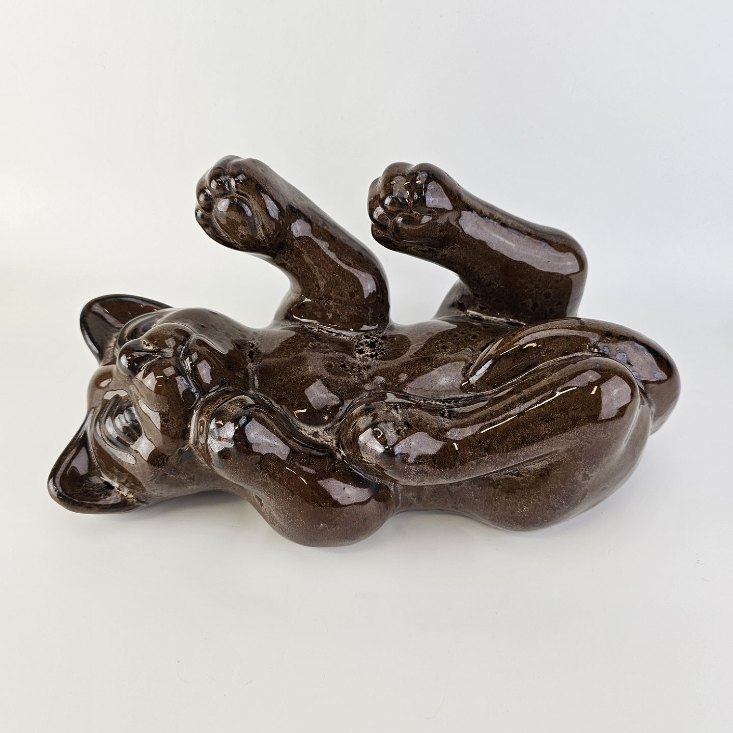 Figur i brunt glaseret lertøj med motiv af en kat som ligger på ryggenProducent ukendt
