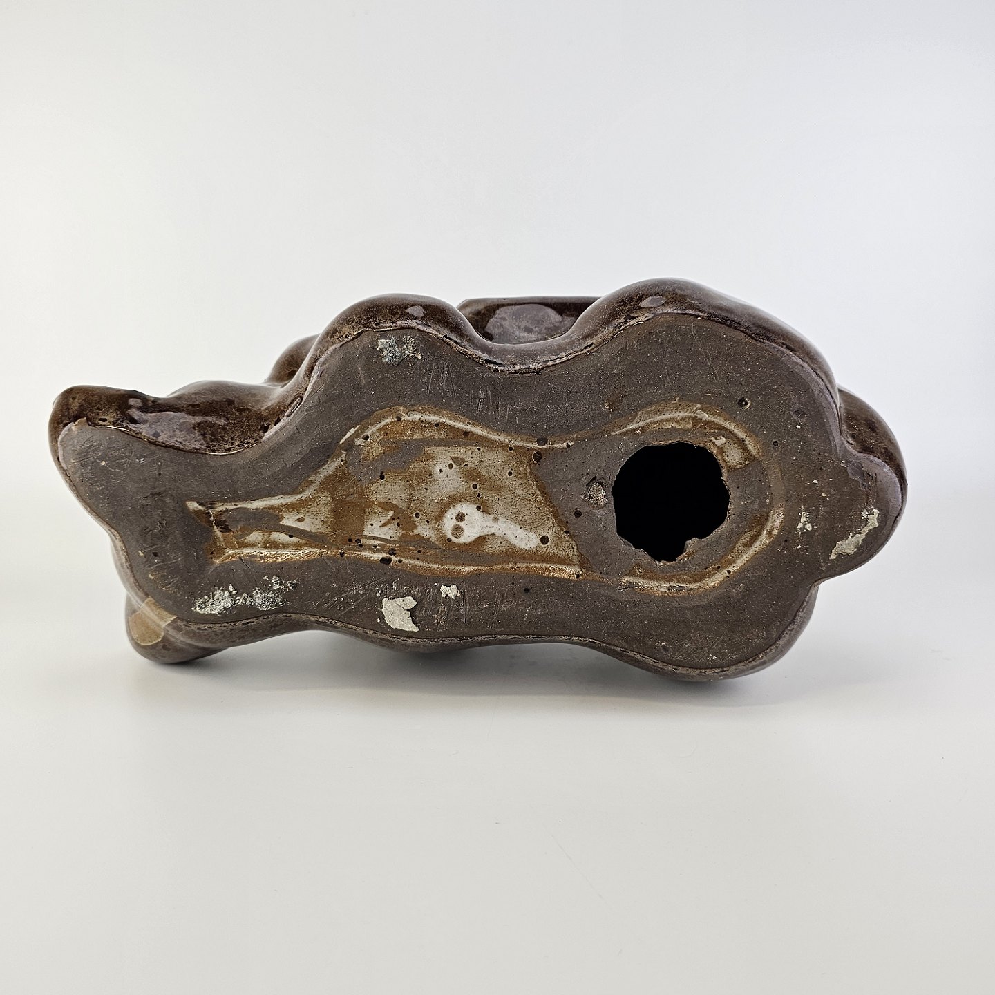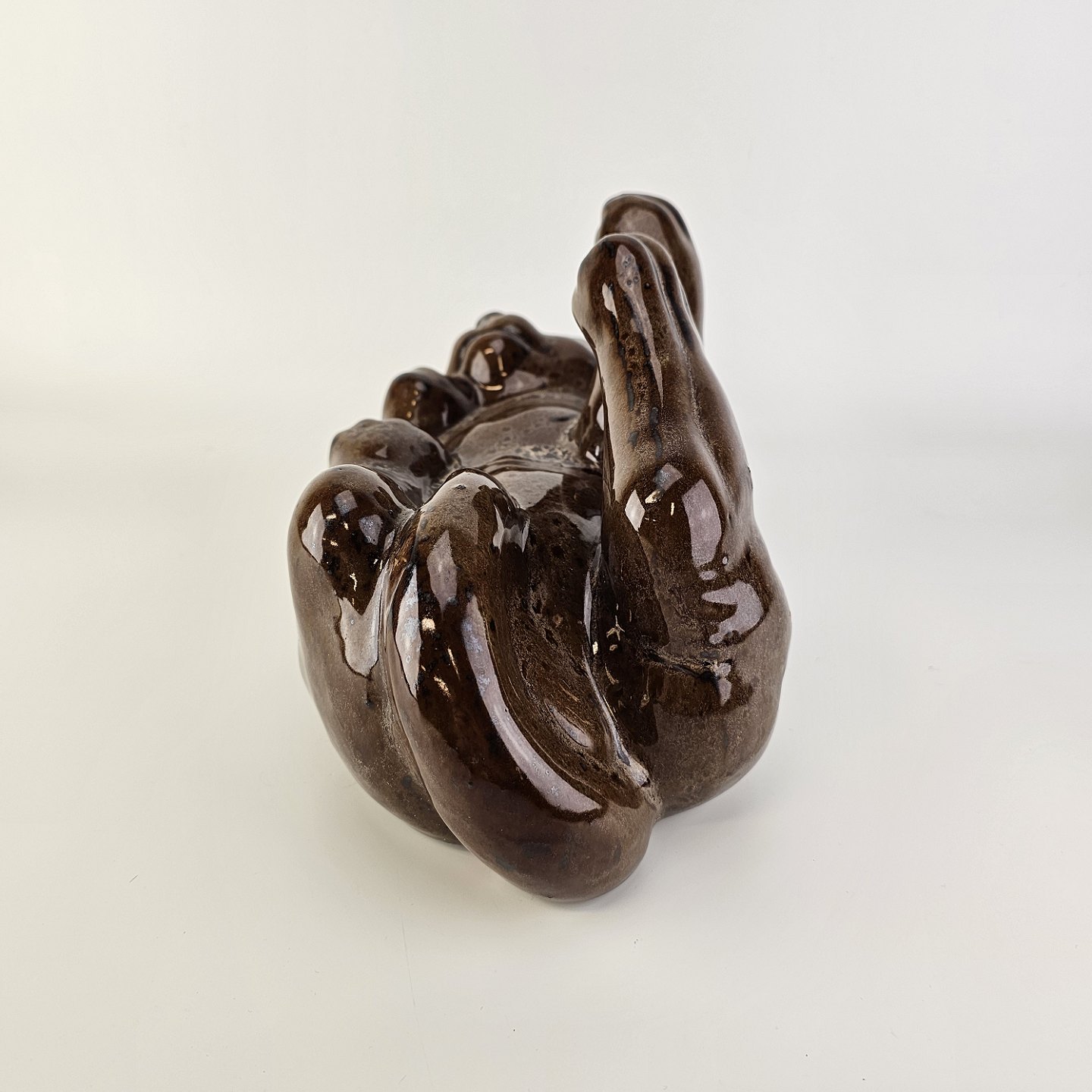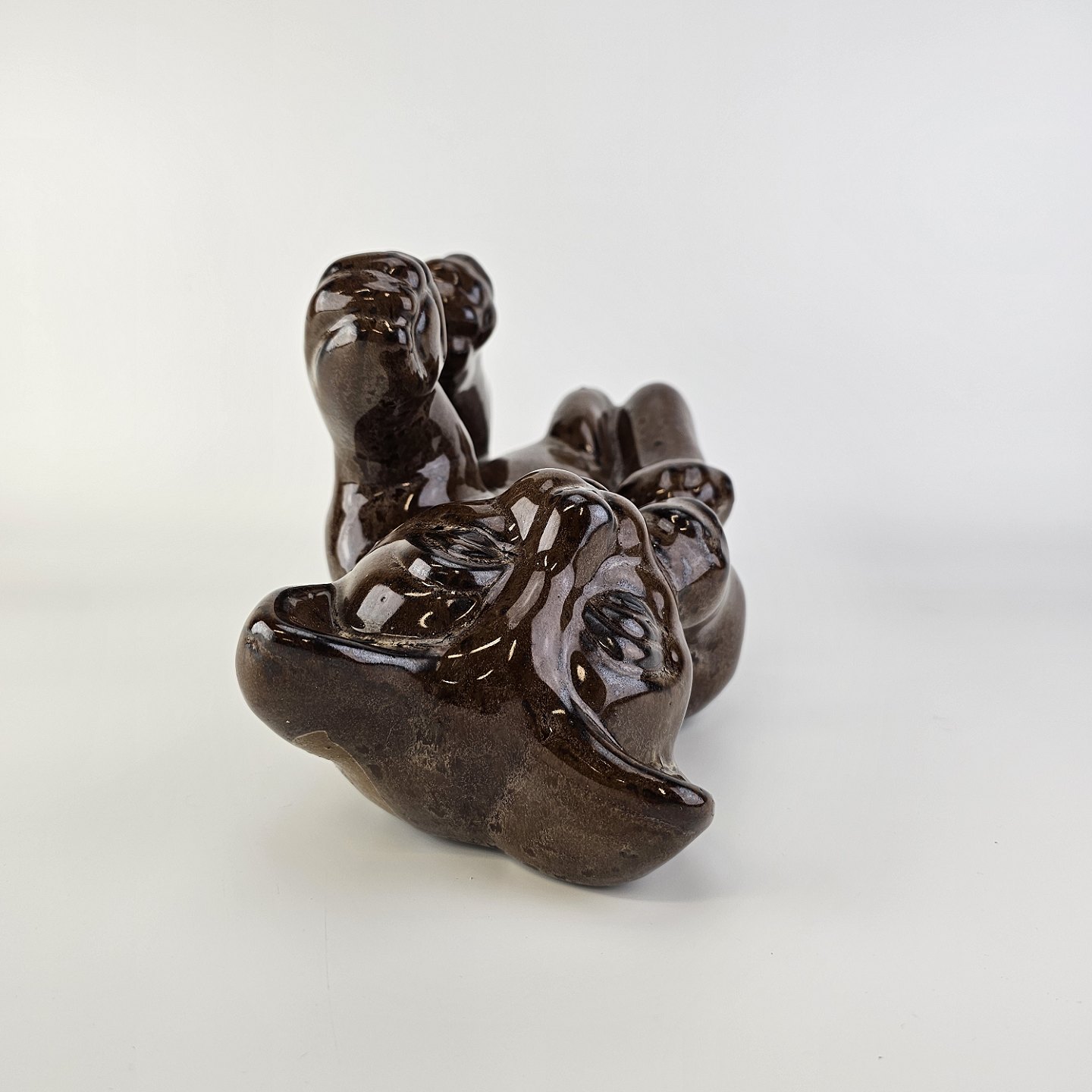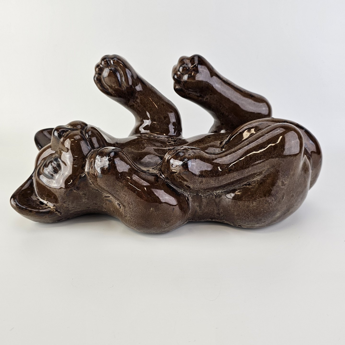 Figur i brunt glaseret lertøj med motiv af en kat som ligger på ryggenProducent ukendt