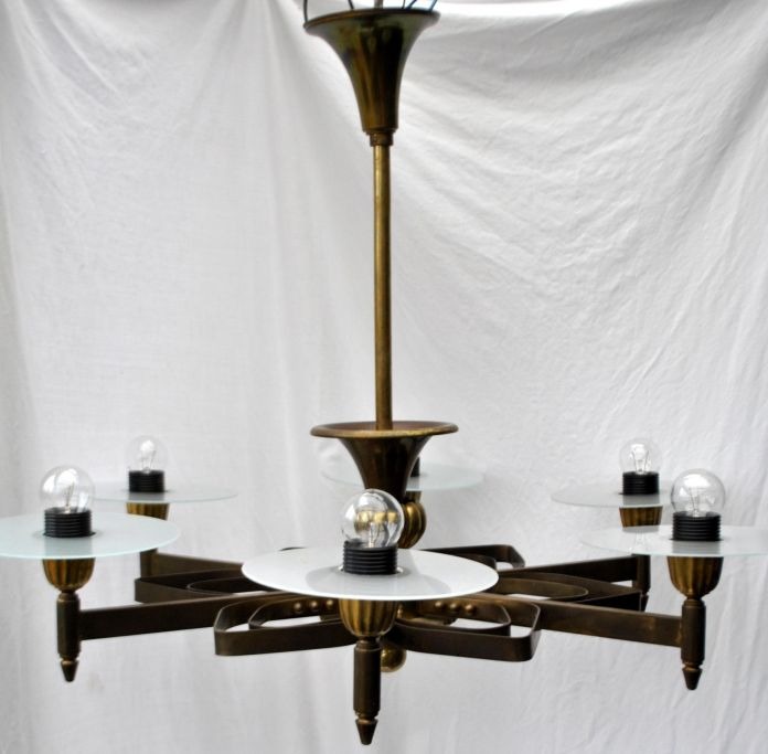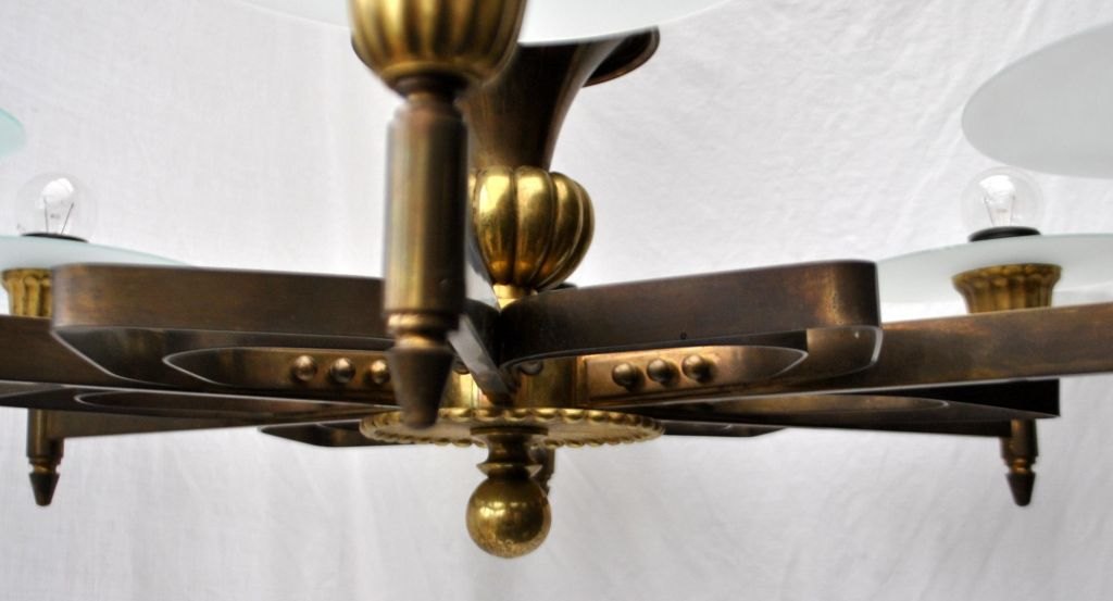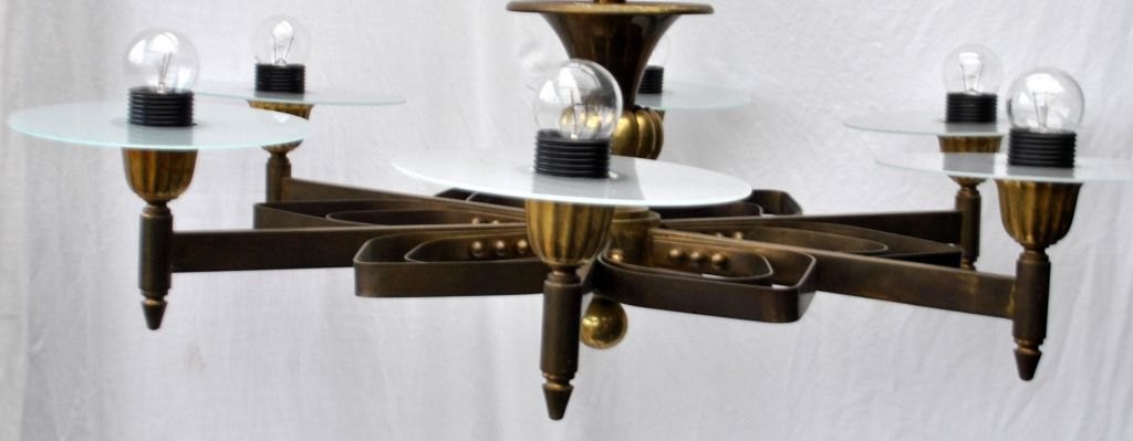 Dänische Funkis-Deckenleuchte aus Bronze, ca. 1930. Mit 6 Leuchtarmen. Höhe: 60 cm. Durchmesser: 80 cm.Einwandfreier Zustand!