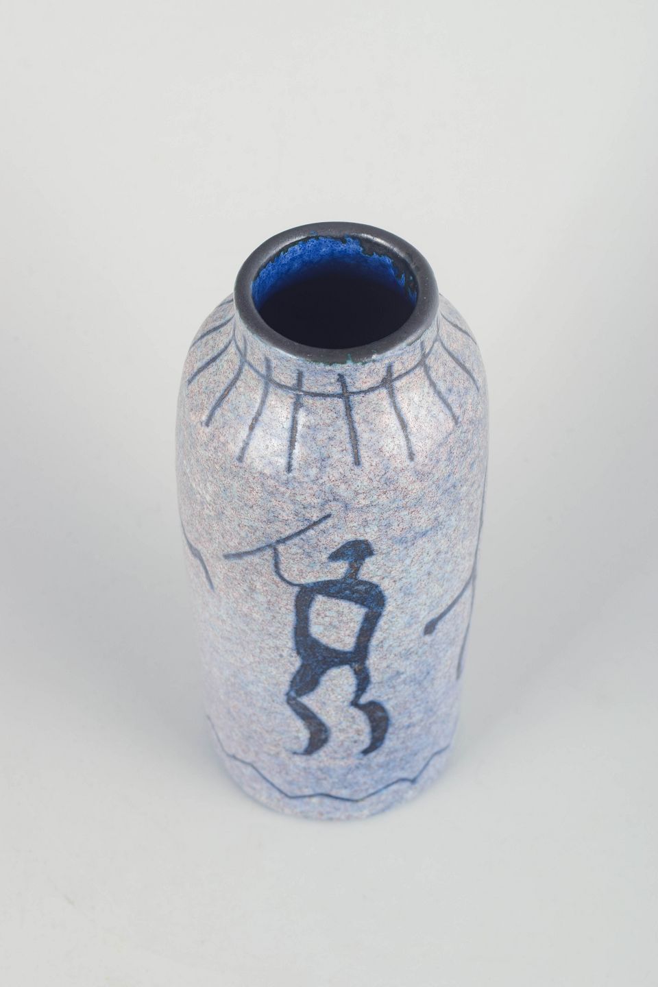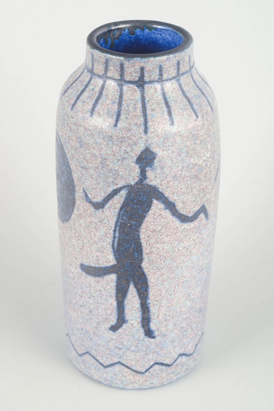Hånddrejet keramikvase med reliefdekoration af primitive figurer i grå og mørkeblå glasur. Et karakteristisk stykke svensk studiokeramik med kunstnerisk og figurativt udtryk.
