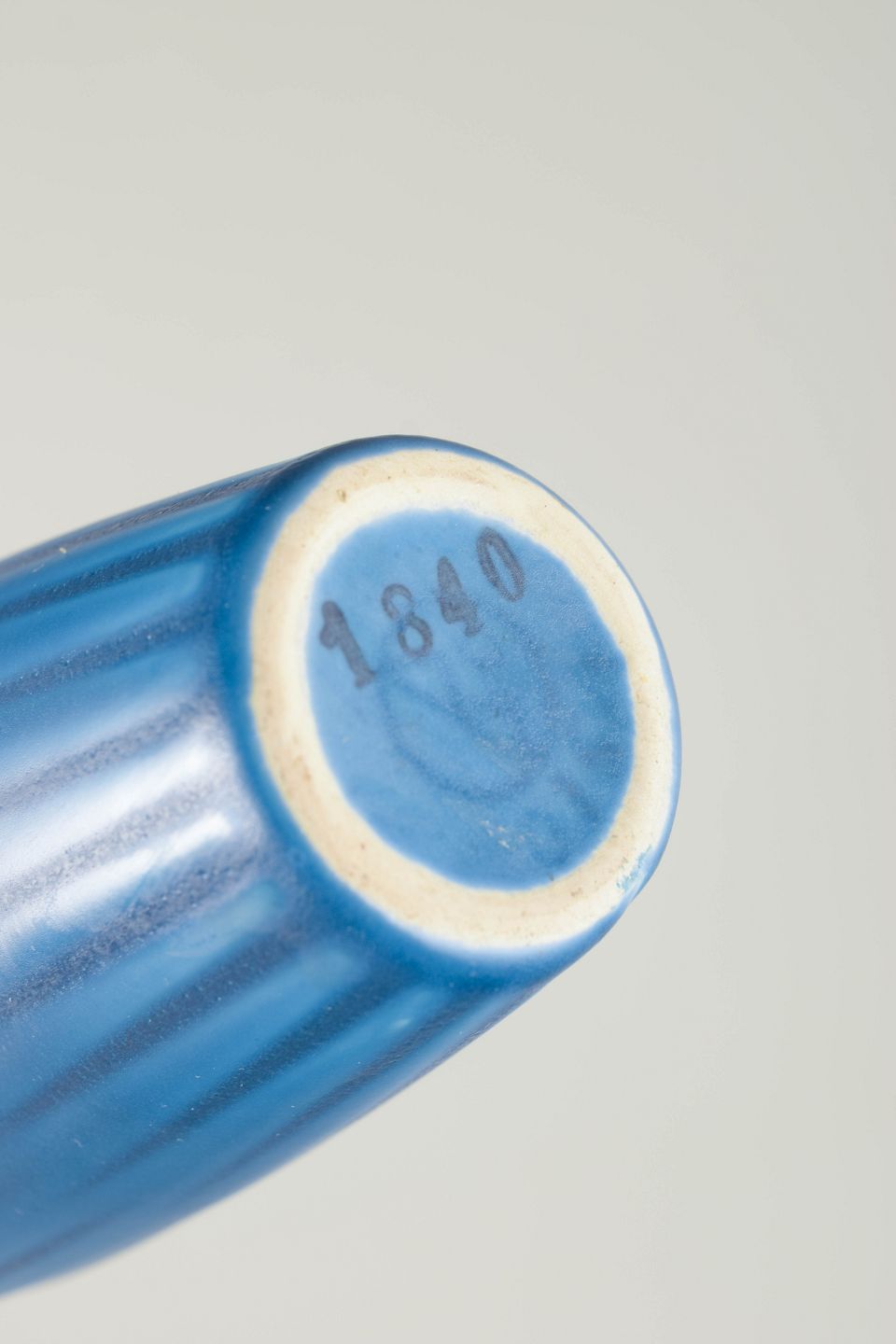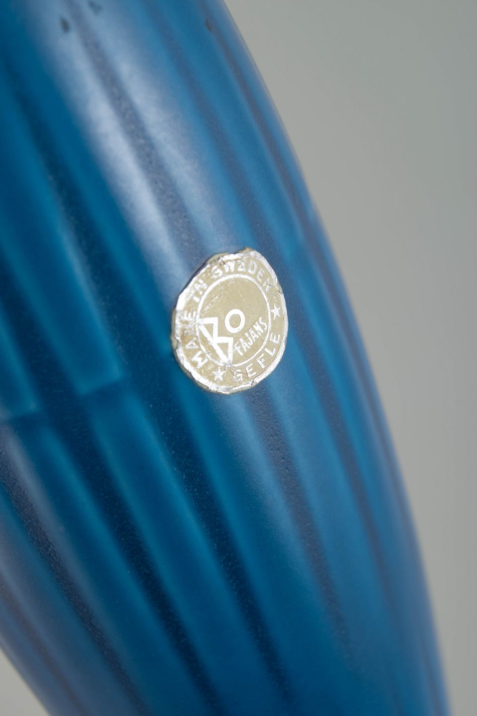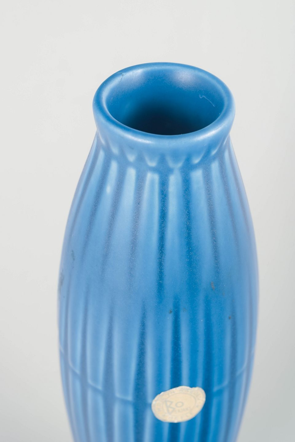 Elegant, riflet vase i blå glasur med mat overflade og stram, funktionalistisk form. Originalt mærkat “Bo Fajans Gefle, Made in Sweden” bevaret på forsiden.