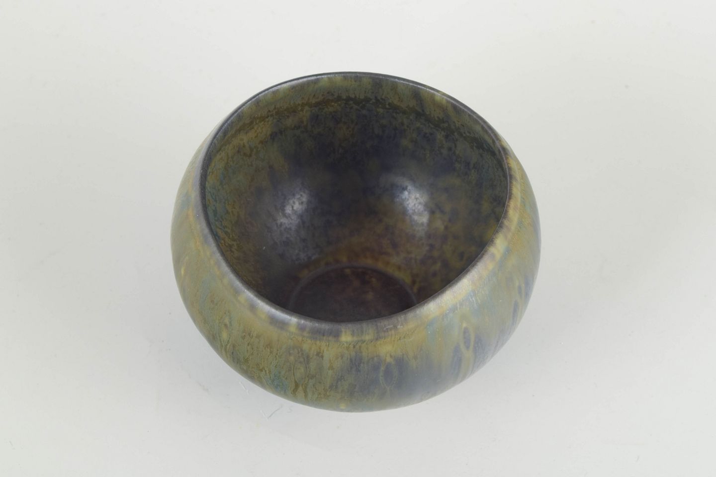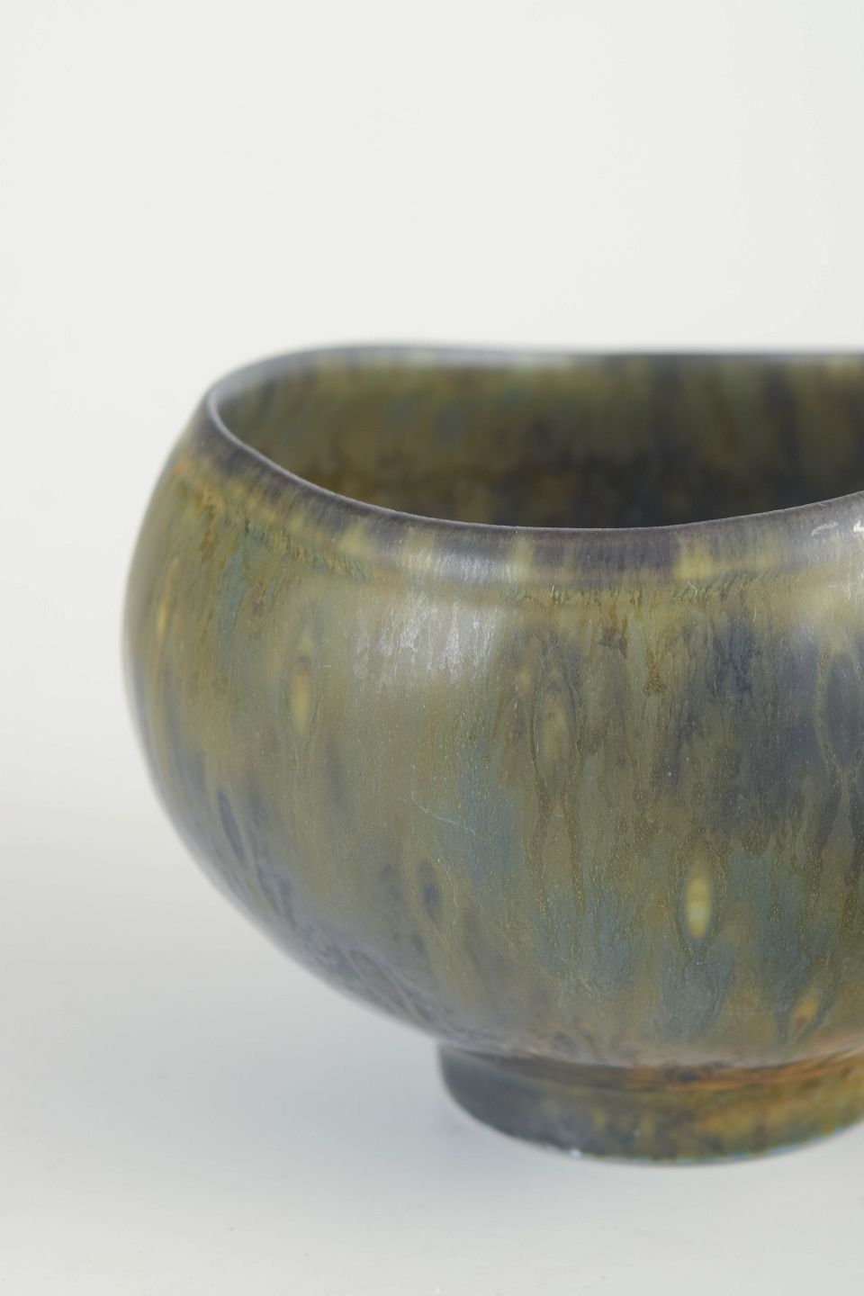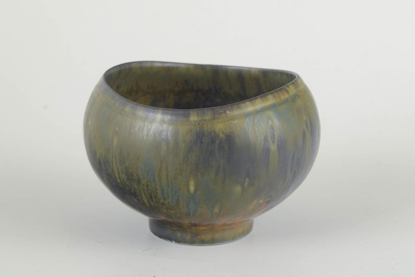 Hånddrejet stentøjsskål med afrundet, asymmetrisk form og levende harepelsglasur i grønne, blå og brunlige nuancer. Et elegant eksempel på Nylunds organiske formsprog og hans raffinerede eksperimenter med glasurer hos Rörstrand.