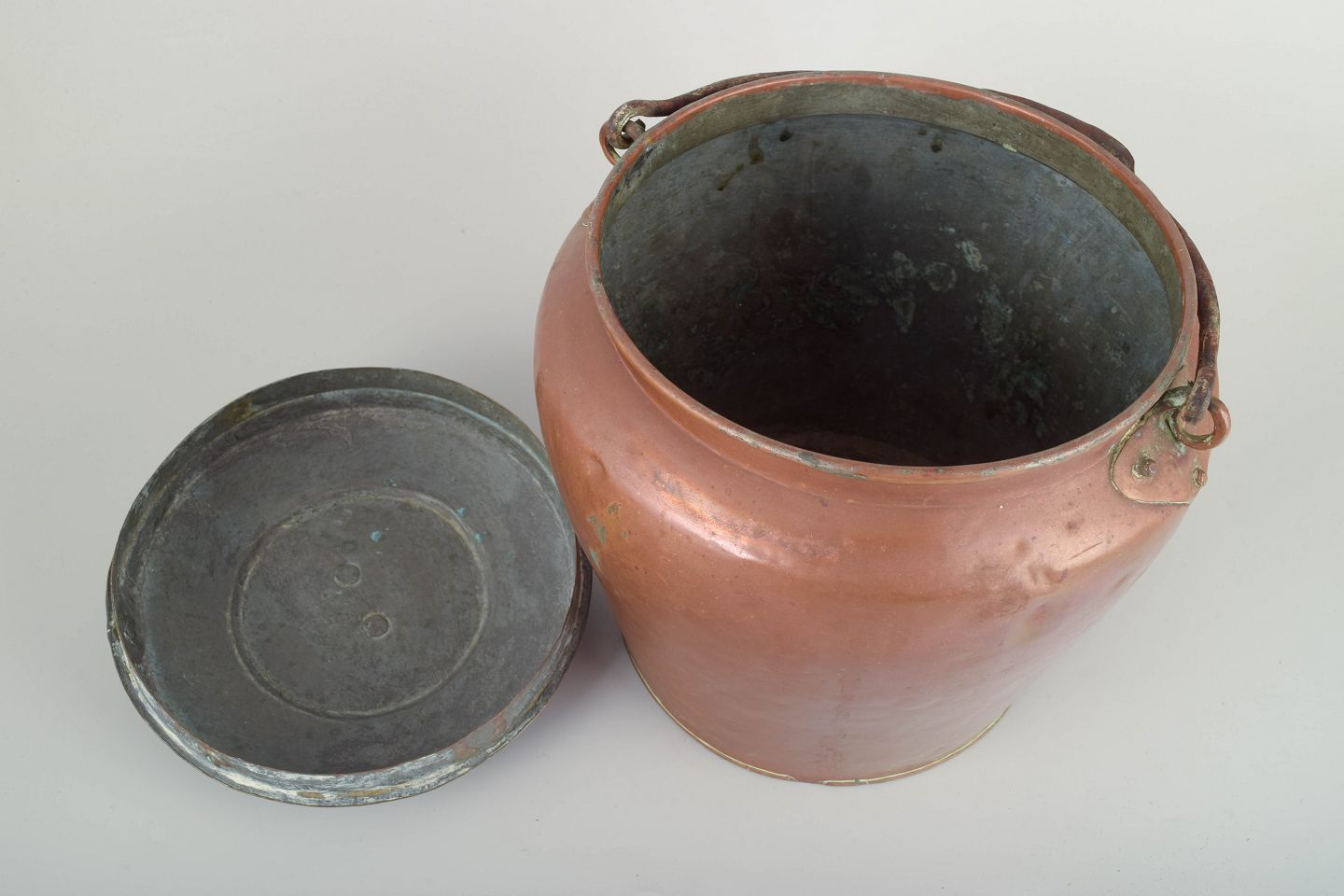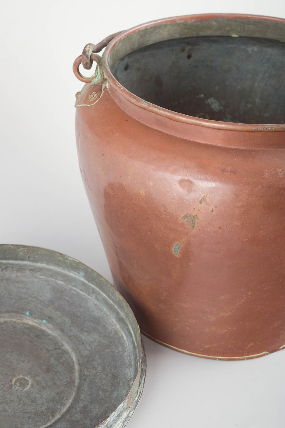 Dansk barselsspand, 1800-tallet.Kobber barselsspand med låg og buet hank. Traditionelt anvendt i danske husholdninger i 18–19. århundrede, ofte som barsels- eller husholdningsspand. Viser smuk, varm patina og brugsspor fra alder.