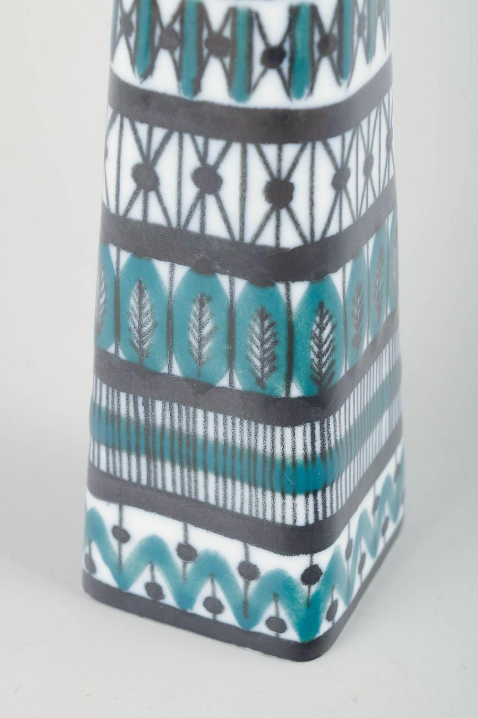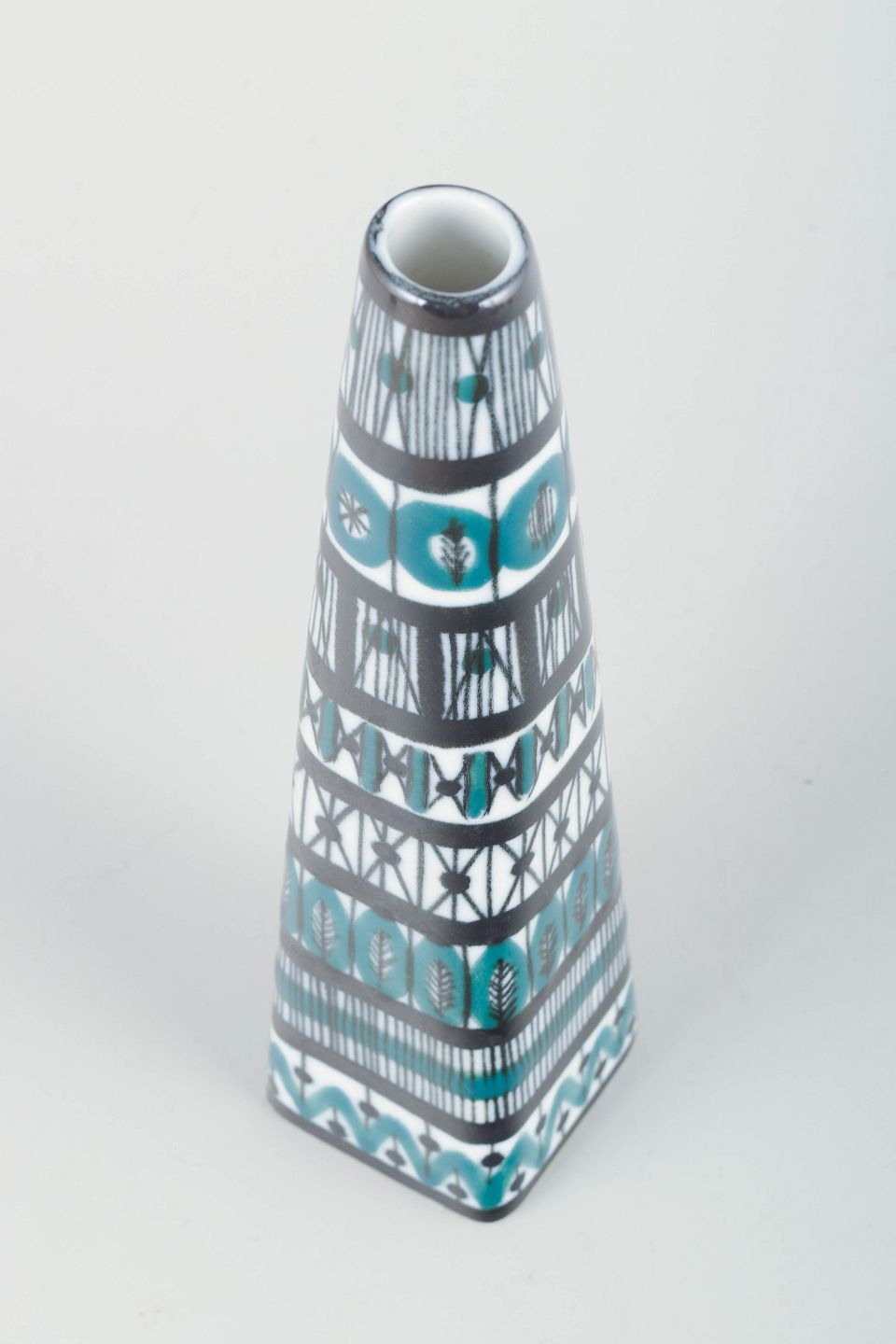 Håndmalet kegleformet vase i fajance med geometrisk dekoration i turkise, sorte og hvide nuancer. Et karakteristisk eksempel på svensk 1950/60’er design med tydelig modernistisk formsprog.