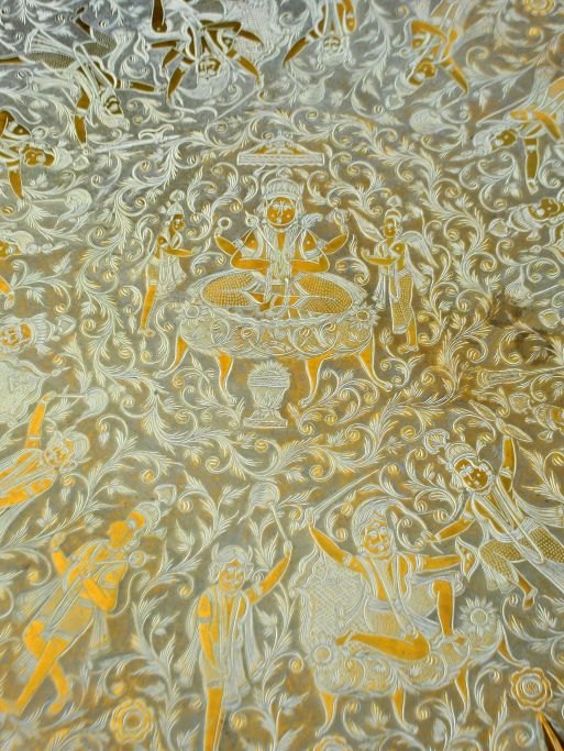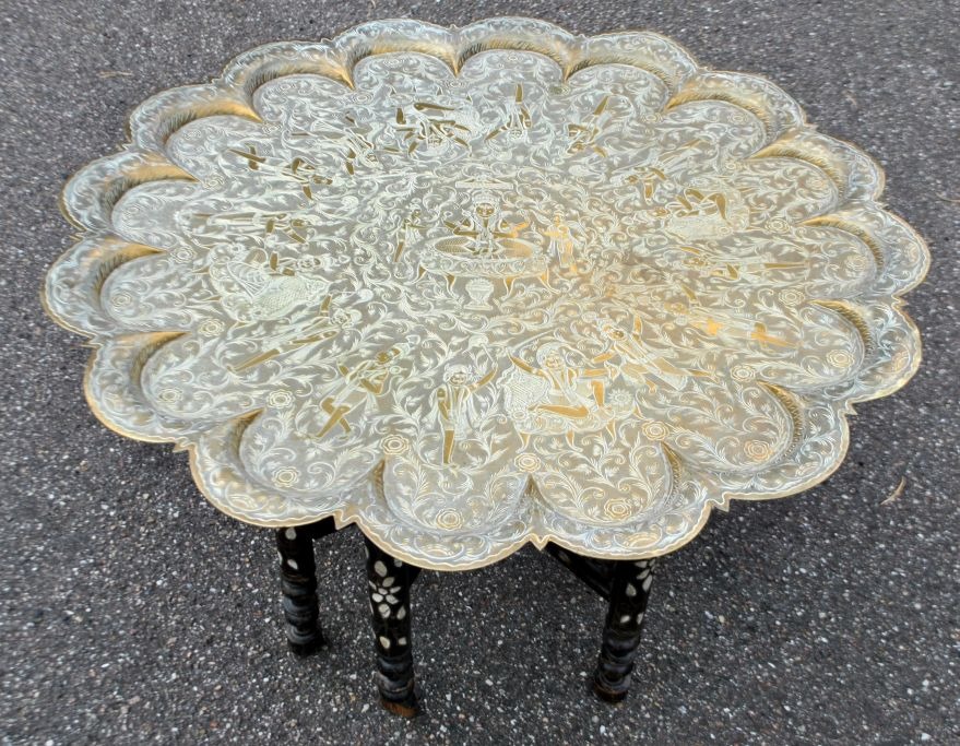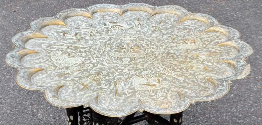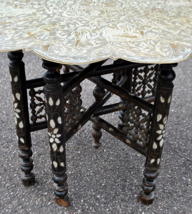 Arabischer Rauchtisch mit Messingplatte aus Indien, 19./20. Jahrhundert. Messingplatte mit Göttern verziert. Holzsockel mit Perlmutt-Intarsien. H.: 47,5 cm. Durchmesser: 77,5 cm.Bestellnummer: 28342