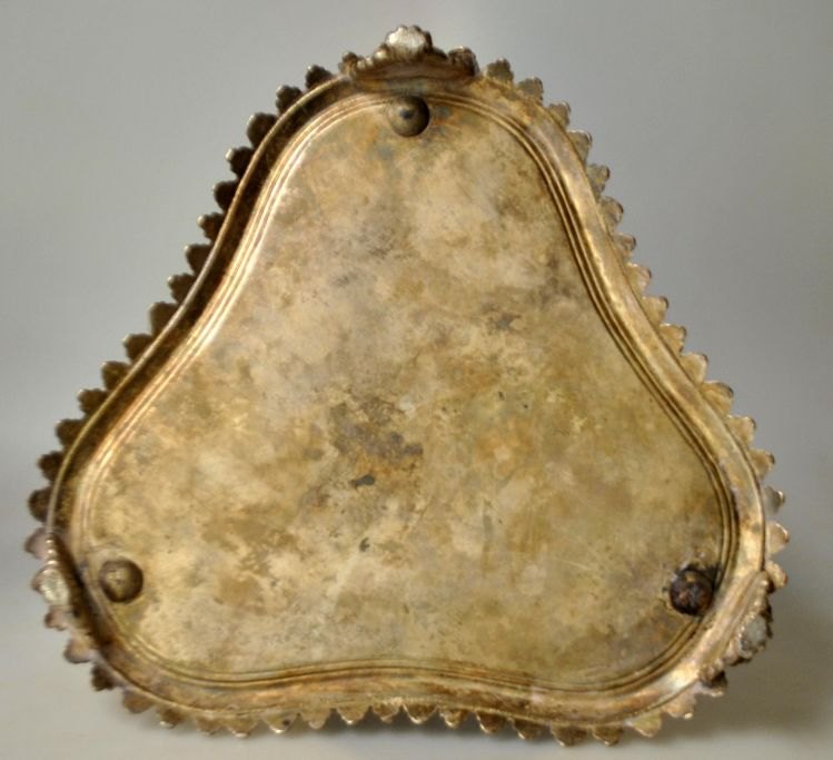 Englischer versilberter Weinhalter, 20. Jahrhundert. Dreieckige Form für drei Flaschen mit Halter. H.: 26 cm. B.: 25 cm.Bestellnummer: 28346