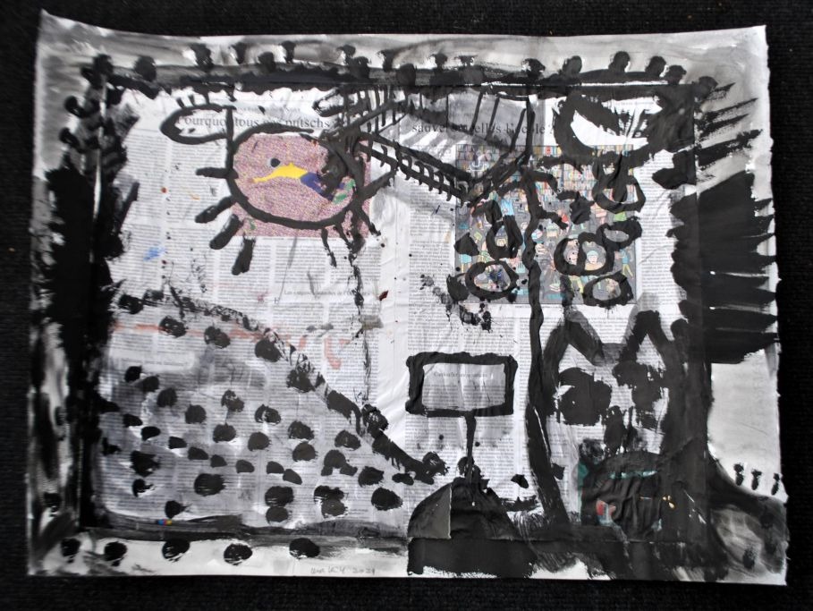Kühl, Lena (1950 -) Dänemark: Komposition, 2024. Collage mit Zeitungsausschnitten und Filzstift. Signiert: Lena Kühl 2024. H: 56 cm. B: 76 cm.Ungerahmt.