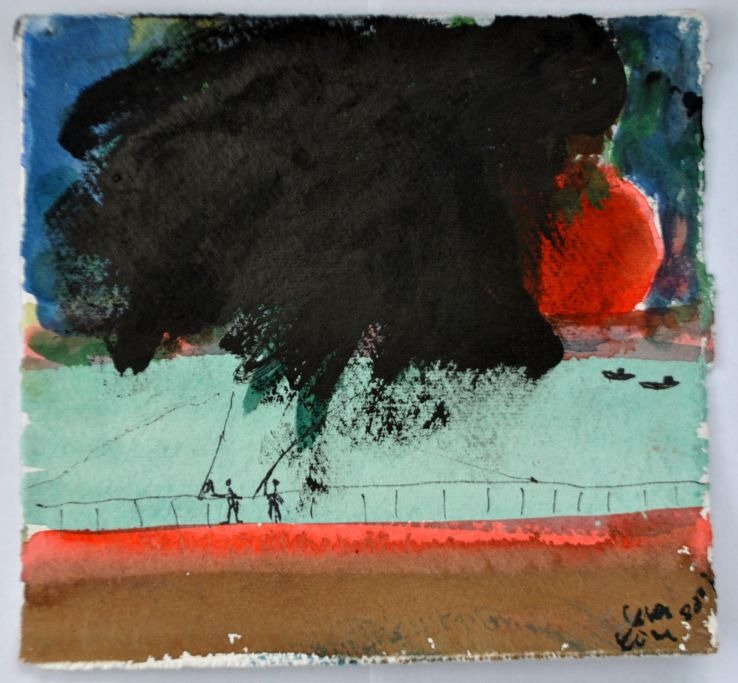 Kühl, Lena (1950 -) Dänemark: Fischer, 2001. Aquarell auf Papier. Signiert: Lena Kühl 2001. H: 18 cm. B: 19 cm.Ungerahmt.