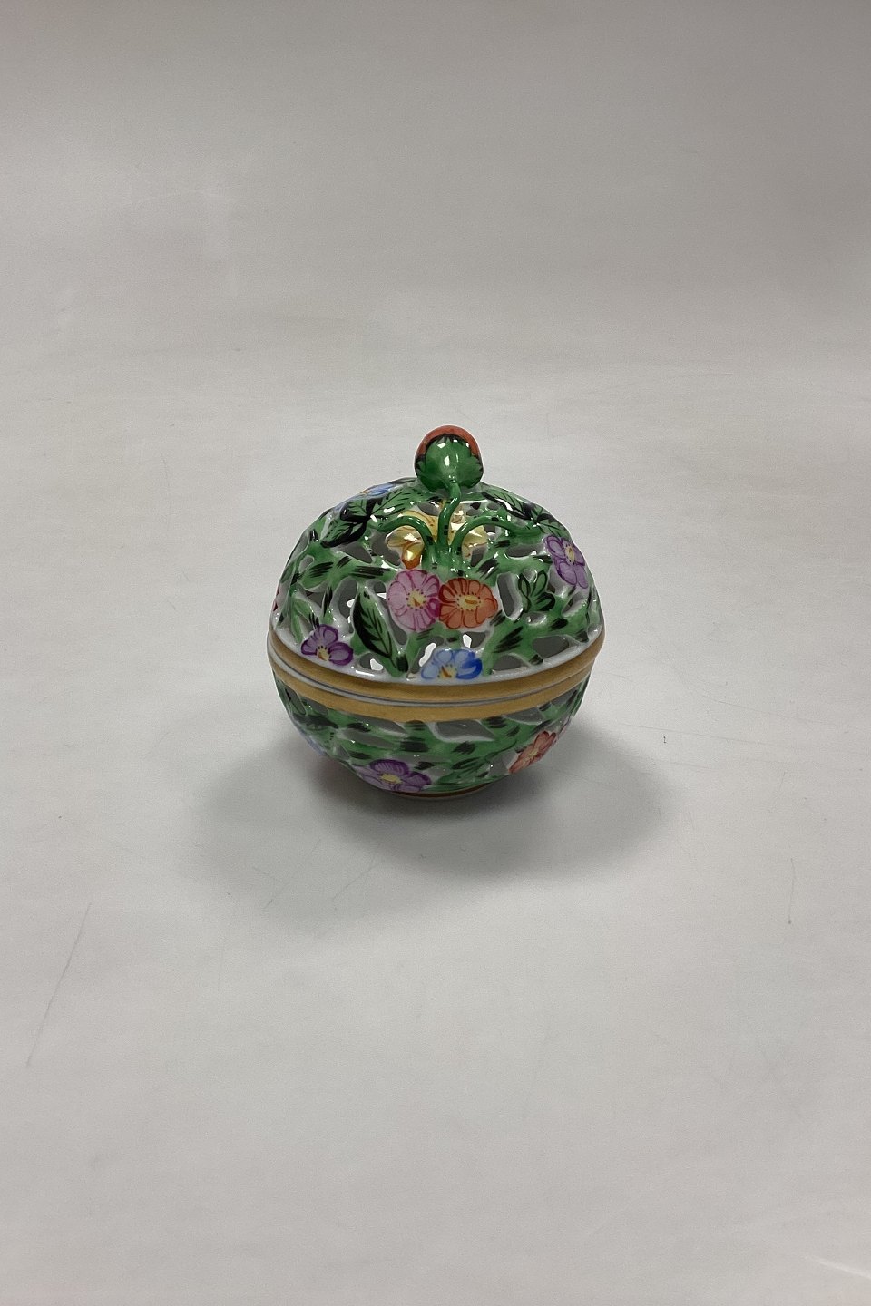 Herend Ungarn Bonbonniere, gennembrudt No. 6214. Multifarvet med blomster.Måler: H 7,7 cm x D 7 cm.