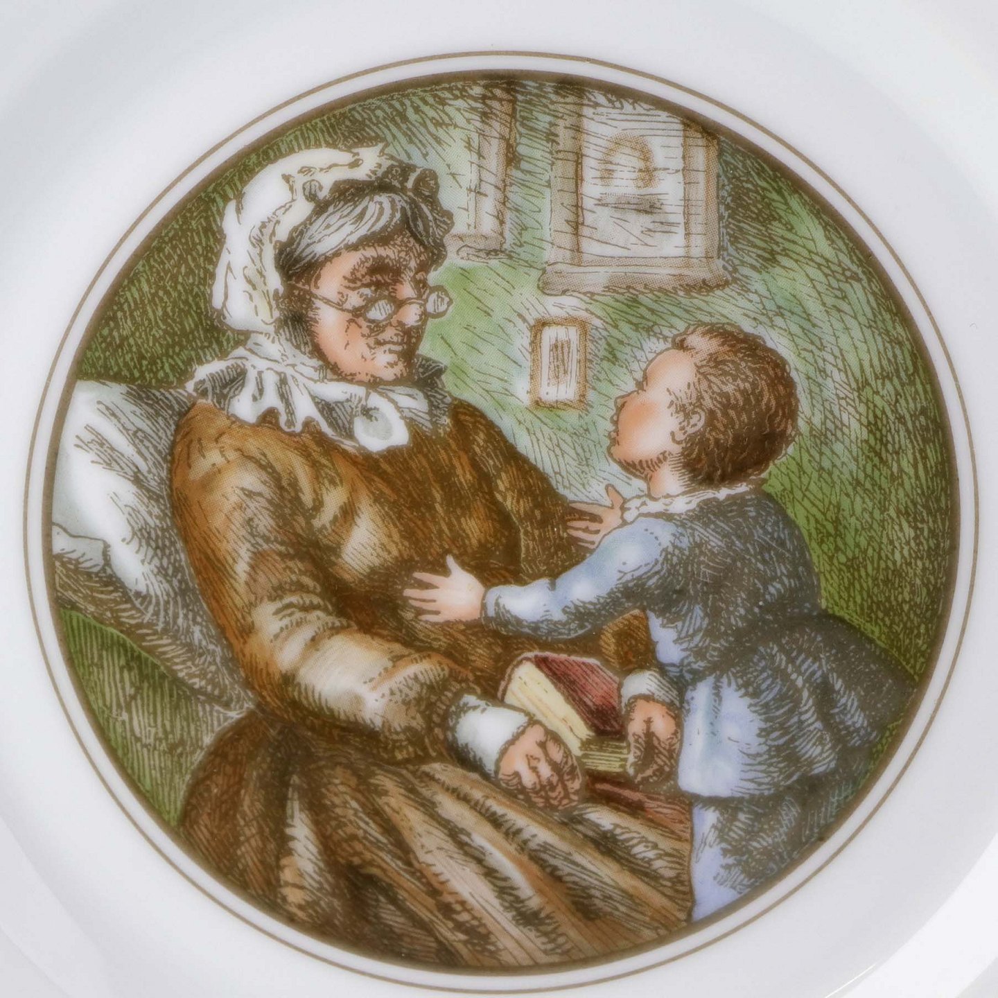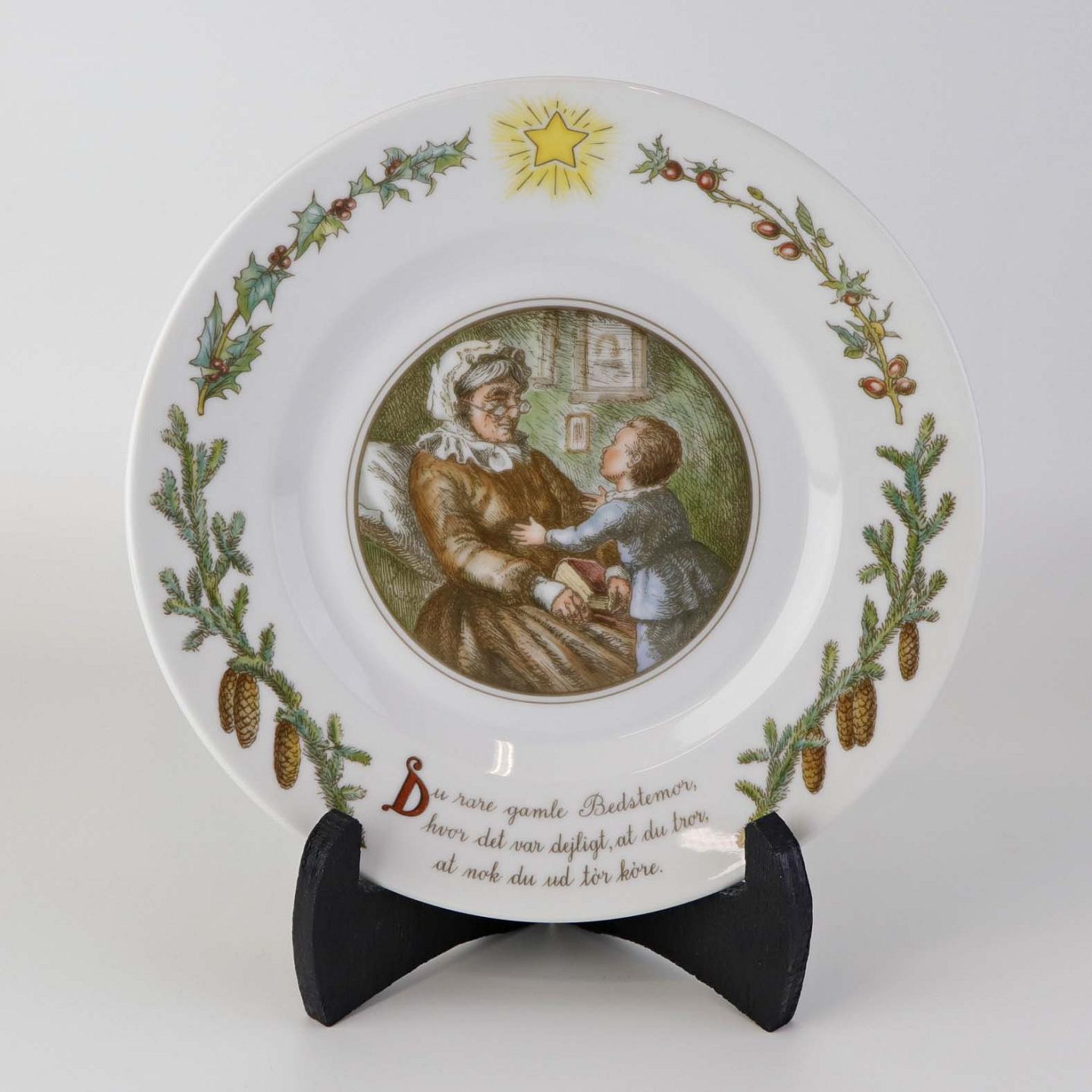 Flad desserttallerken i kongeligt porcelæn fra serien Peters Jul med motiv af bedstemor. Nr. 5Formgiver Johan Krohn og Pietro Krohn