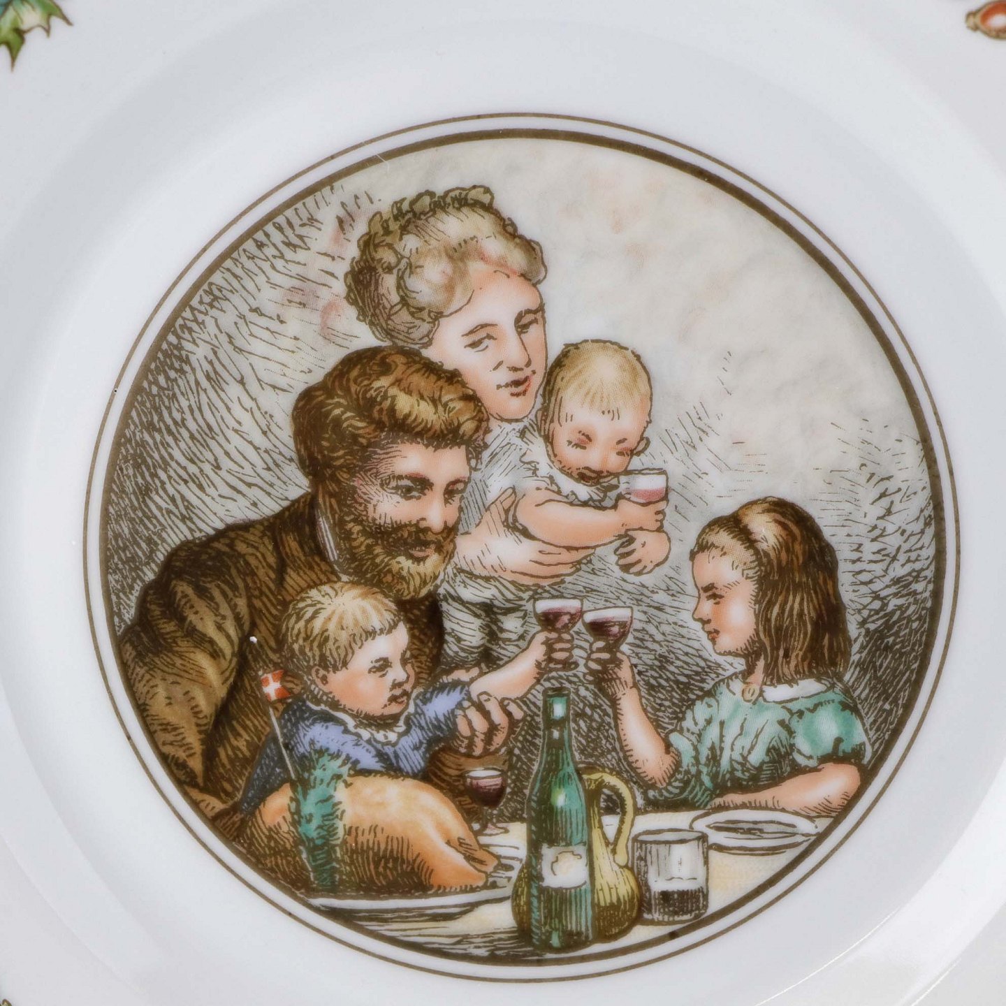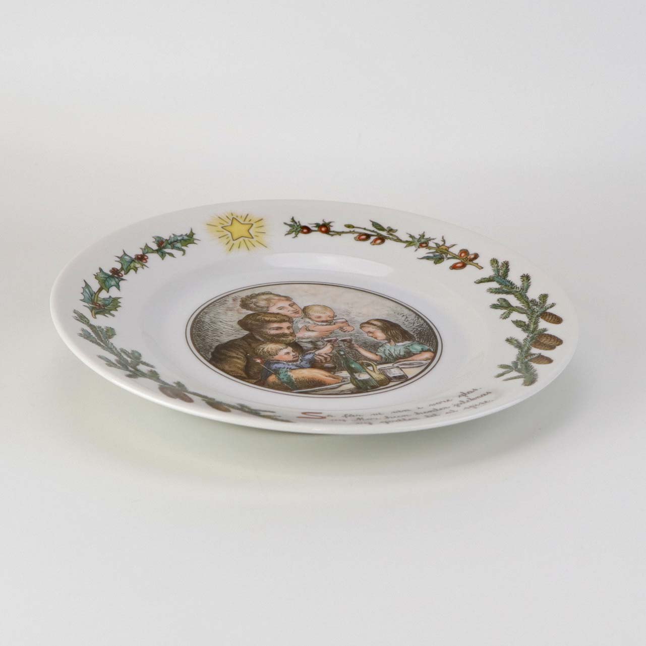 Flad desserttallerken i kongeligt porcelæn fra serien Peters Jul med motiv af julebordet med familien. Nr. 6Formgiver Johan Krohn og Pietro Krohn