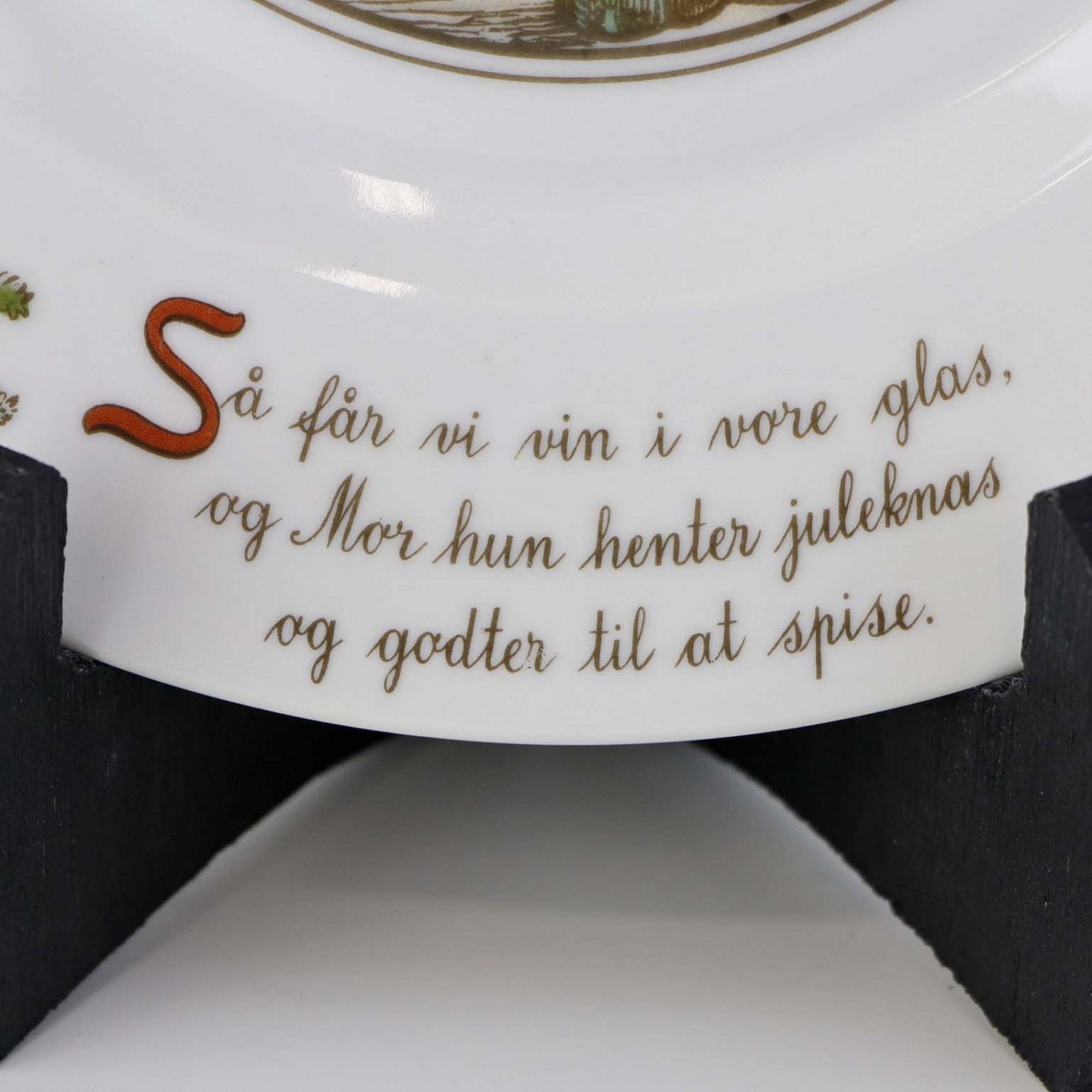 Teksten på tallerknen lyder - Så får vi vin i vore glas, og Mor hun henter juleknas og godter til at spise.