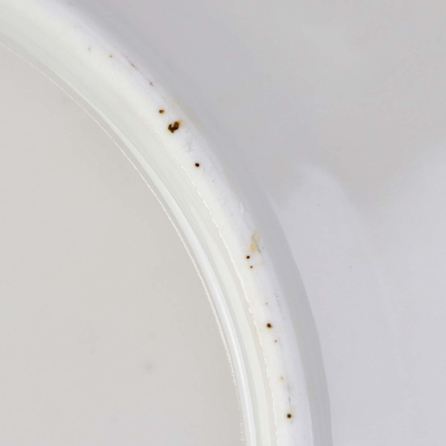 Fremstår med enkelte små brune pletter på bagsiden af tallerknen.