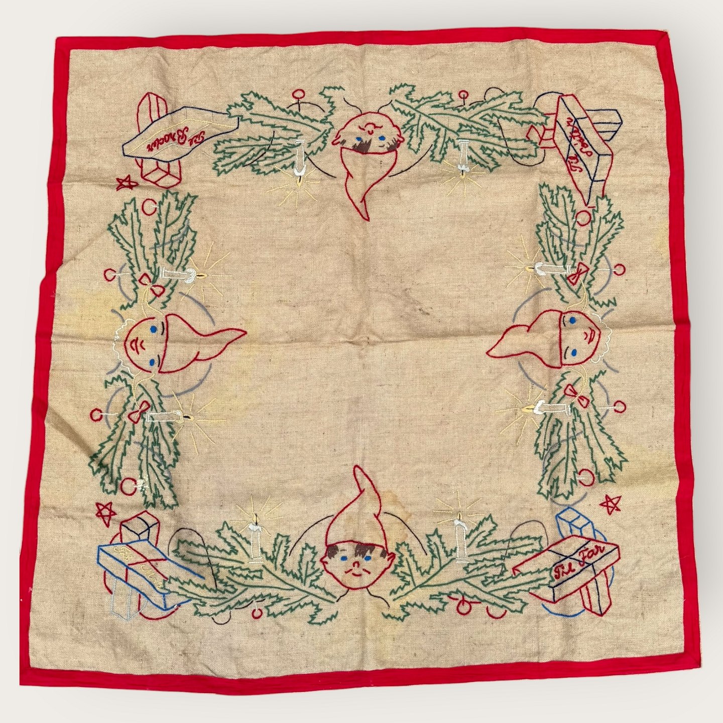Weihnachtsbaumdecke, Stickerei mit Weihnachtsmotiv, 120 cm x 120 cm *Schöner, patinierter Zustand*Lager: 1