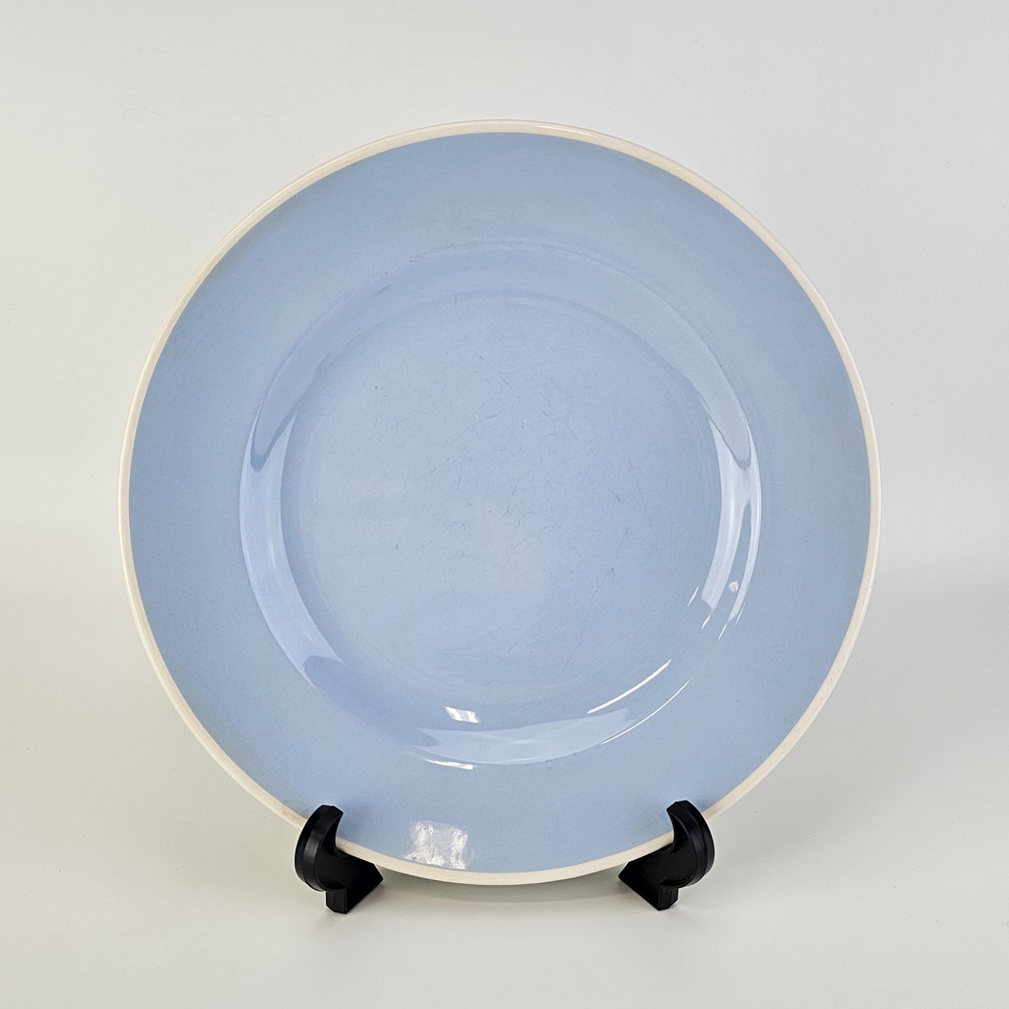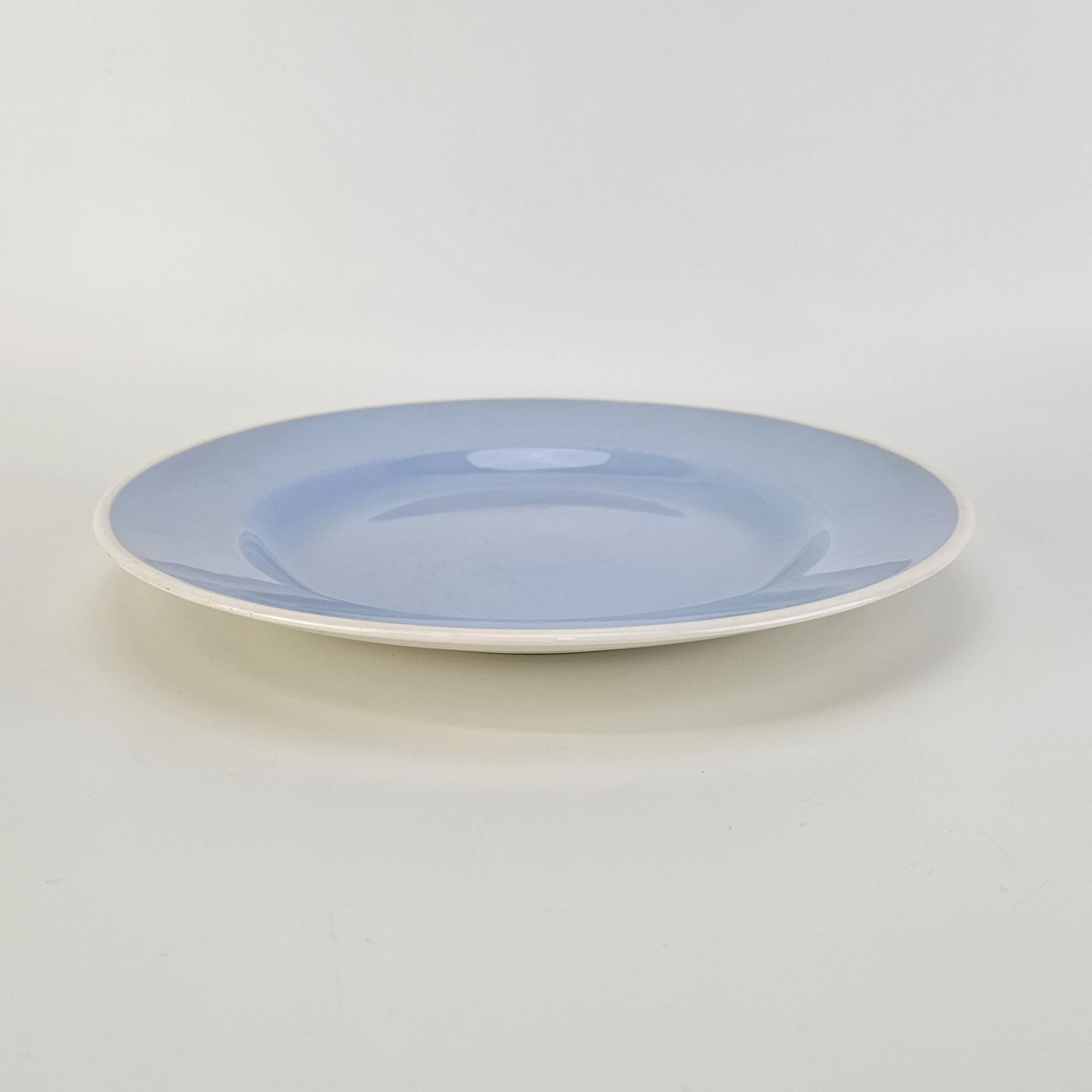 Service i lyseblå fajance dekoreret med hvid kant