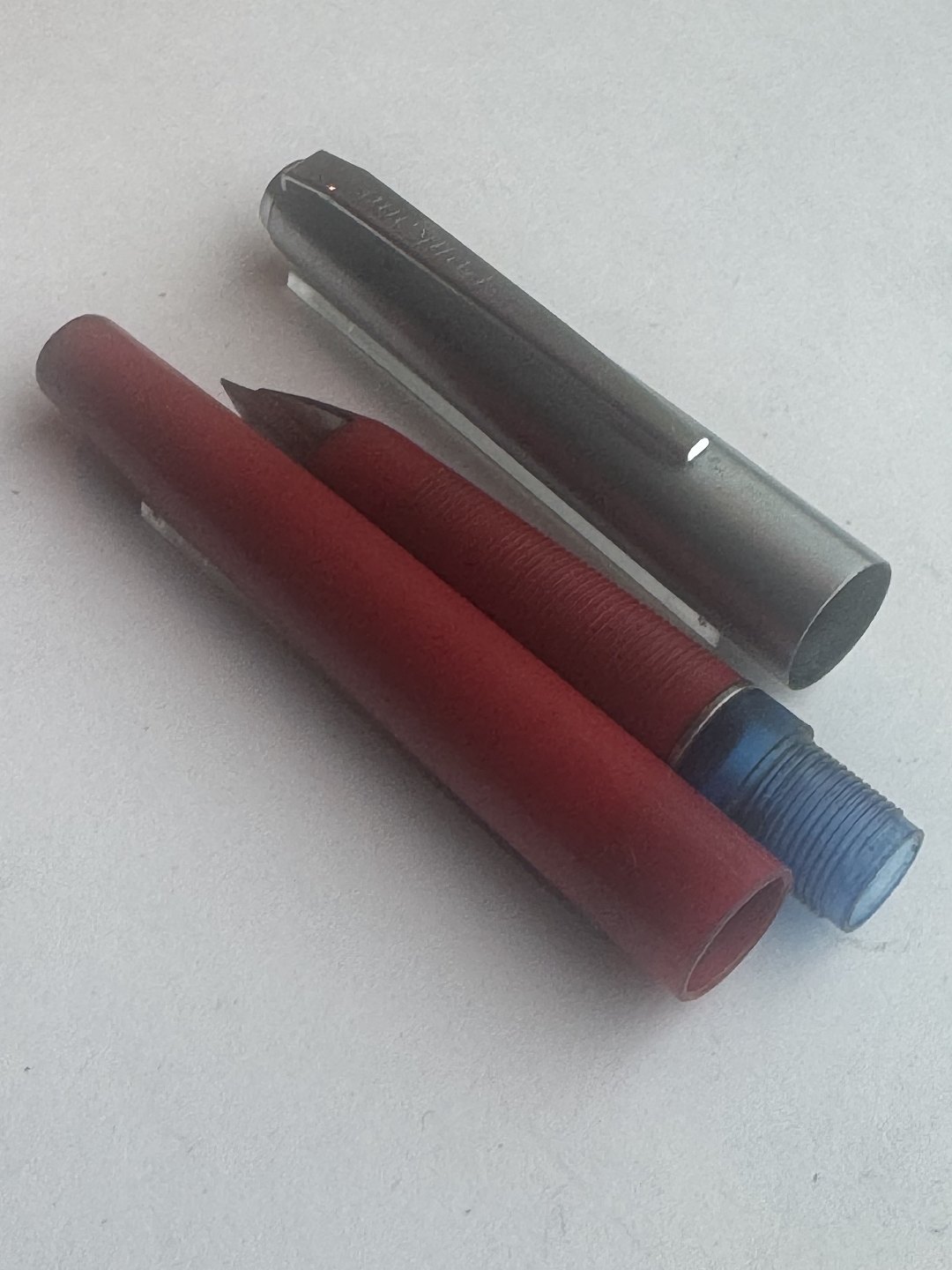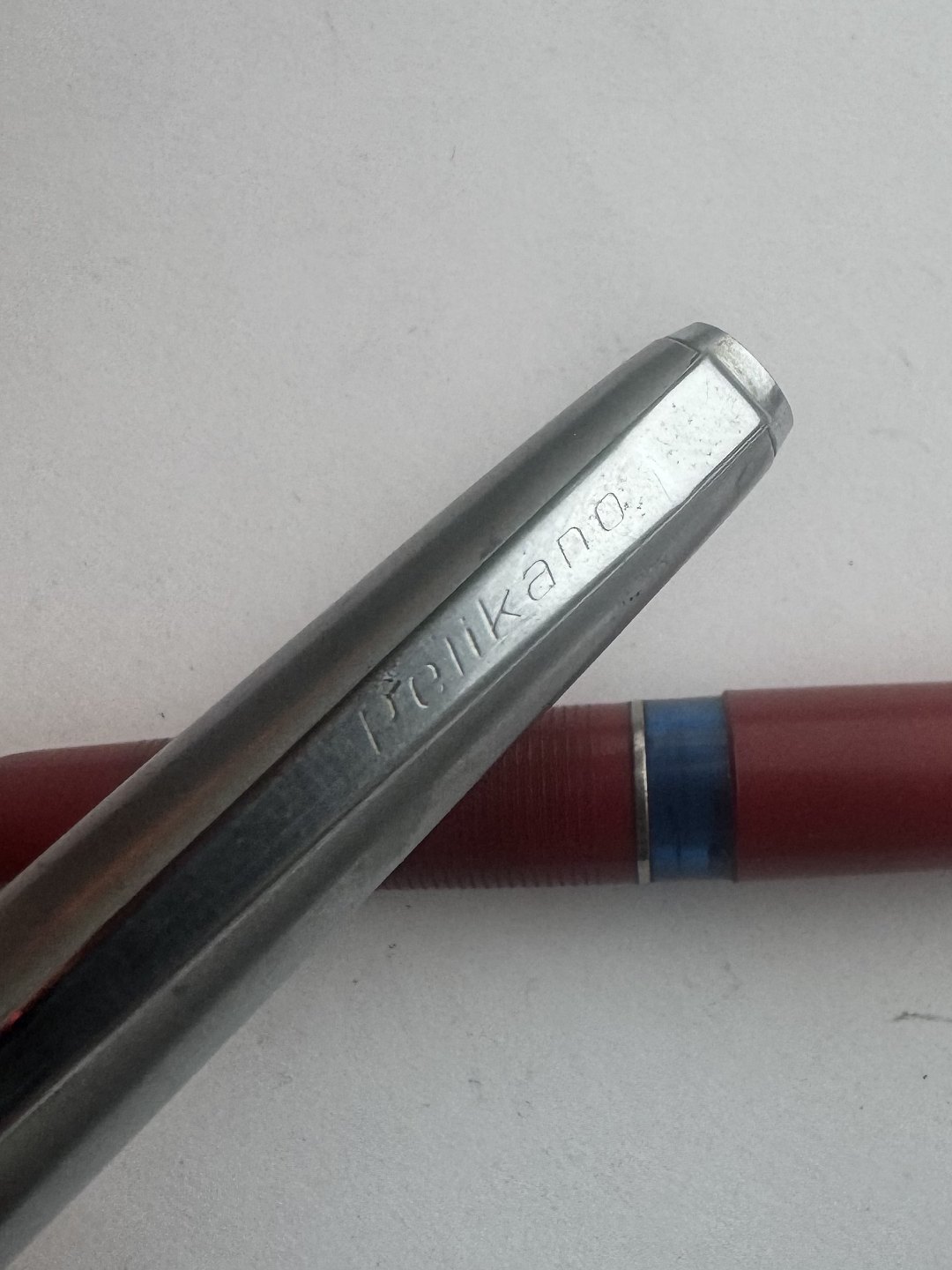 Ren Retro-stil: Rød Pelikan Pelikano fyldepen med hætte i stål. Alle dele originale til denne model. Cartridge blæk-påfylder - blækpatron. Fremstillet i Tyskland i 1970’erne. I god stand. Klar til at blive brug, når en ny ejer har fundet blæk-patroner til denne model. L. 13,2 cm