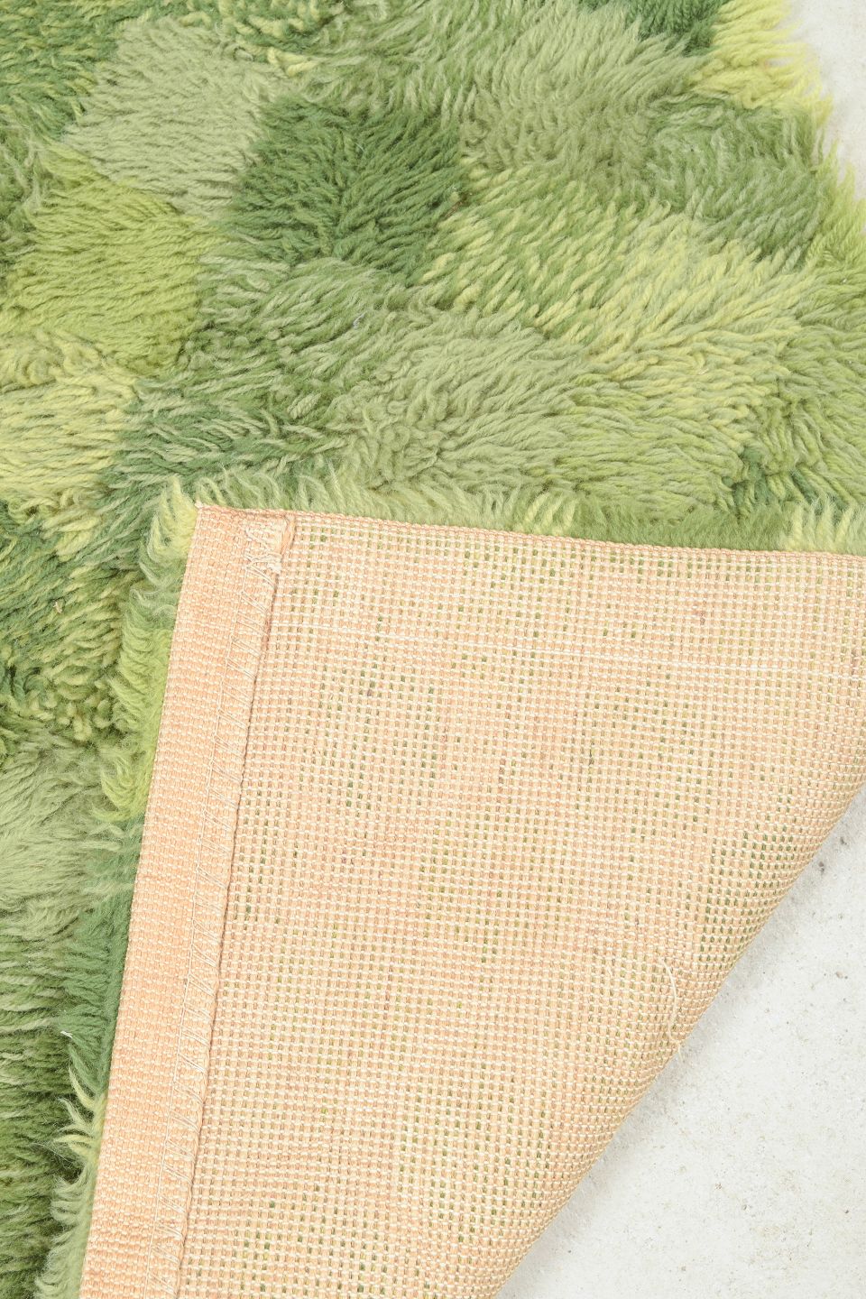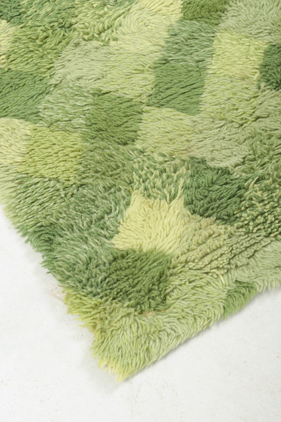 Håndknyttet rya-tæppe i uld med geometrisk ternet mønster i forskellige grønne nuancer. Et harmonisk og tidstypisk design, hvor tone-i-tone farver skaber en rolig og organisk overflade – et klassisk eksempel på skandinavisk enkelhed og sans for naturlige farver.