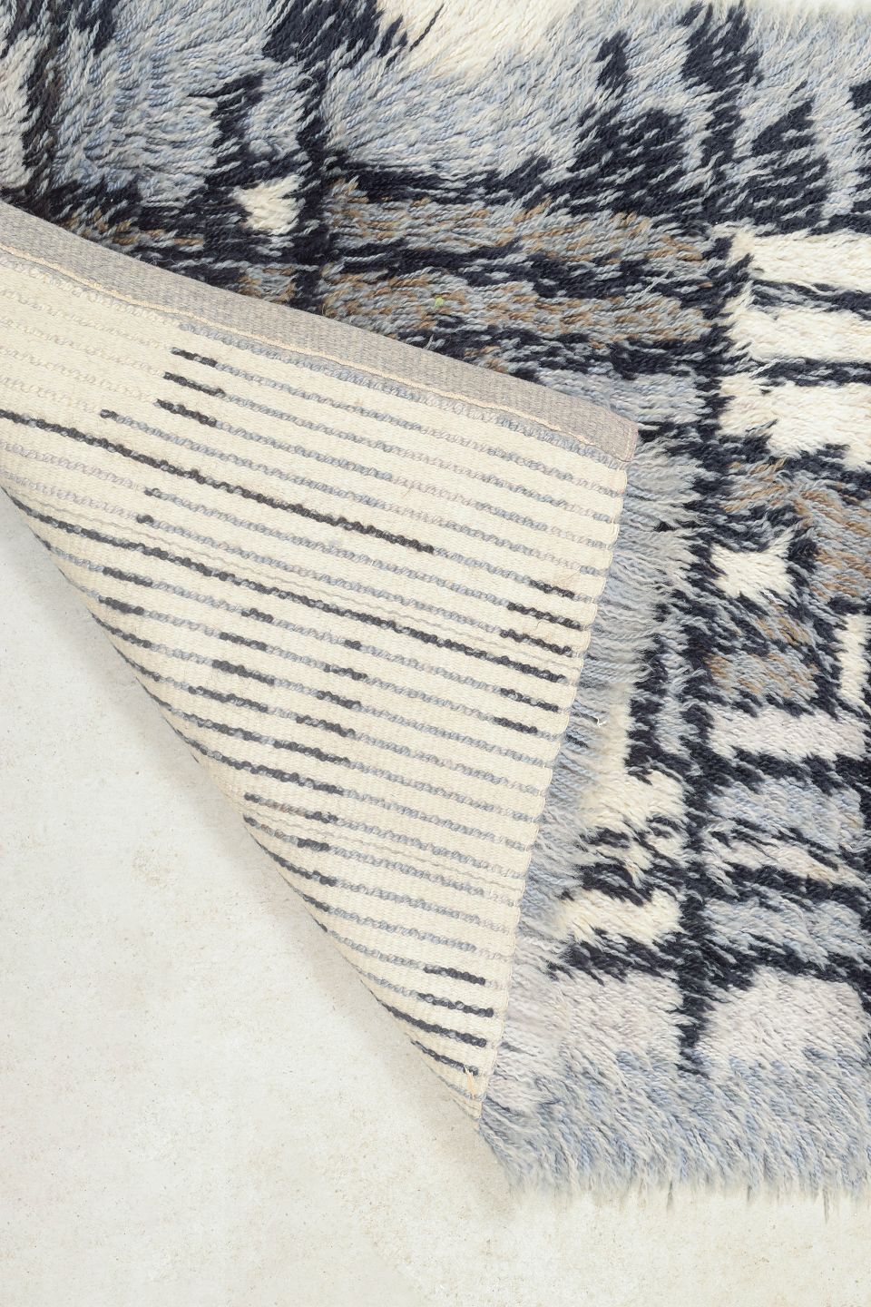 Håndknyttet rya-tæppe i uld med geometrisk mønster i sort, grå og cremefarvede toner. Et tidstypisk design med grafisk karakter og afbalanceret farvespil, som afspejler periodens modernistiske tilgang til tekstilkunst.