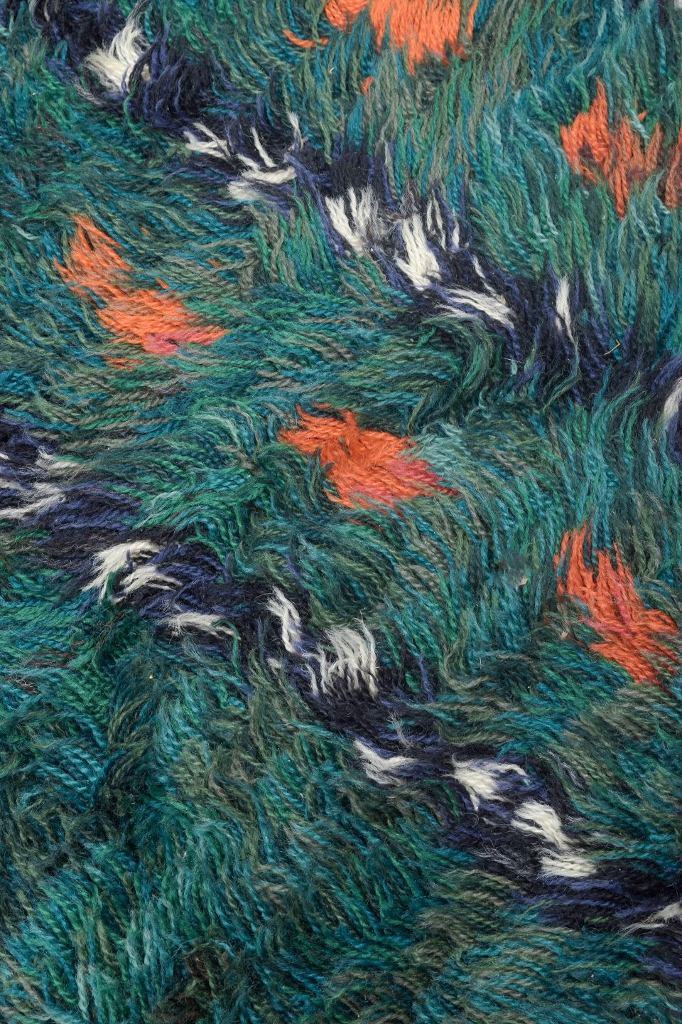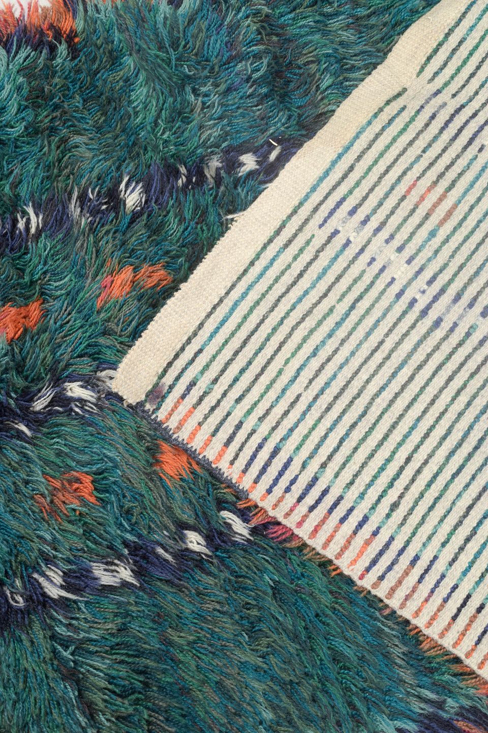 Håndknyttet rya-tæppe i uld med lodrette bånd og rytmisk mønster i grønne, blå, orange og hvide nuancer. Et farverigt og teksturelt værk, typisk for skandinavisk design i perioden, hvor eksperimenterende farvesammensætninger blev kombineret med klassisk håndværk.