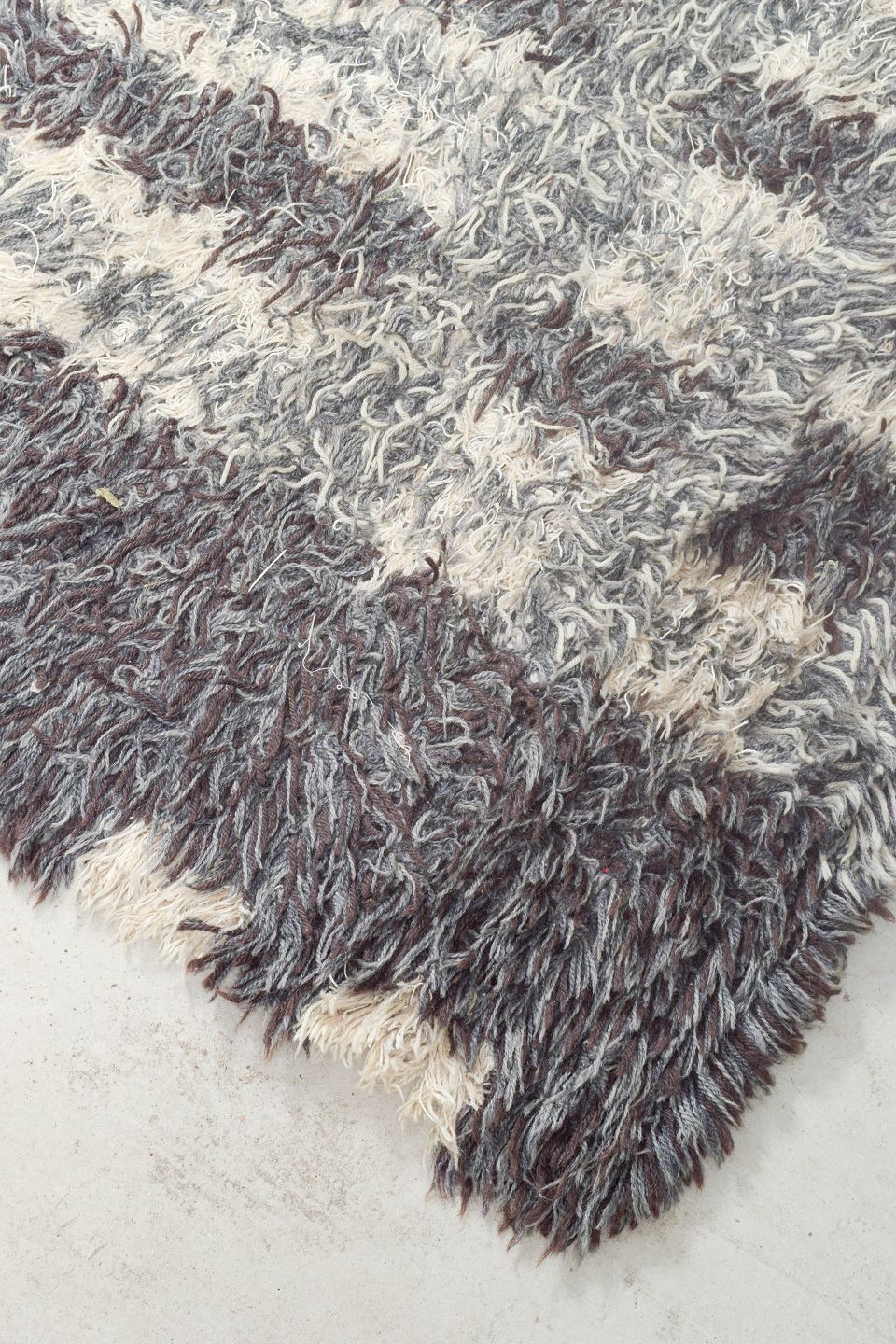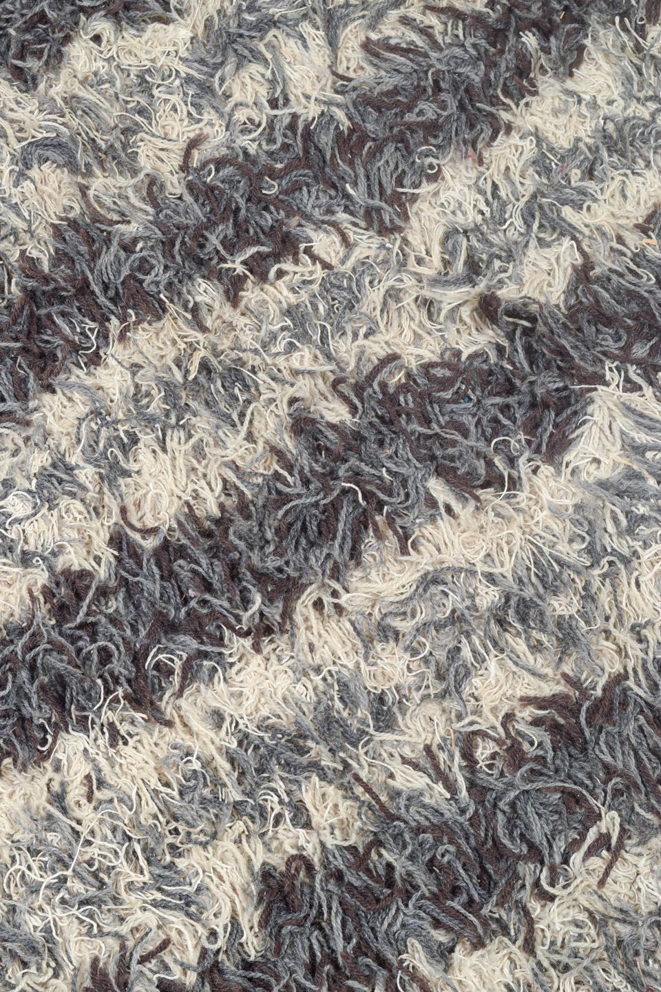 Håndknyttet rya-tæppe i uld med geometrisk mønster i grå og cremefarvede nuancer. Et klassisk eksempel på skandinavisk design fra perioden, hvor enkelhed og struktur blev kombineret med funktionel æstetik.
