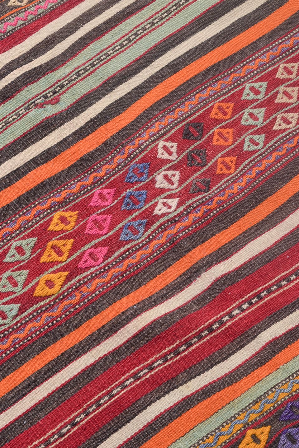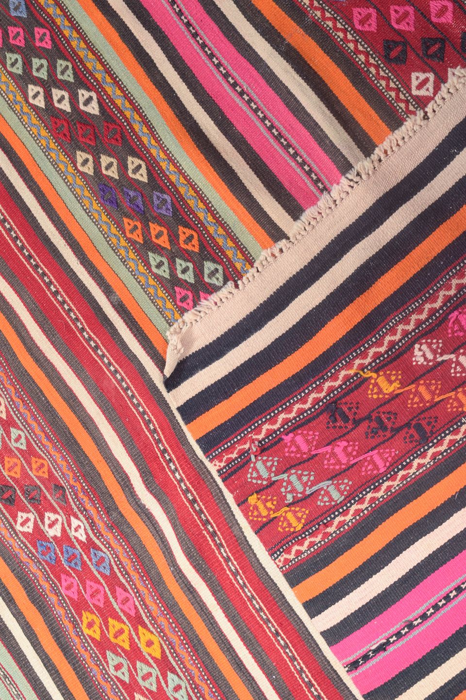 Håndvævet kelim tæppe i 100 % bomuld med geometrisk mønster i flerfarvede striber i røde, orange, rosa og blå nuancer. Et dekorativt vintage tekstilstykke med klassisk folkelig karakter.