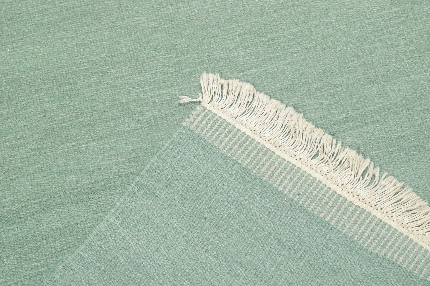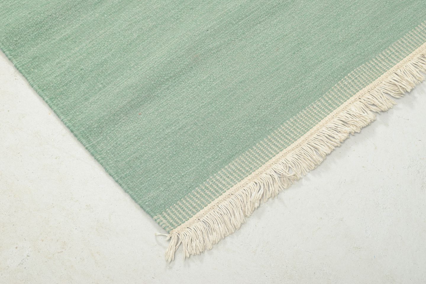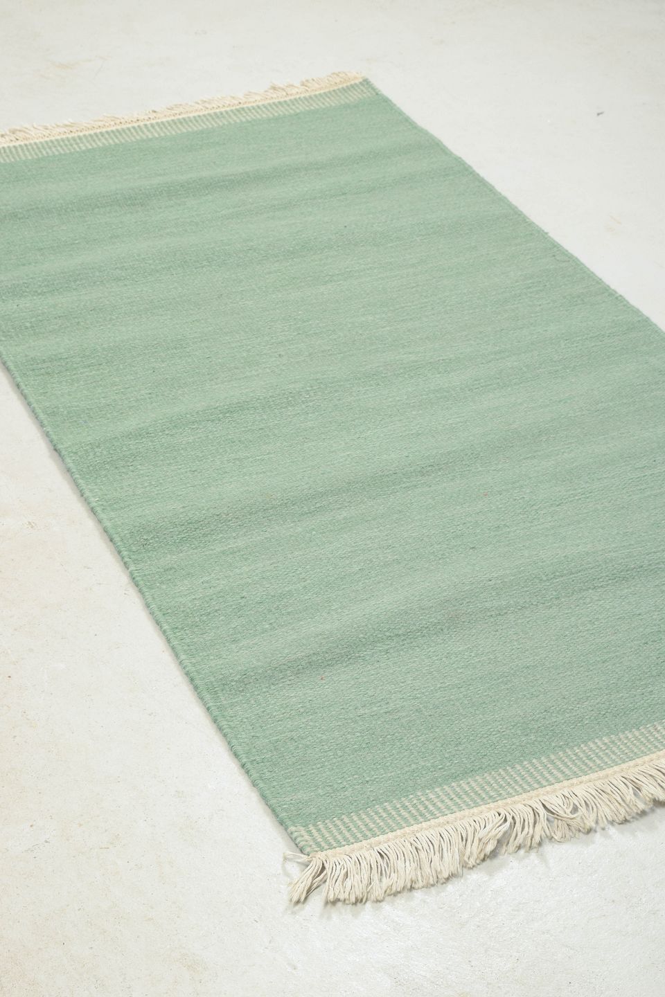 Håndvævet rölakan-tæppe i uld med ensfarvet væv i støvet grøn nuance og frynser i enderne. Et stilrent eksempel på svensk tekstiltradition, hvor enkelhed og håndværksmæssig kvalitet går hånd i hånd.