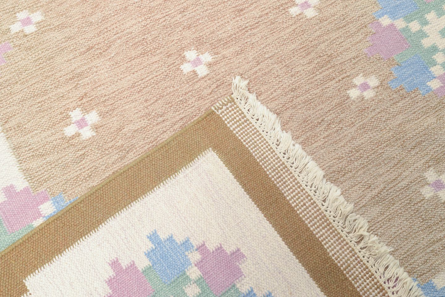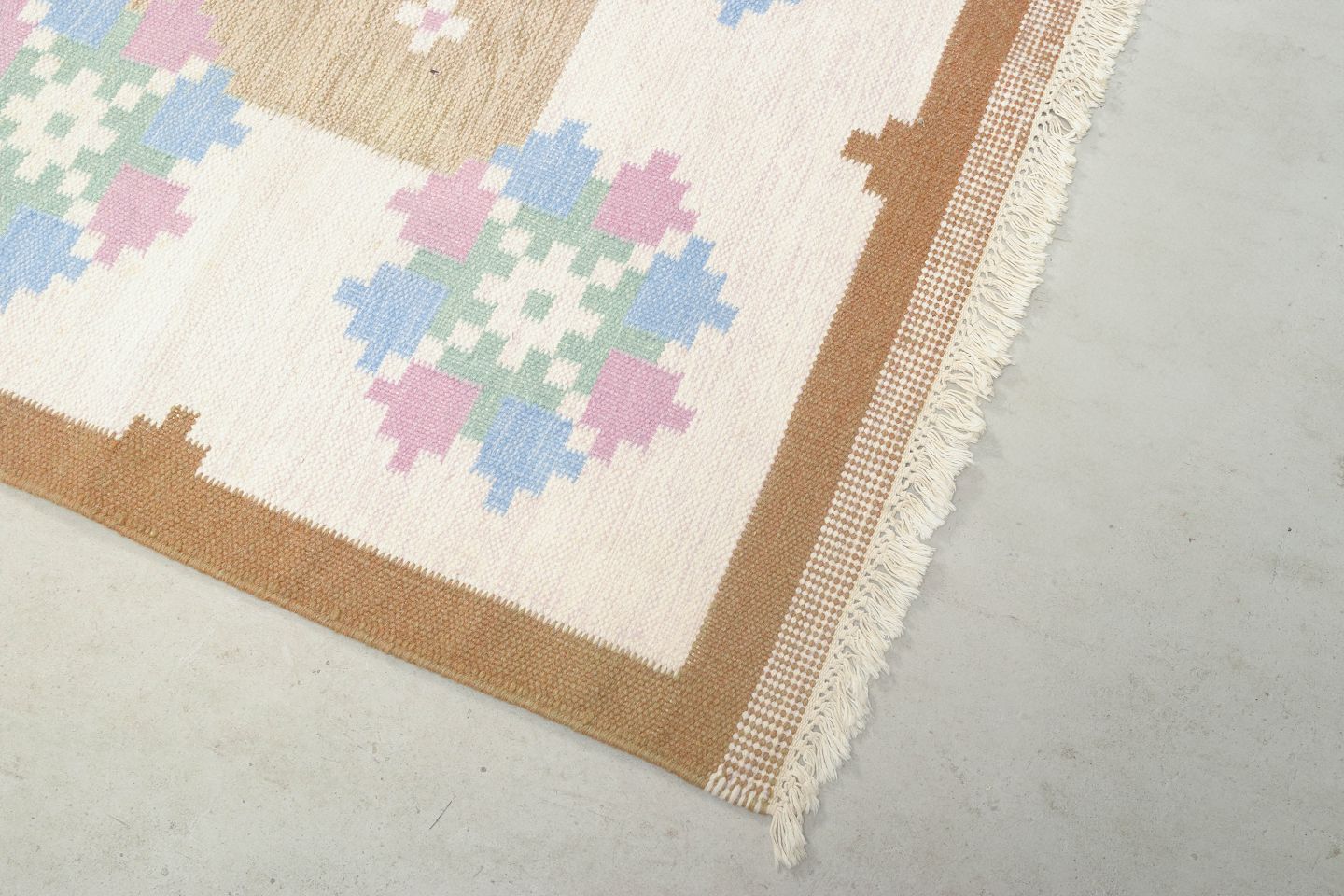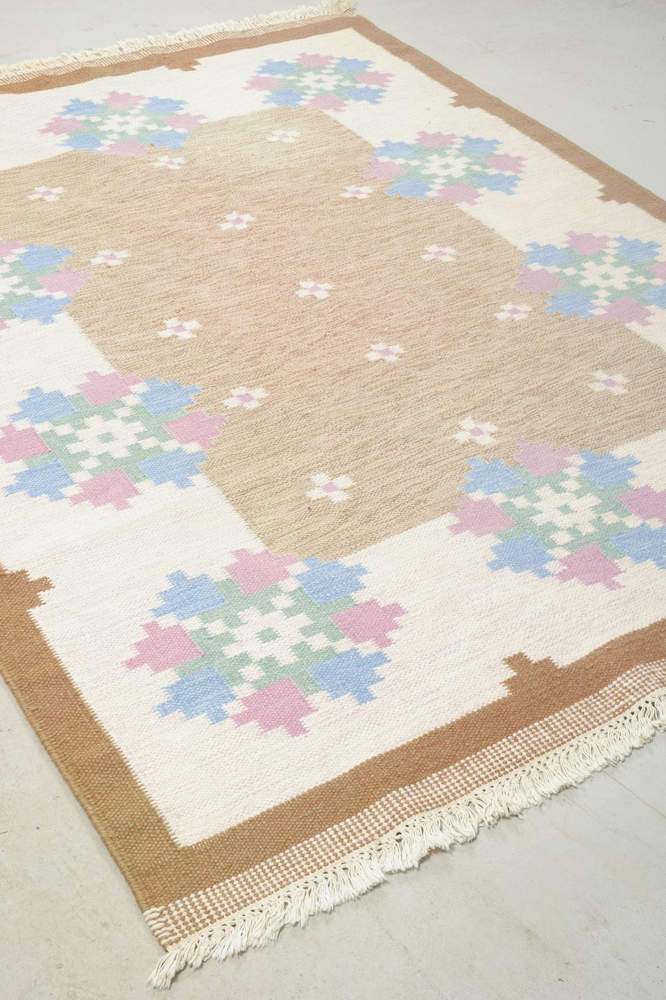 Håndvævet tæppe i klassisk svensk rölakan-teknik med geometrisk mønster i afdæmpede nuancer af beige, blå, grøn og rosa. Et smukt eksempel på svensk tekstilkunst fra 1960’erne med fokus på håndværk og tradition.