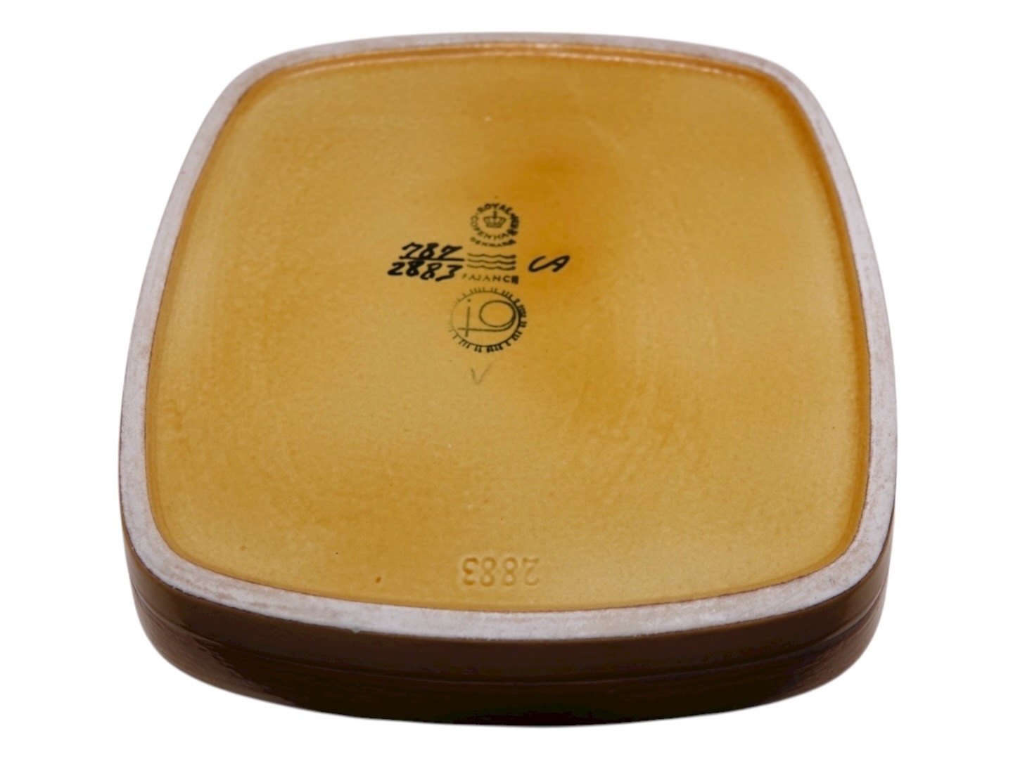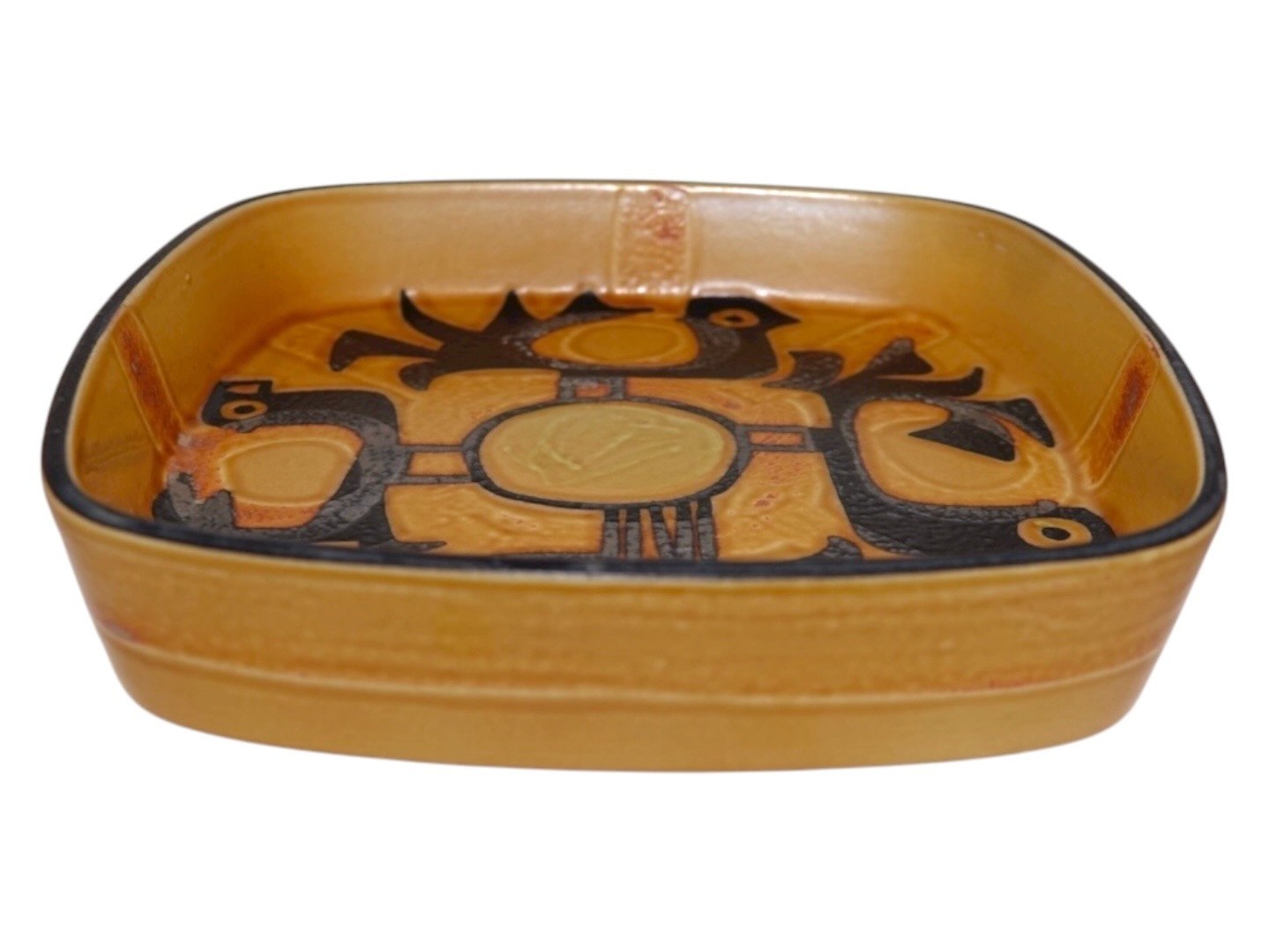 Royal Copenhagen Baca gul firkantet skål dekoreret med fugle.Designet af Johanne Gerber.