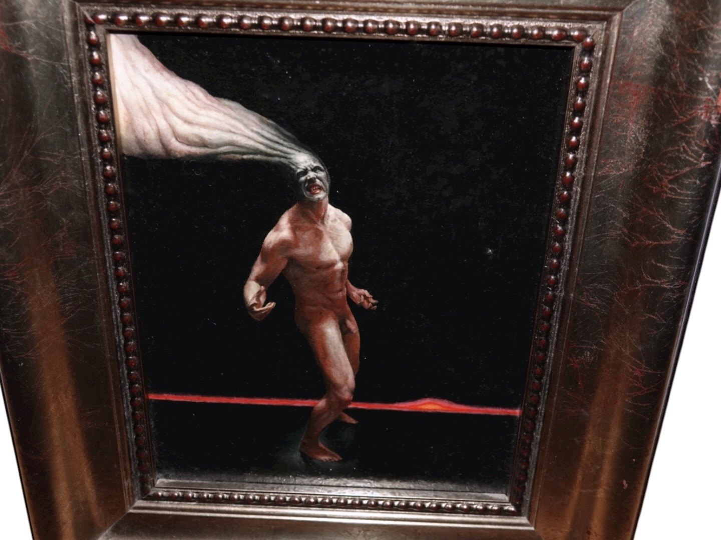 Ville Löppönen (født 1980 i Finland).Akryl og oliemaleri af nøgen mand i bred sølvramme fra 2010.