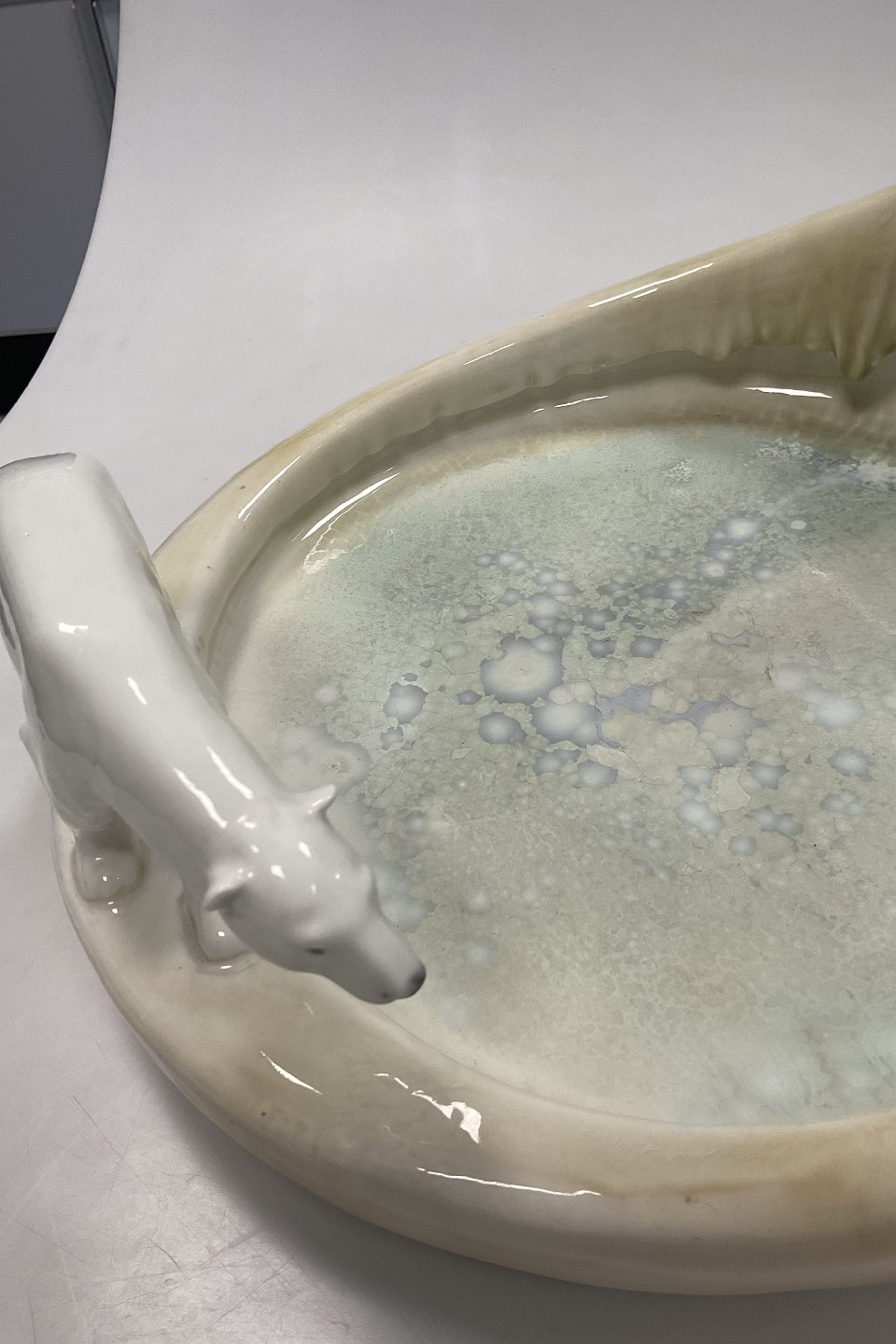 Stor Royal Copenhagen Art Nouveau Krystal Glasur Skål med Isbjørne designet af Arnold Krog og Glasur af Søren Berg "Nordpolen" fra 17. Januar 1925. I helt og fin stand. Men mærket som anden sortering. Hedder Nordpolen, et navn den fik fra Verdensudstillingen i 1900. Måler 40cm lang og 23,5cm høj.