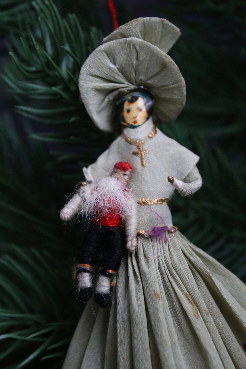 Gammelt juletræspynt , fin dame der holder en lille julemand ,lavet i farvet krep papir...