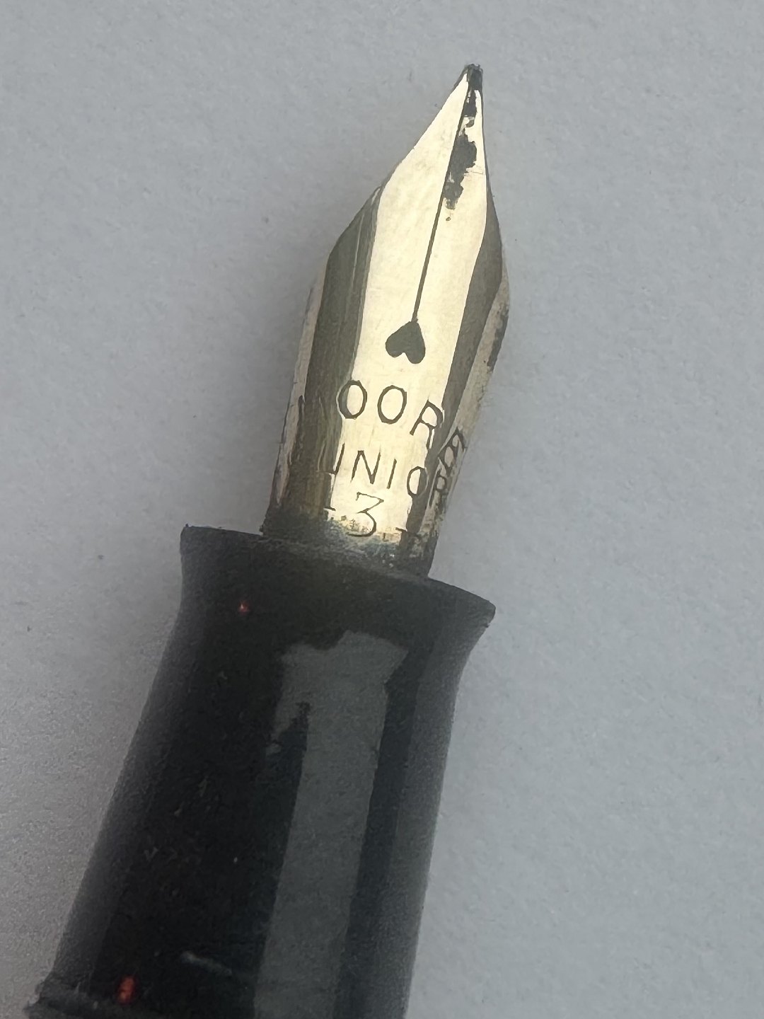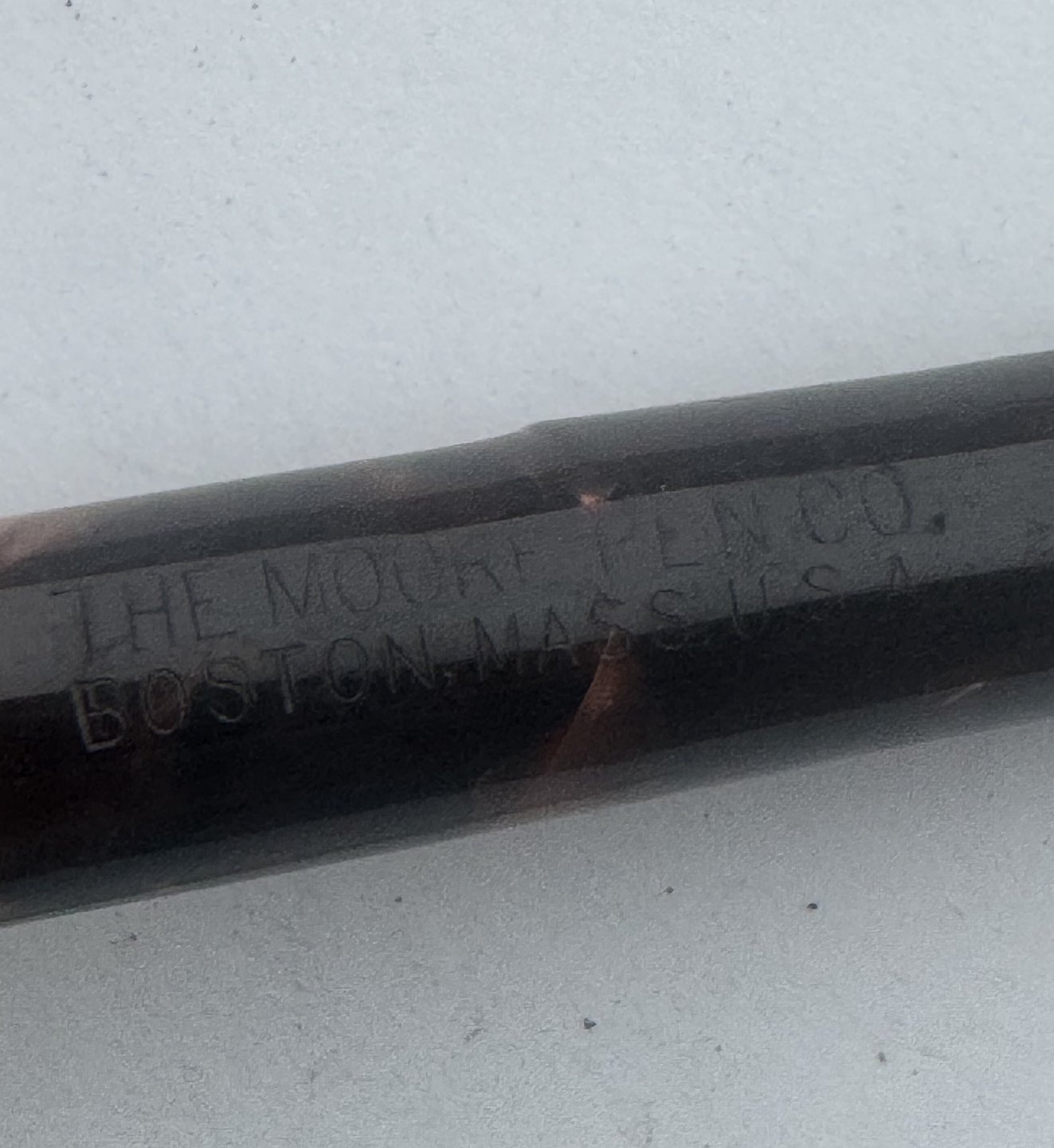Grøn marmoreret fyldepen med lever filler fra The Moore Pen Company. Fremstillet i U.S.A. omkring 1940. Fungerer ikke. Der skal indsættes ny gummisæk før end den igen kan optage blæk og skrive igen. Fyldepennen fremstår ellers i god stand uden skader eller reparationer. Alle dele originale og fra den oprindelige periode. Ny gummisæk kan indsættes mod ekstra betaling på kr. 250,-