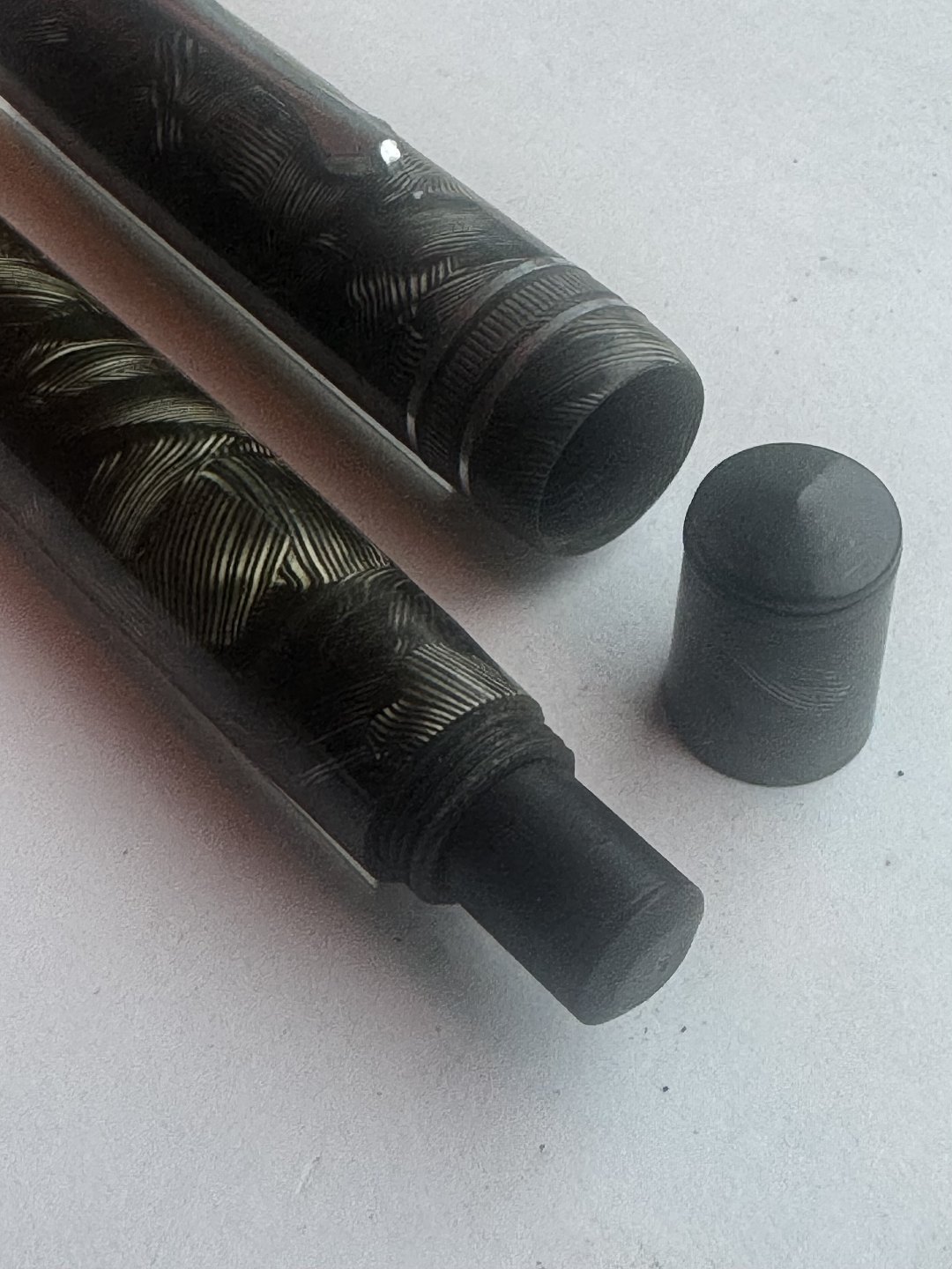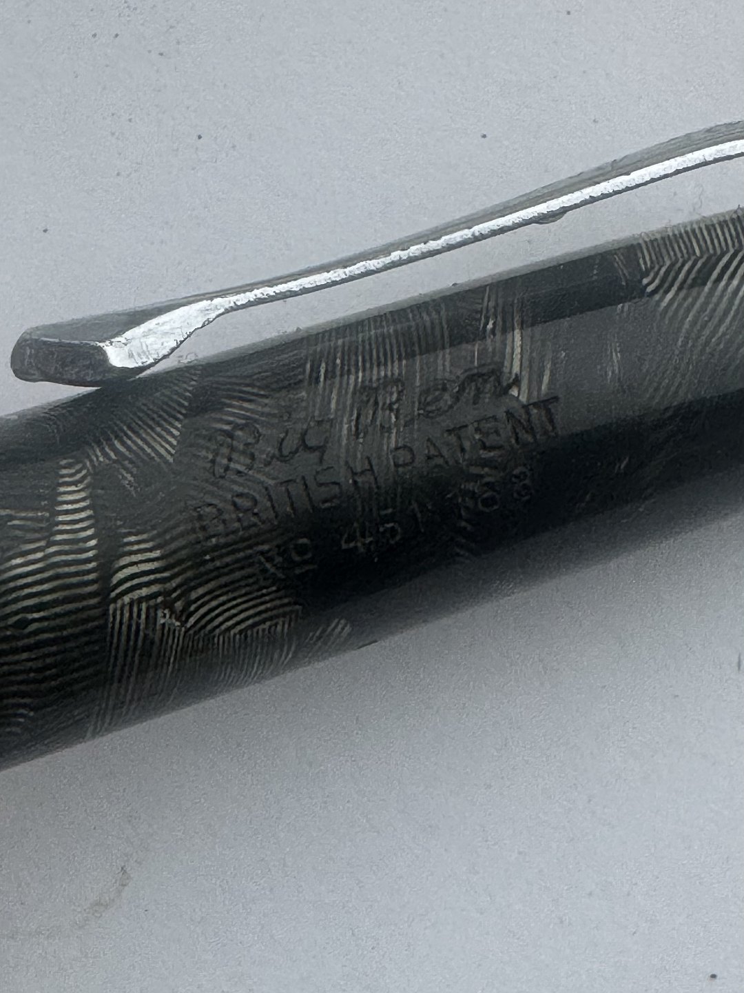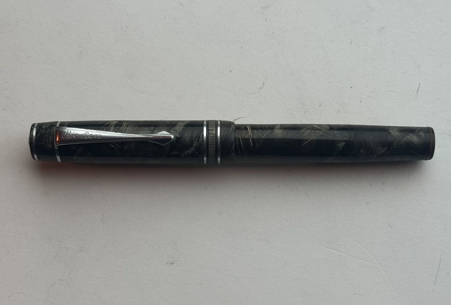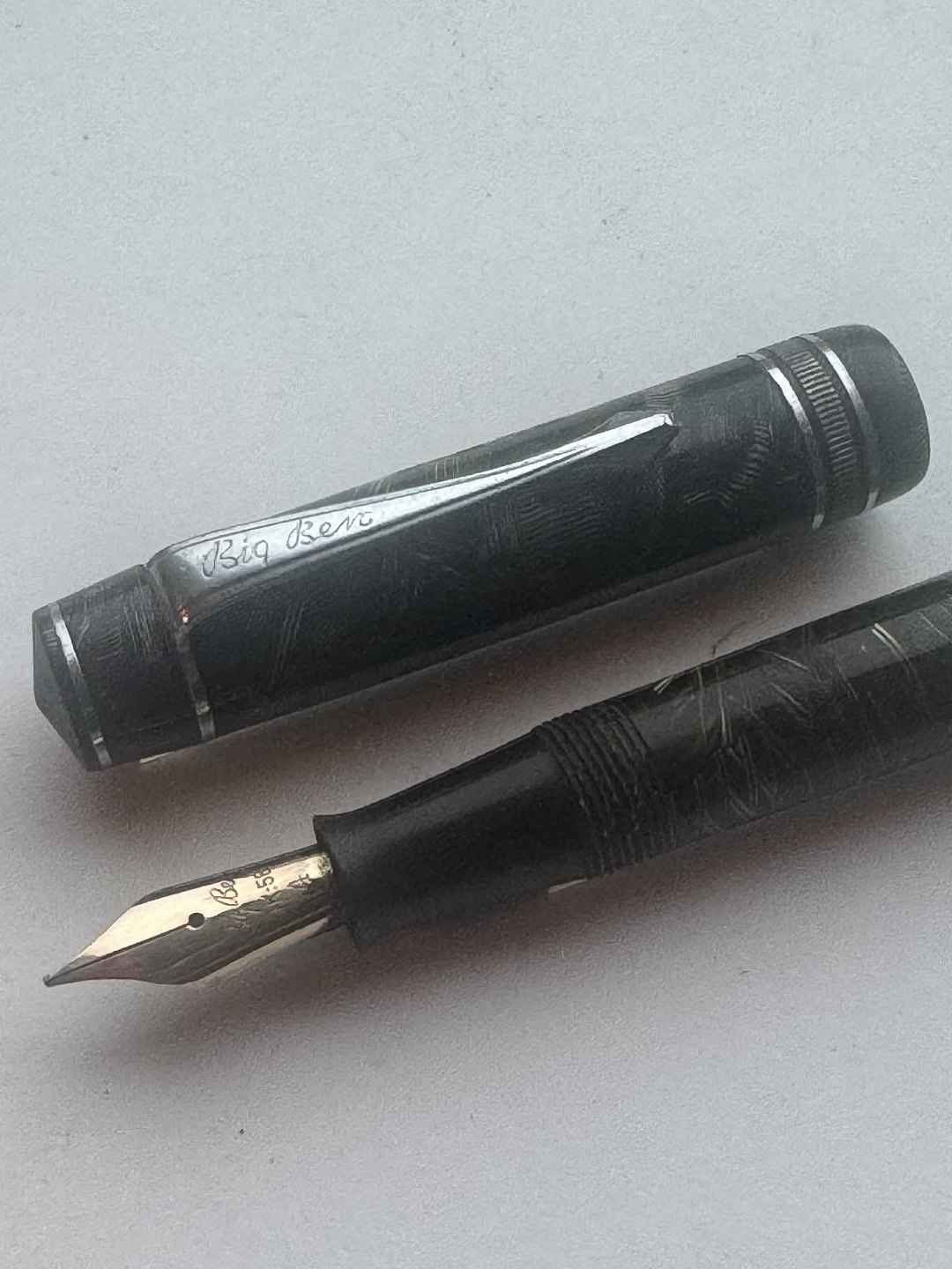 STÅL DEKORATIONER: Grøn marmoreret Big Ben fyldepen med piston filler. Påfyldningsmekanismen skal laves før end fyldepennen igen holder blæk og kan bruges. Ingen skader eller reparationer på nogle af de originale Big Ben inclusiv 14 karat guld spids.