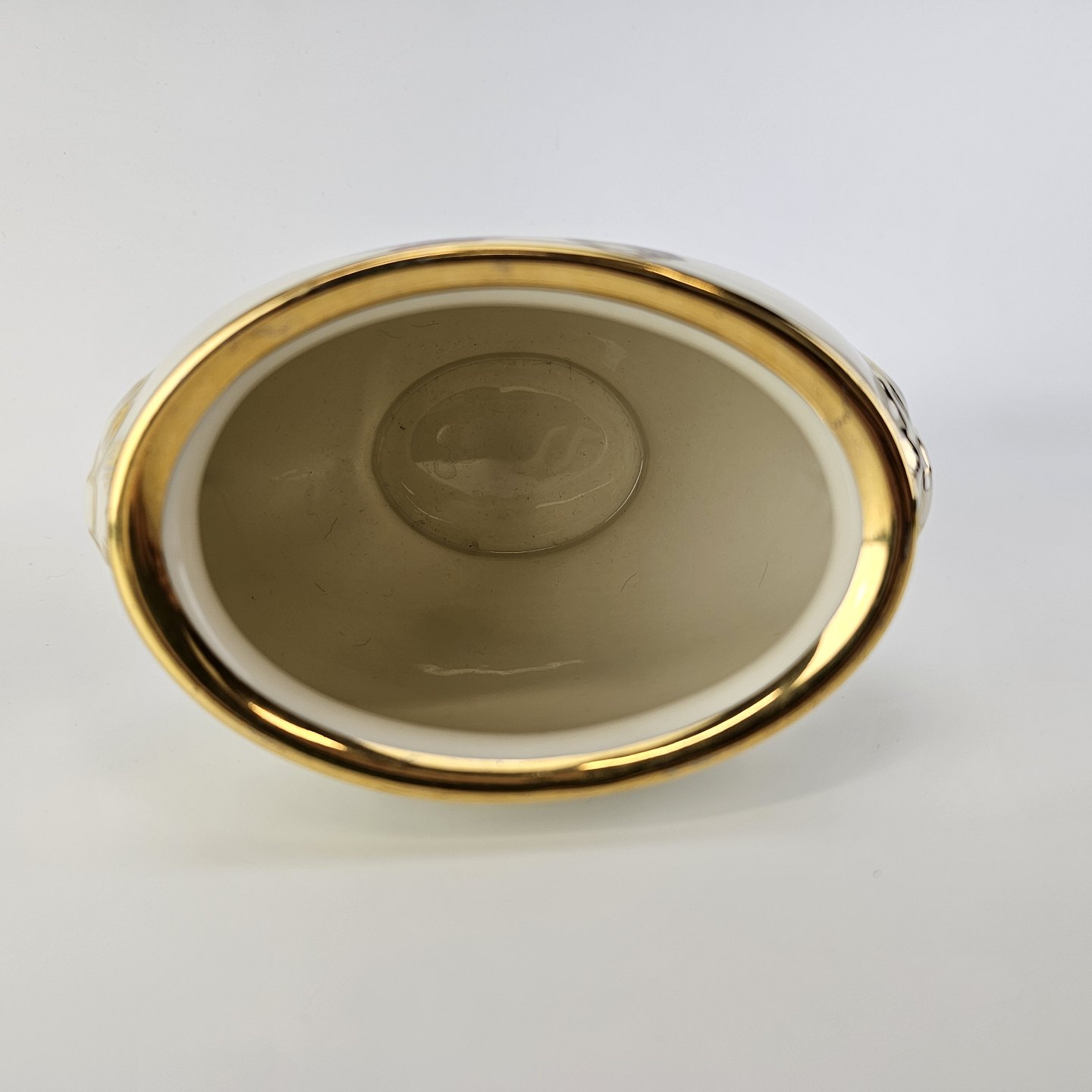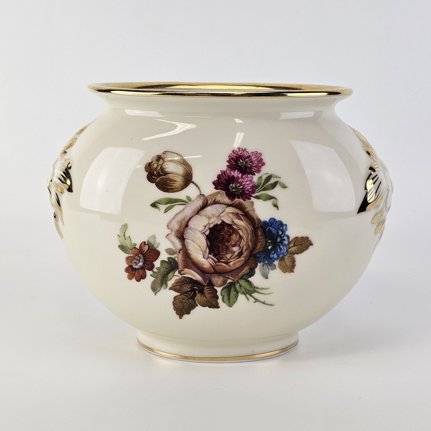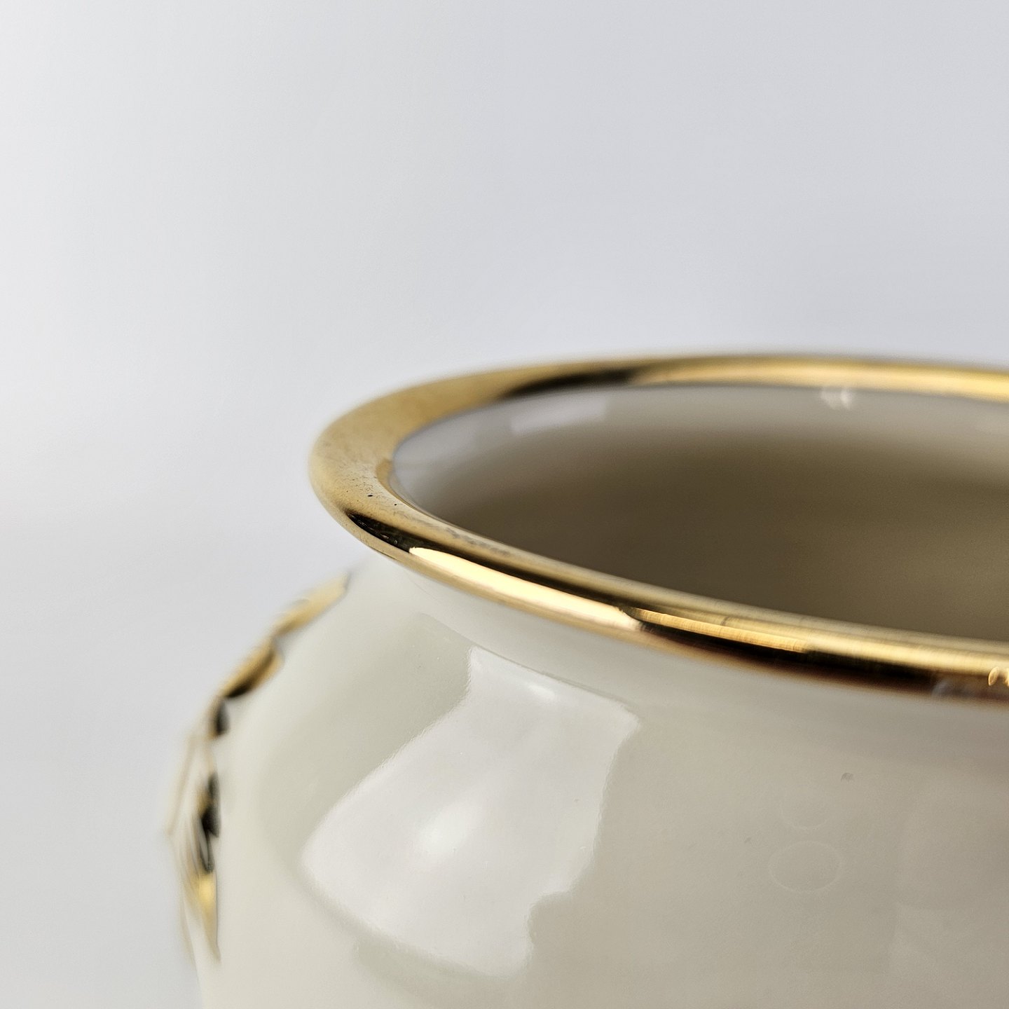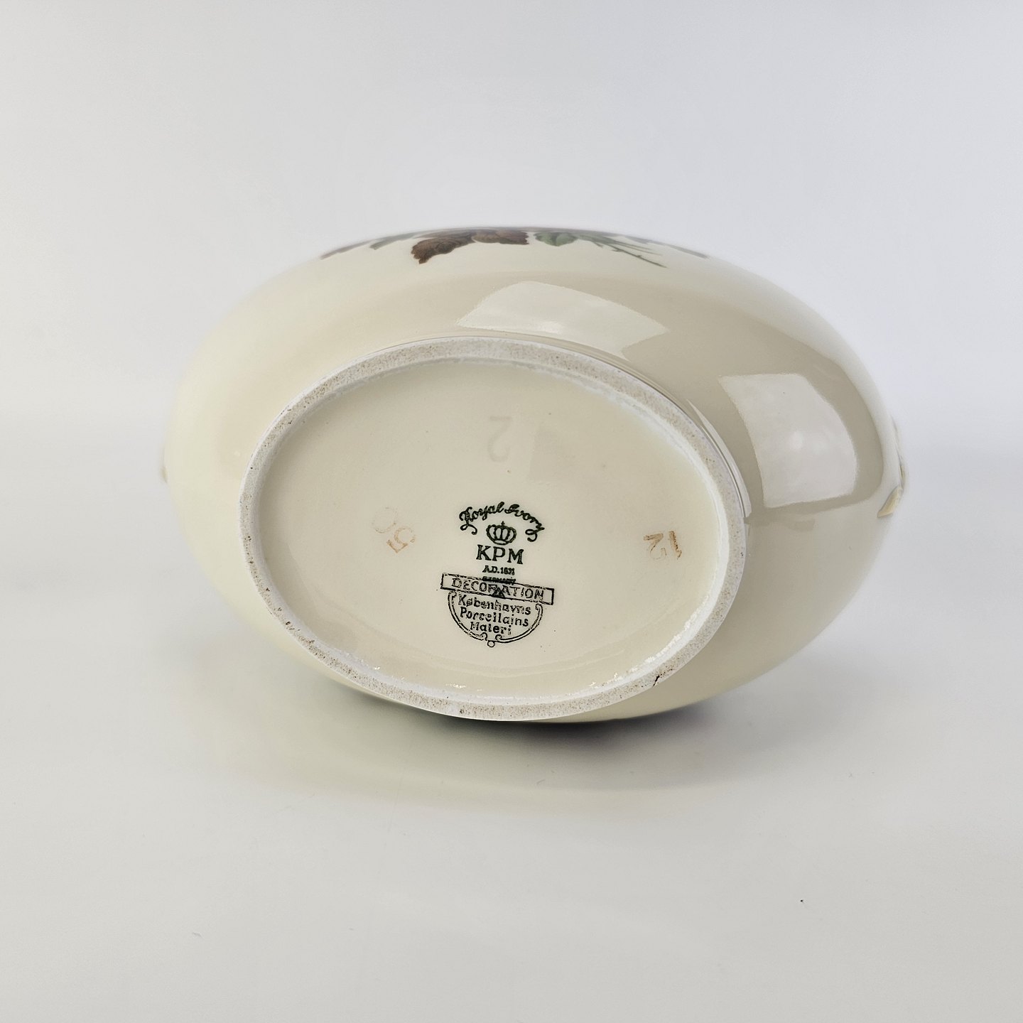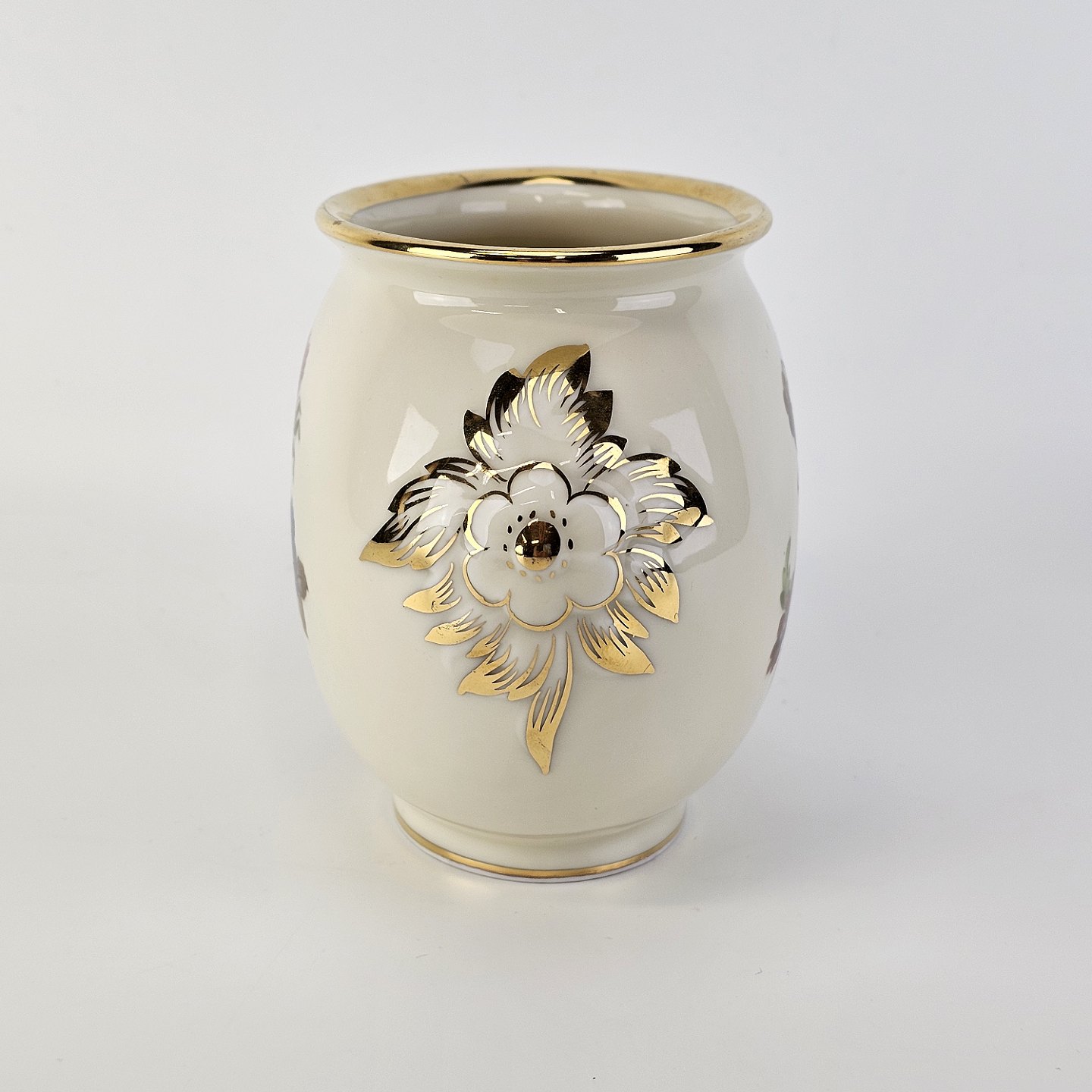Rosenborg oval vase i cremefarvet porcelæn med guldkant og blomstermotivProducent Københavns Porcellains Maleri