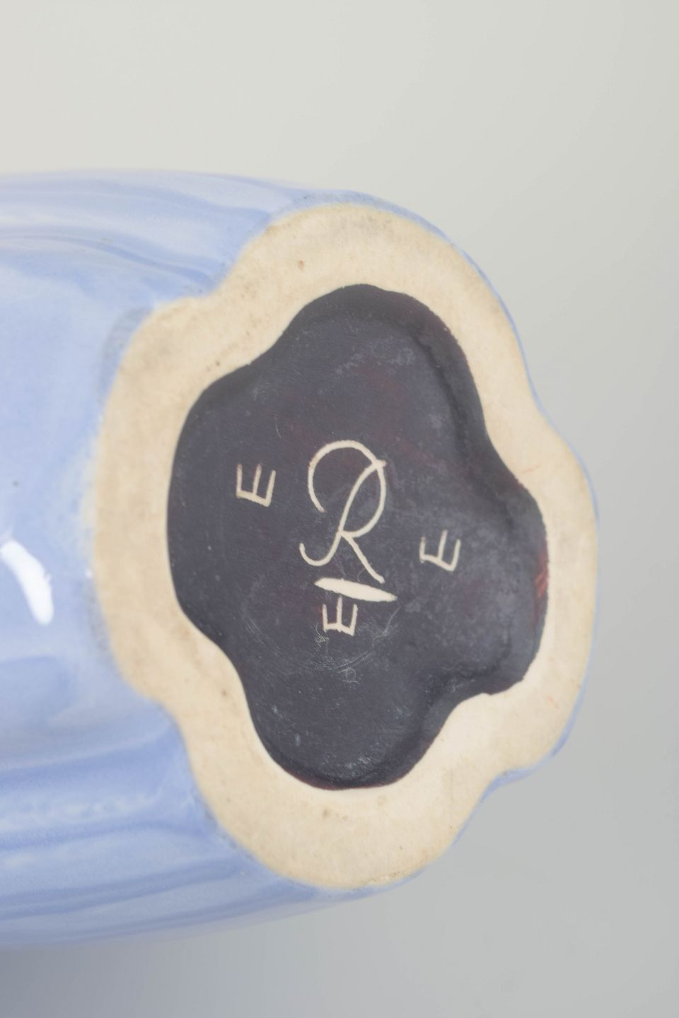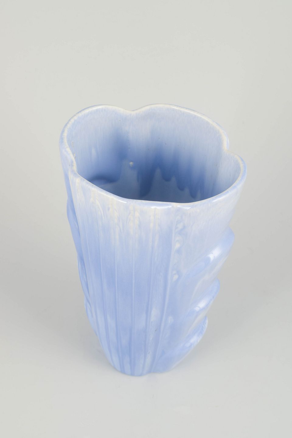 Imponerende keramisk vase med skulpturel, organisk form og lyseblå glasur med perlemorsskær. Et elegant eksempel på Rörstrands midt-århundredes formsprog. Stemplet som 2. sortering.