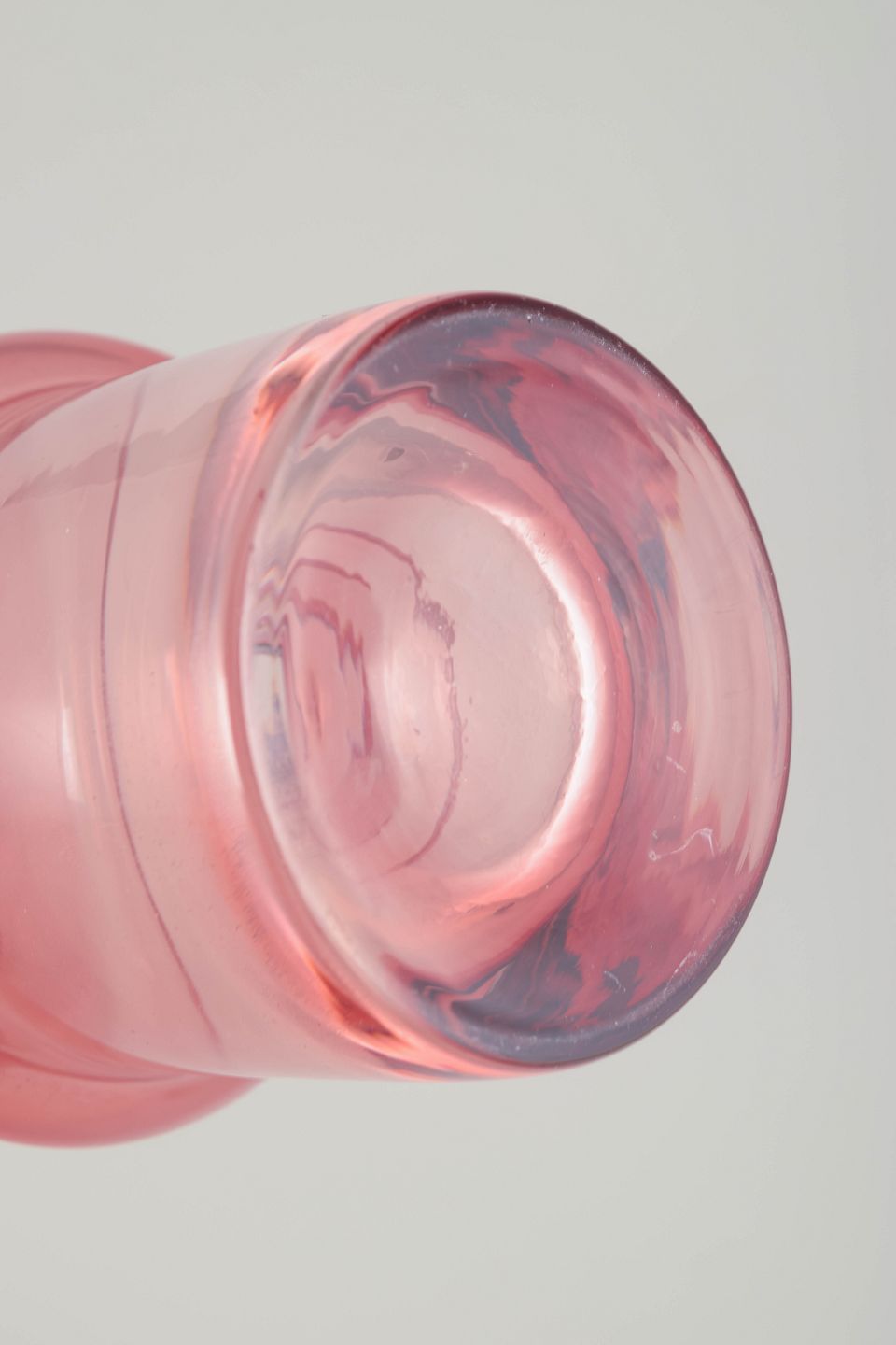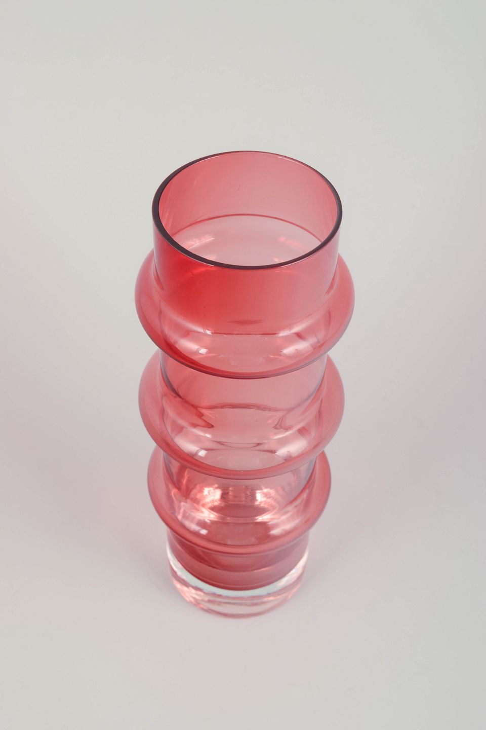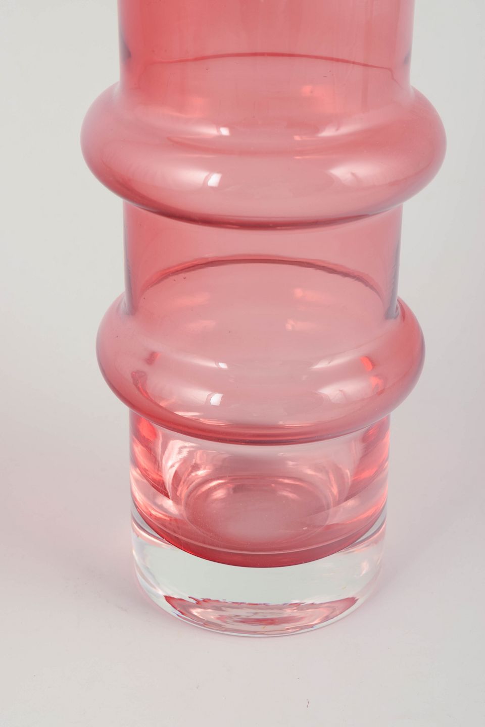 Høj, mundblæst vase i rosafarvet glas med klart fodparti og karakteristisk tredelt, skulpturel form – et klassisk eksempel på Bo Borgströms elegante og moderne formsprog for Åseda Glasbruk i 1970’erne.