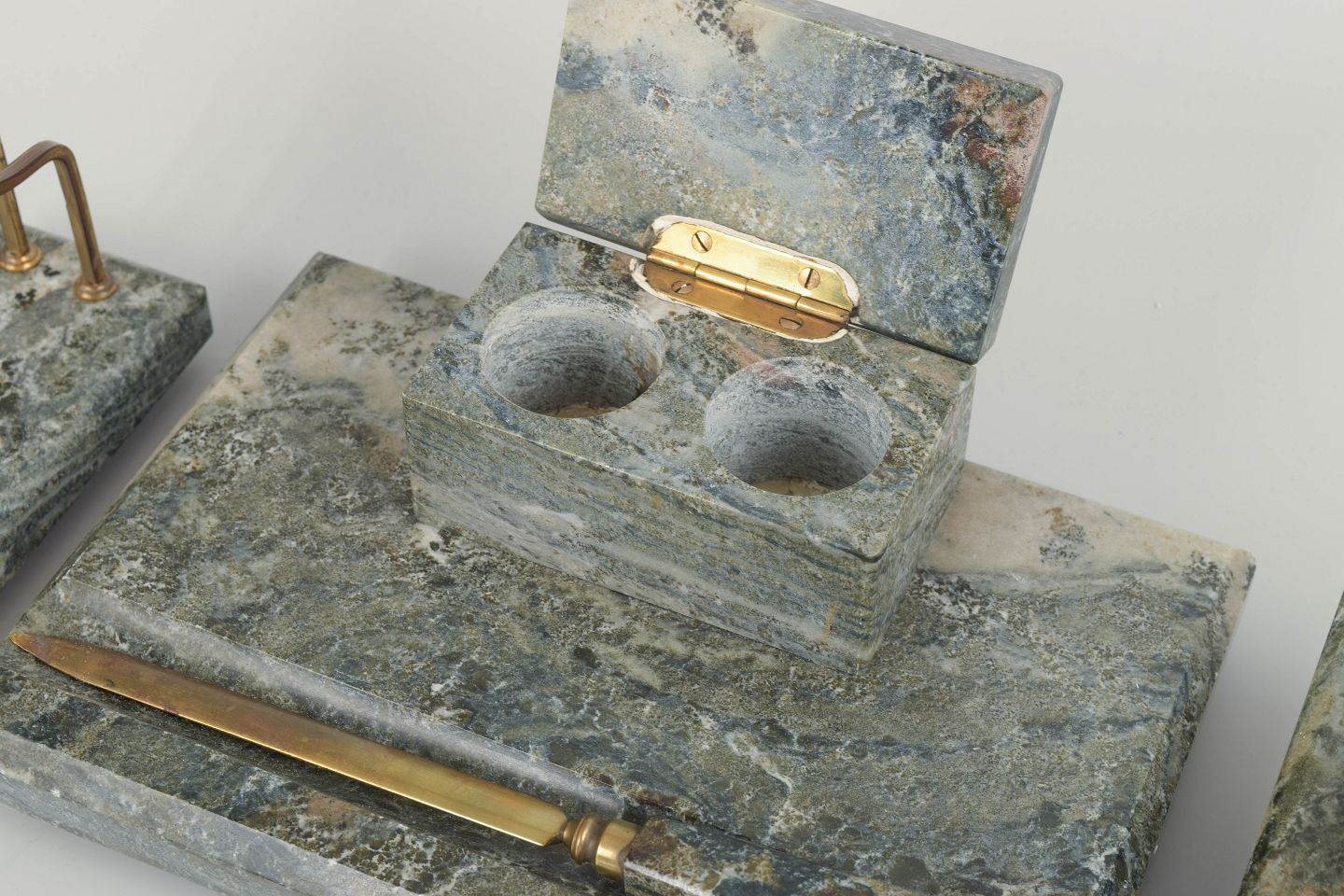 Svensk skrivebordssæt i marmor, midten af 1900-tallet.Elegant skrivebordssæt i grågrøn marmor bestående af brevholder, brevkniv, blækholder og blæksuger. Udført med messingdetaljer og karakteristisk skandinavisk modernistisk formsprog. Et funktionelt og dekorativt sæt, der vidner om tidens sans for ædle materialer og håndværksmæssig kvalitet.