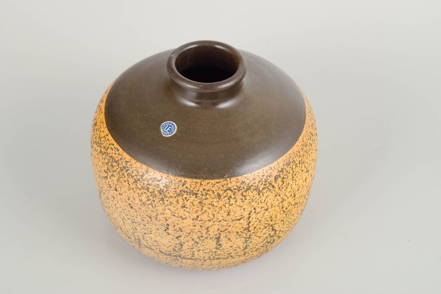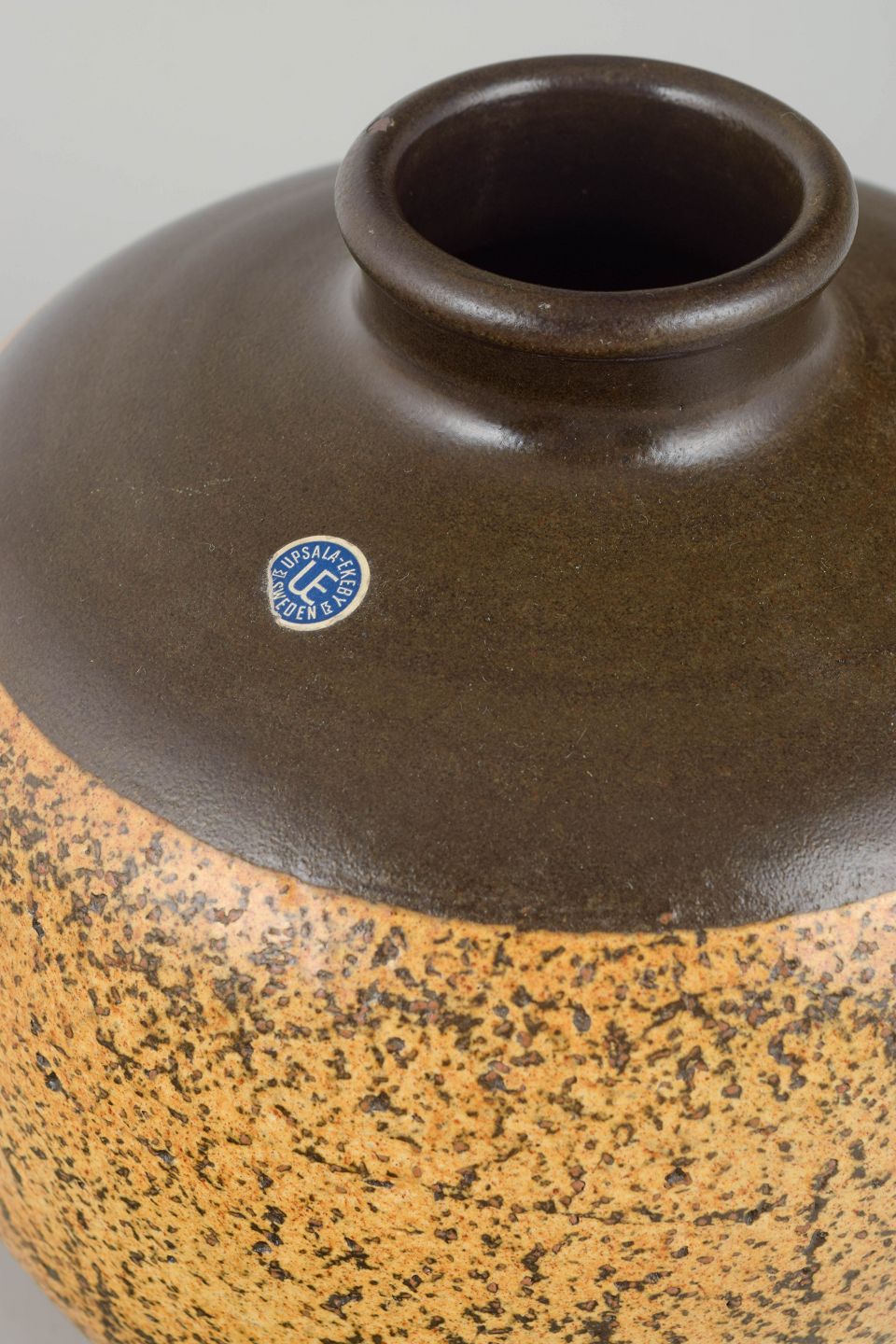 Monumental hånddrejet stentøjsvase med afrundet krop og lille hals, dækket af en karakteristisk gulbrun glasur med mørke, teksturelle spor, der skaber en levende, organisk overflade. Den øverste del i dyb brun kontrastglasur fremhæver formens harmoniske proportioner. Et fornemt eksempel på Anderssons arbejde for Upsala Ekeby i 1960’erne.