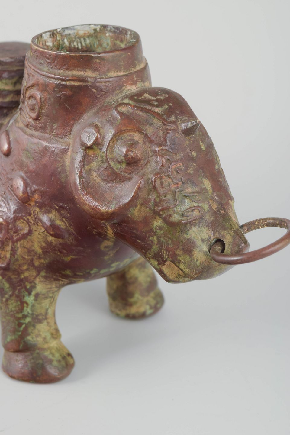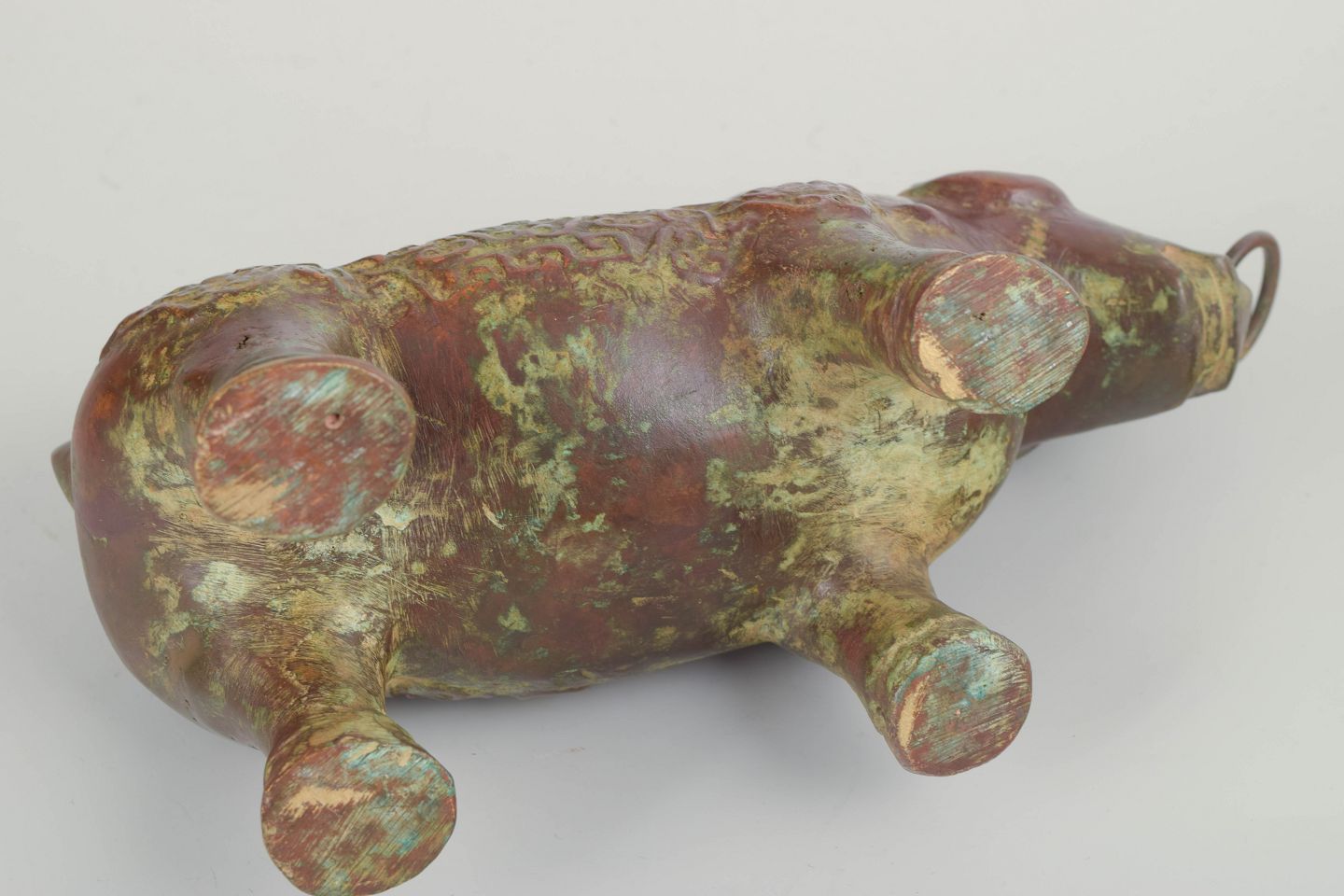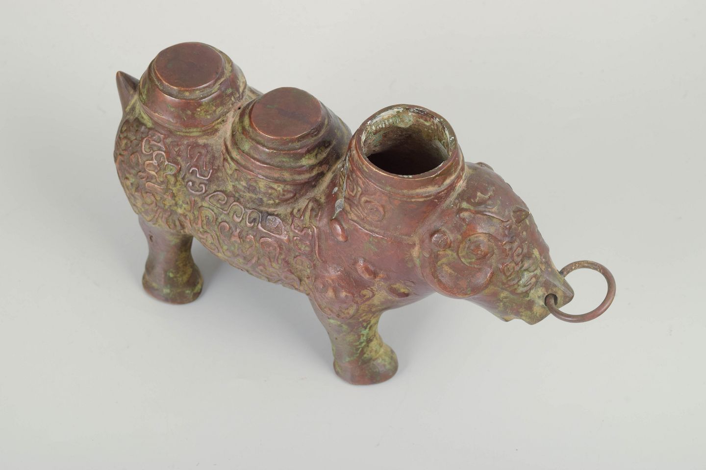 Kinesisk “Zun” vinbeholder, antik.Bronzeskulptur formet som et dyr, udført med rigt ornamenterede detaljer og smuk patinering i grønne og rødlige toner. Denne type “zun” blev traditionelt anvendt til vin i rituelle sammenhænge i det gamle Kina. Et fint eksempel på klassisk bronzekunst med markant form og historisk karakter.
