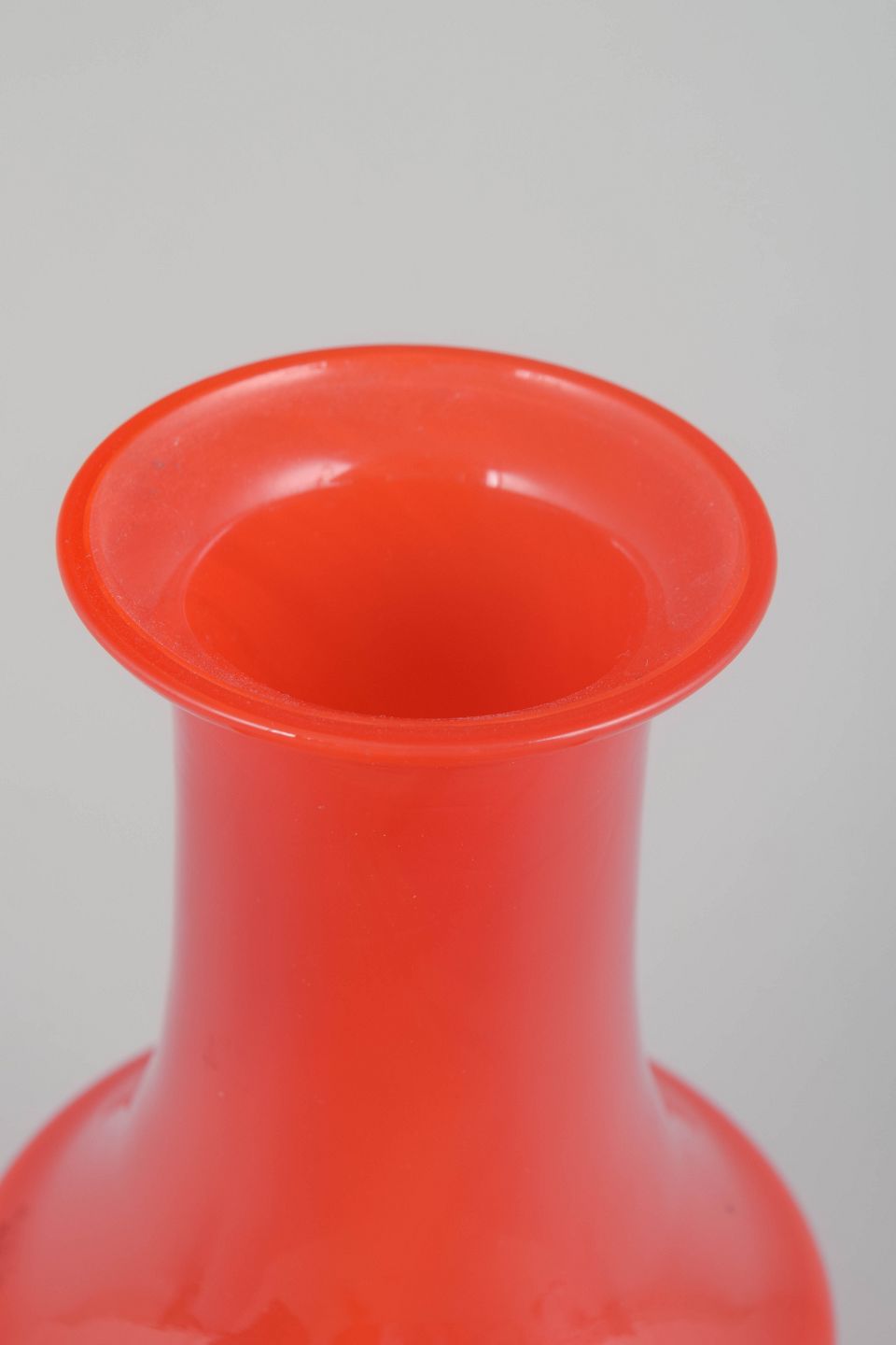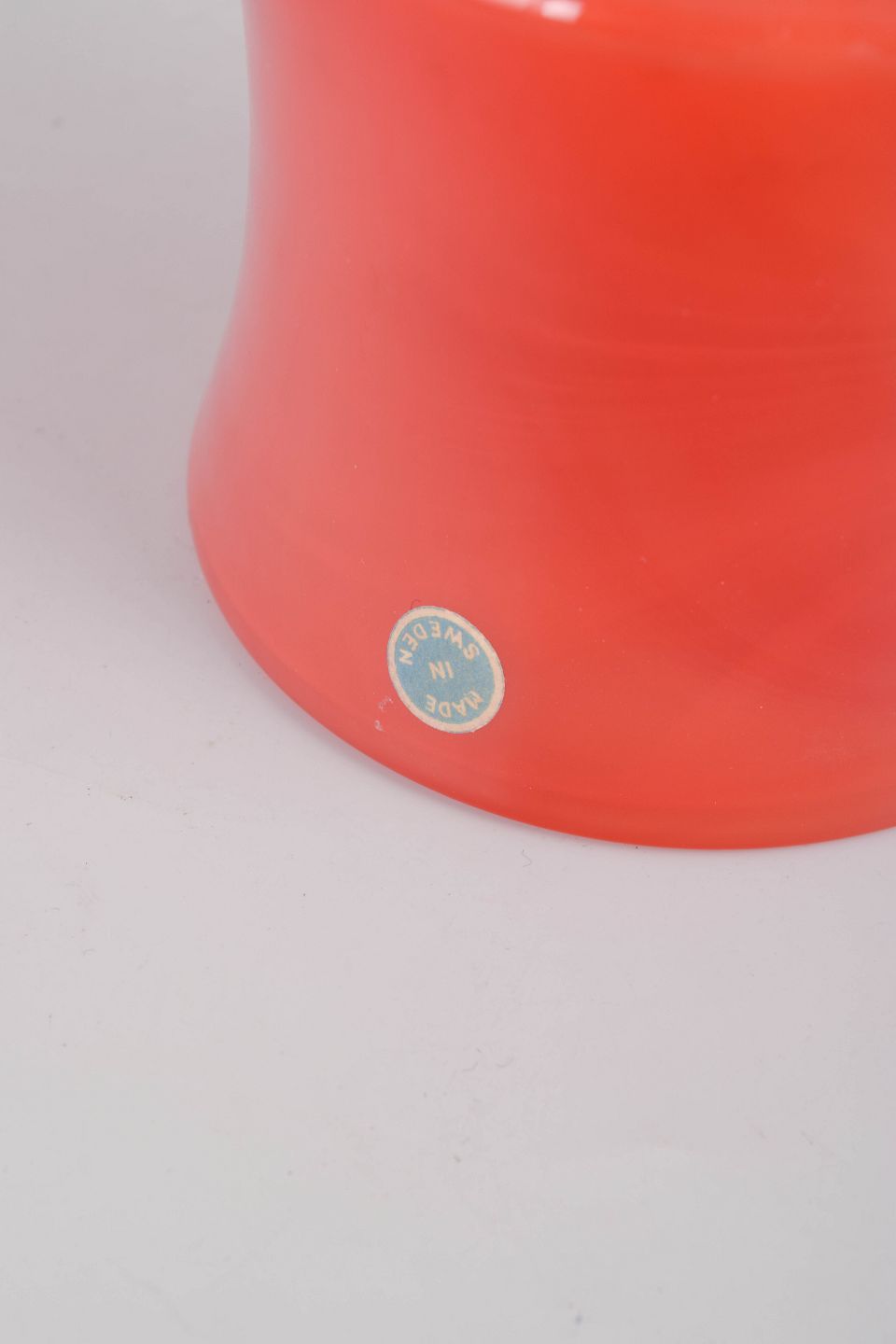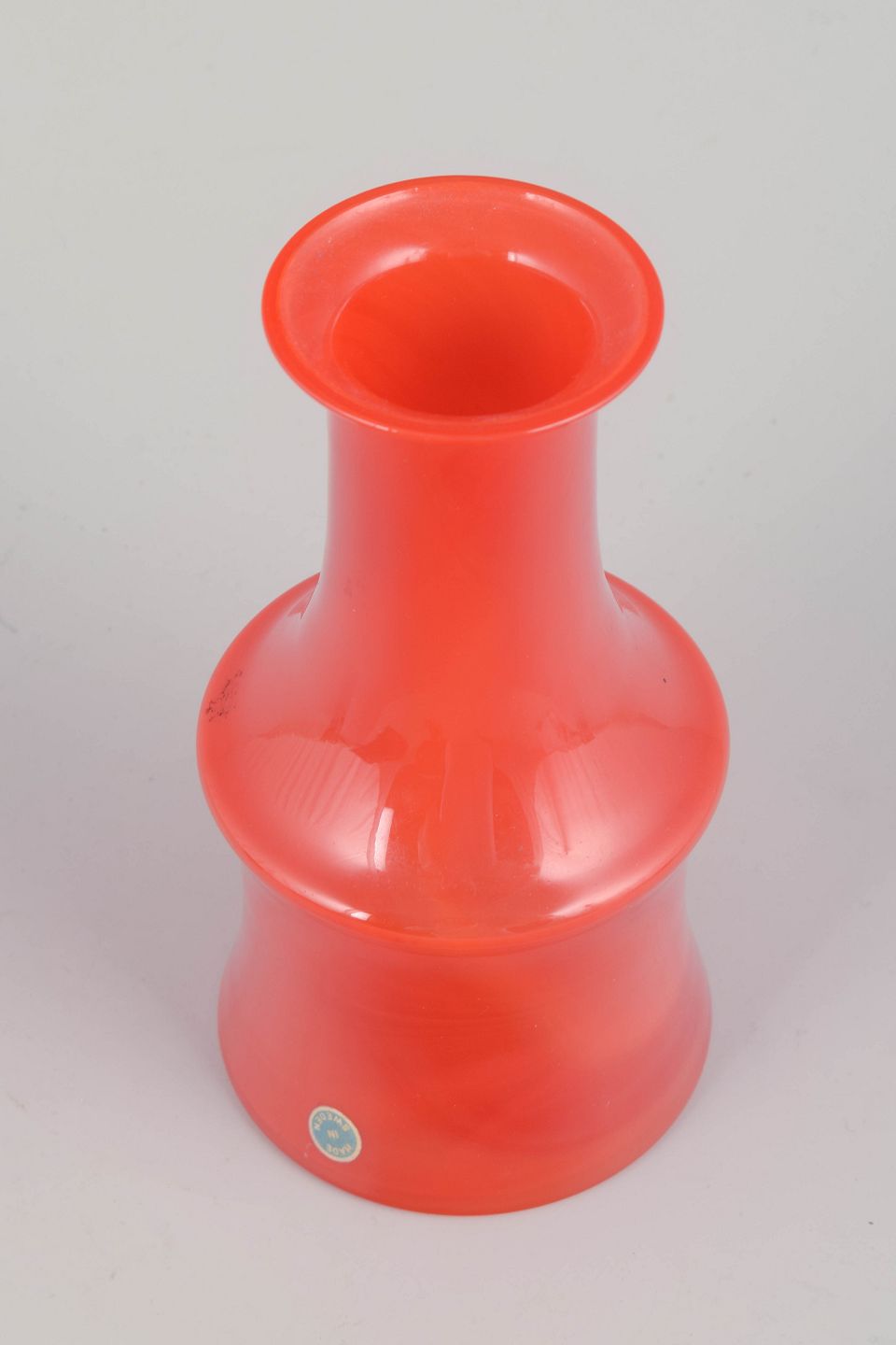Mundblæst vase i kraftig orange glas med elegant, cylindrisk form og udsvajet hals. Et karakteristisk eksempel på 70’ernes svenske glasdesign, hvor farveintensitet og formgivning smelter sammen i et tidstypisk udtryk.