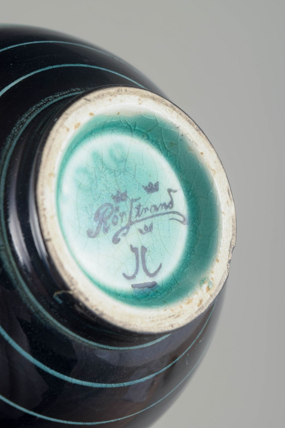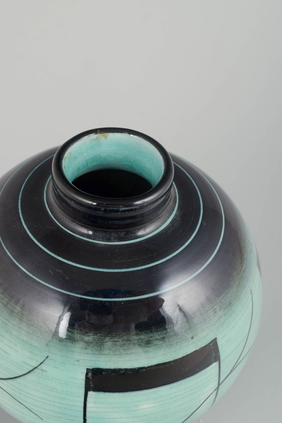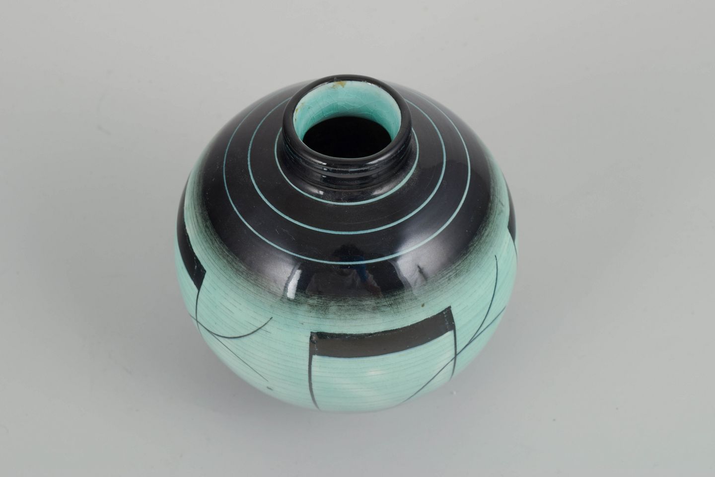 Art Deco vase i glaseret keramik med rund form, turkisgrøn og sort dekor i geometrisk mønster. Et elegant eksempel på 1930’ernes funktionalistiske formsprog hos Rörstrand.