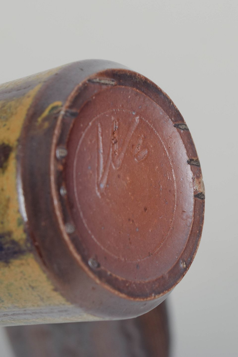 To hånddrejede miniaturevaser i stentøj med eksperimenterende glasurer i brune, grønne og gyldne toner. Et elegant eksempel på svensk studiokeramik med raffinerede proportioner og levende glasurspil.