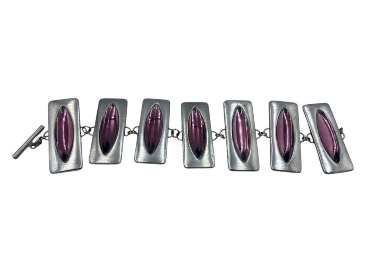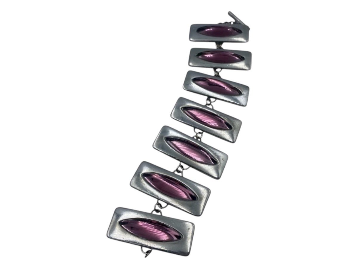 Jørgen Jensen Tin, meget bredt armbånd med lilla glassten.Ustemplet men det designnummeret er 230.