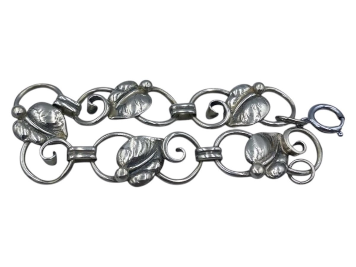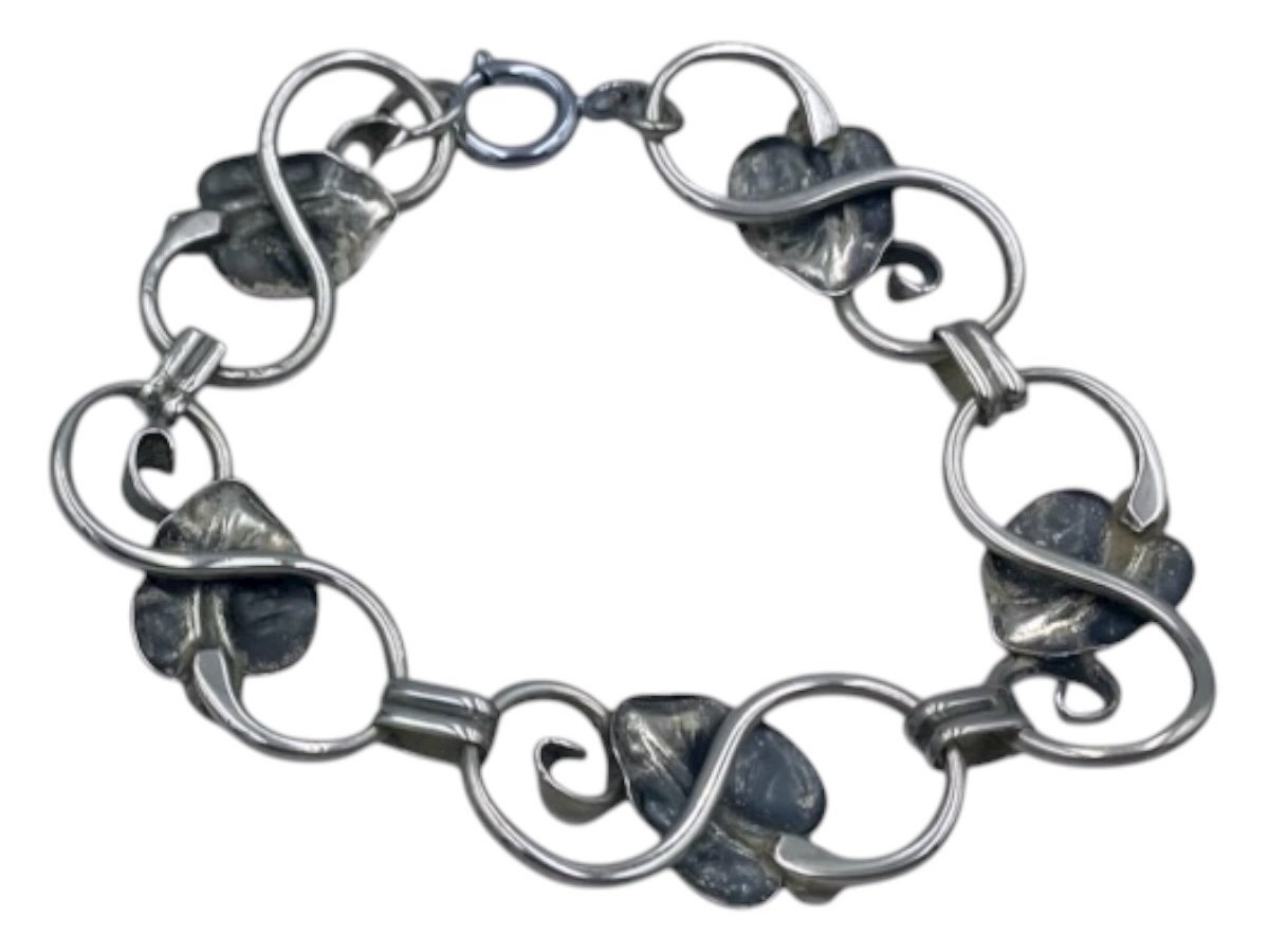 Sølv armbånd med blade fra ca. 1940 til 1960.Et led er formentlig taget af, hvor sølvstemplet har været, så armbåndet er ustemplet, men det er sølv.