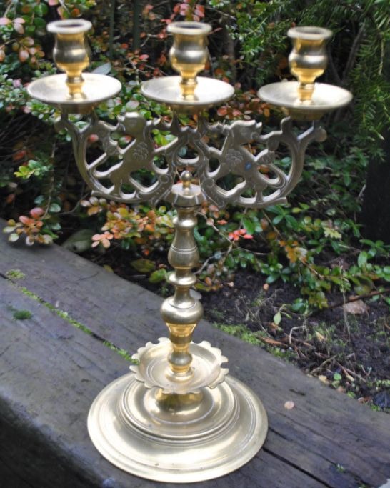 Großer, dreiarmiger Kerzenleuchter aus Messing, 20. Jahrhundert. Dänemark. Mit Löwenverzierungen. Nachbildung eines Kerzenleuchters aus dem 18. Jahrhundert. Höhe: 38 cm. Breite: 25 cm.Bestellnummer: 28515