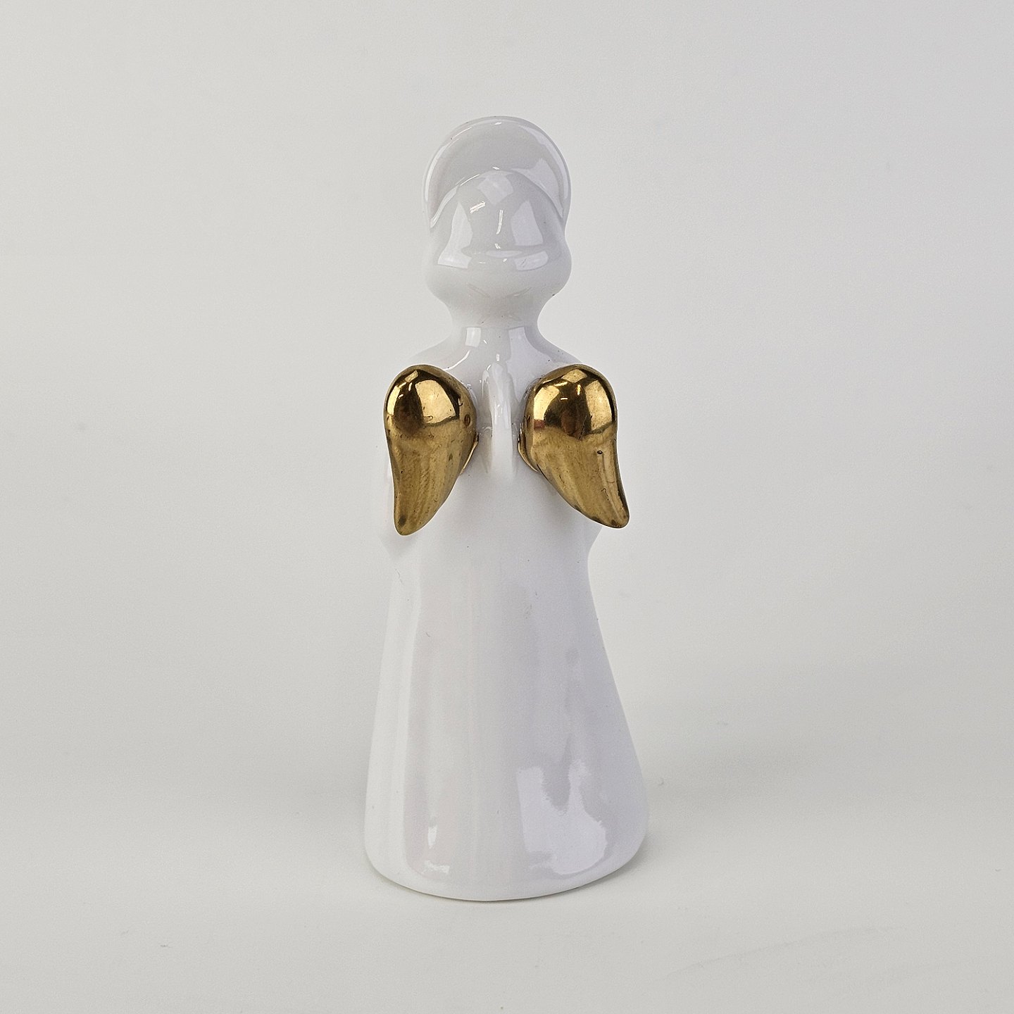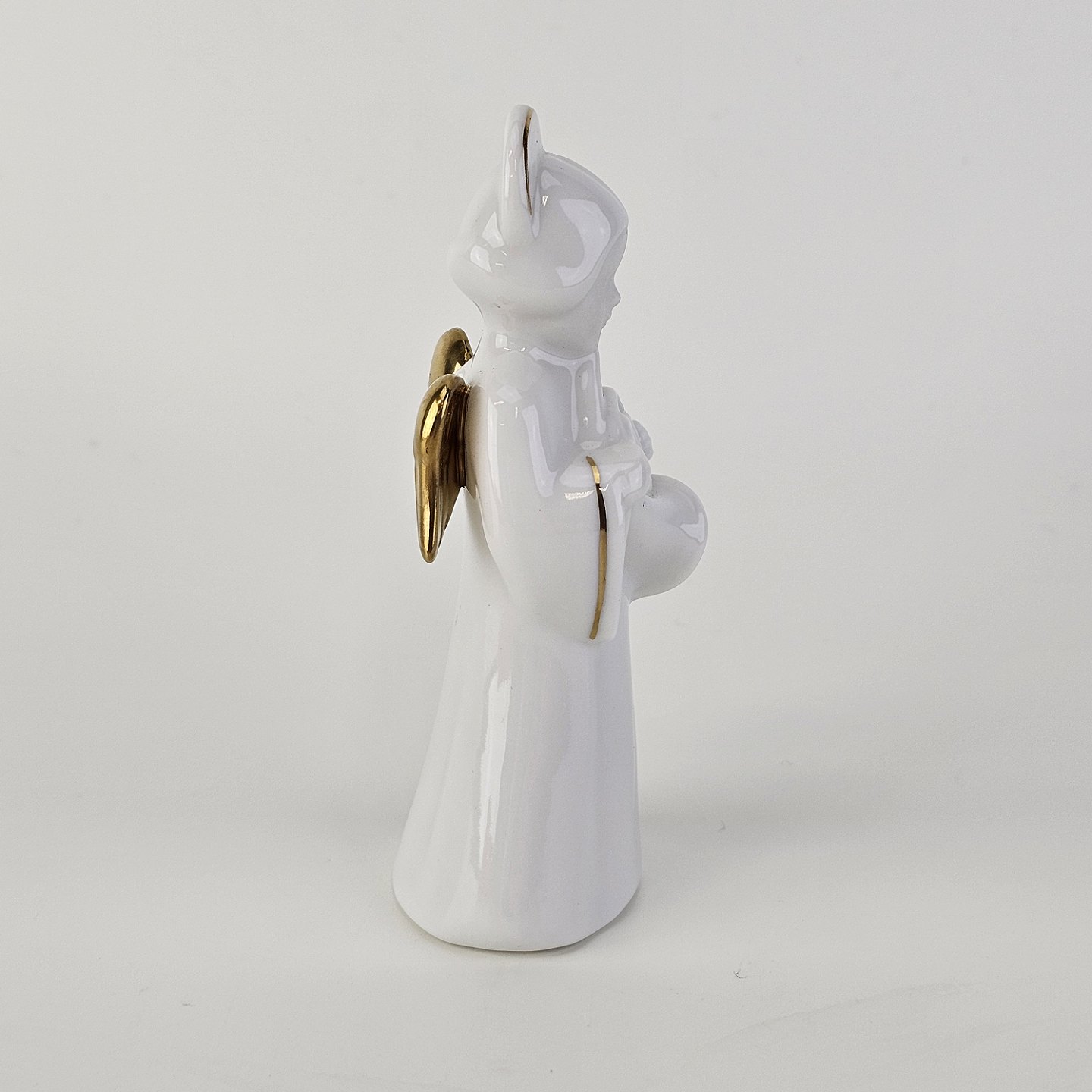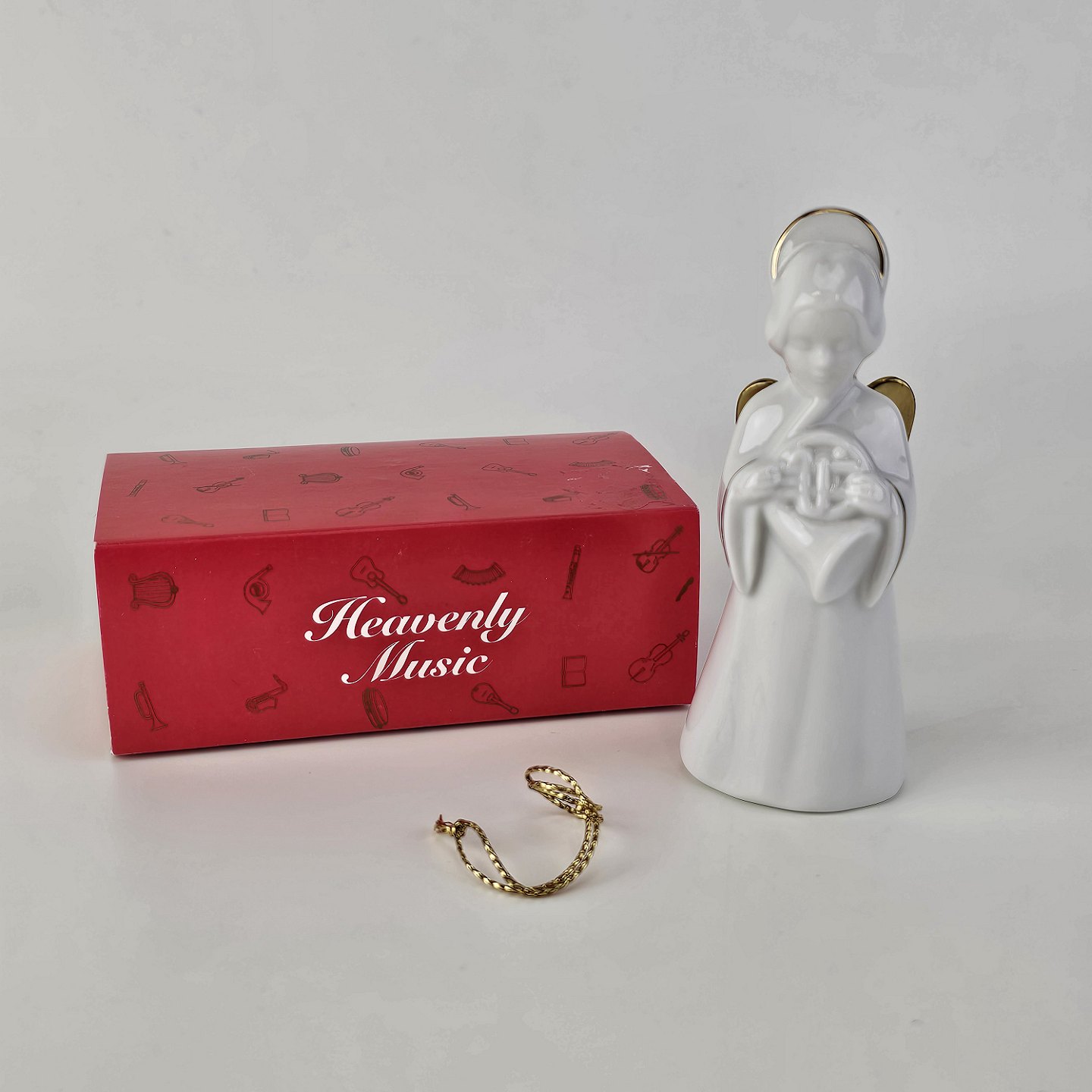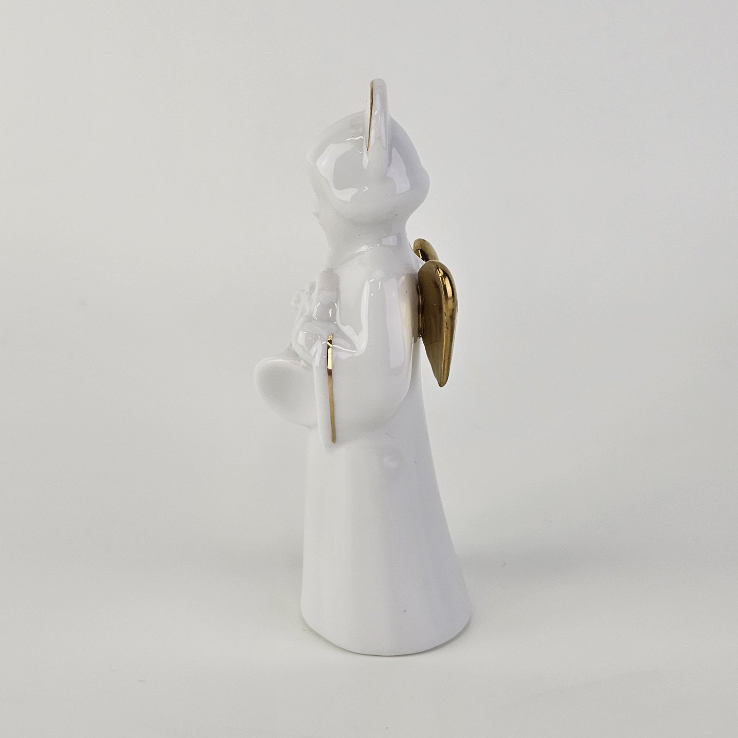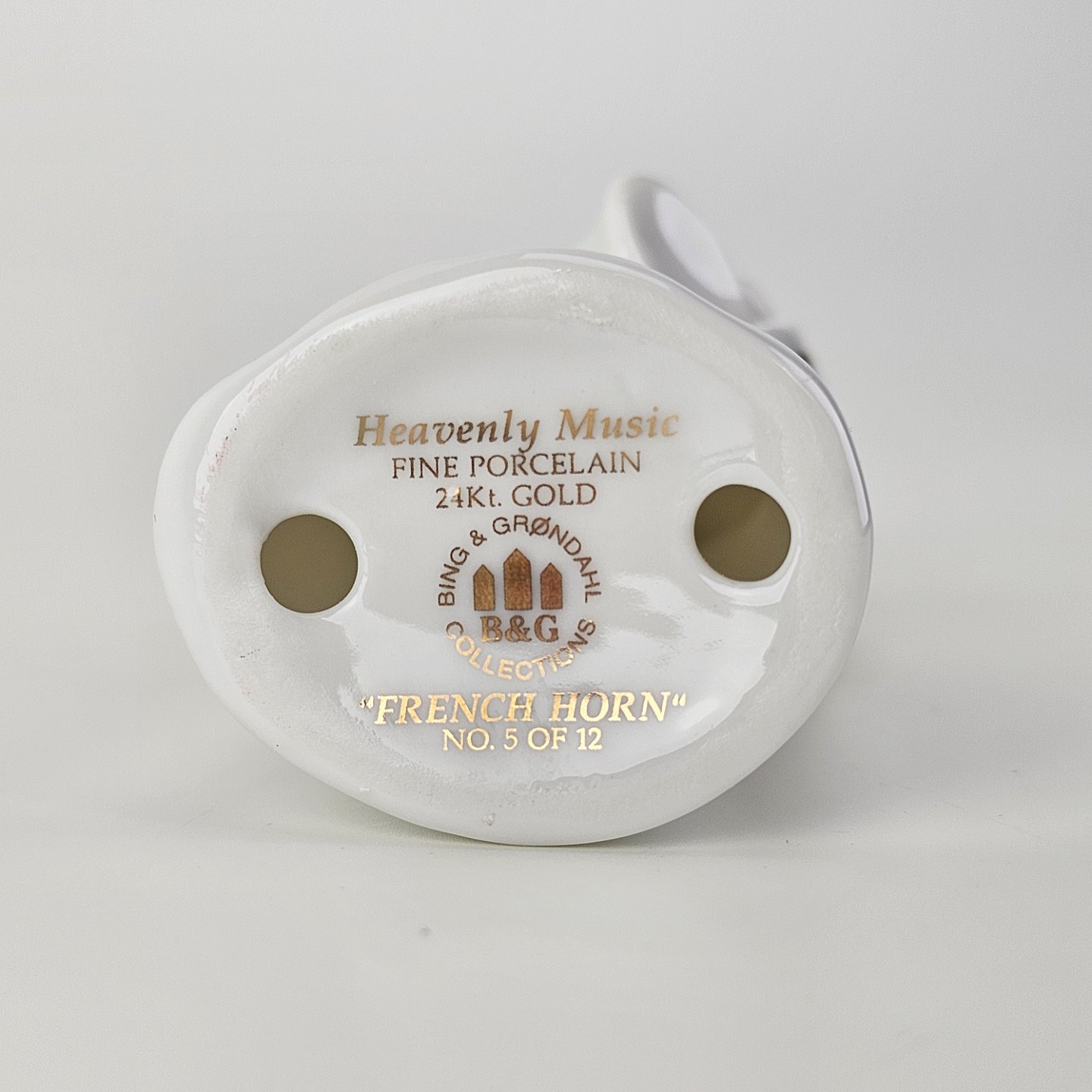 Figur med motiv af en engel som spiller på valdhorn. Figuren er i hvidt porcelæn med forgyldte vinger og detaljer i 24 karat guld. 5 af 12 i serien Heavenly Music med titlen French Horn